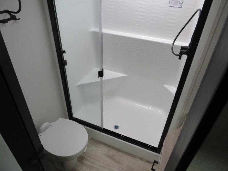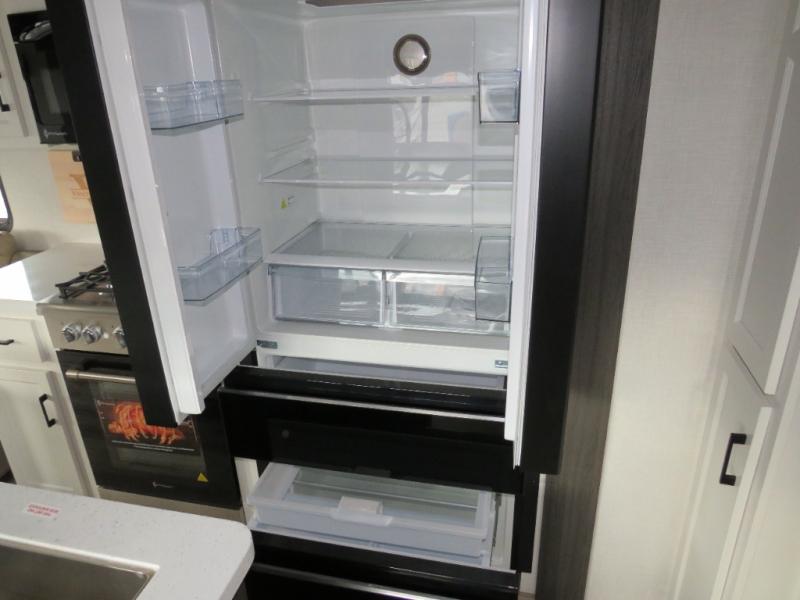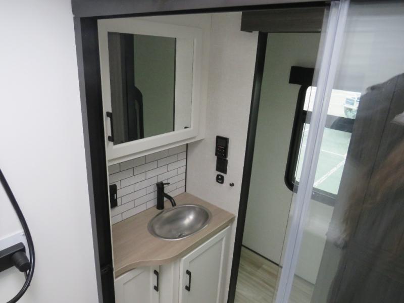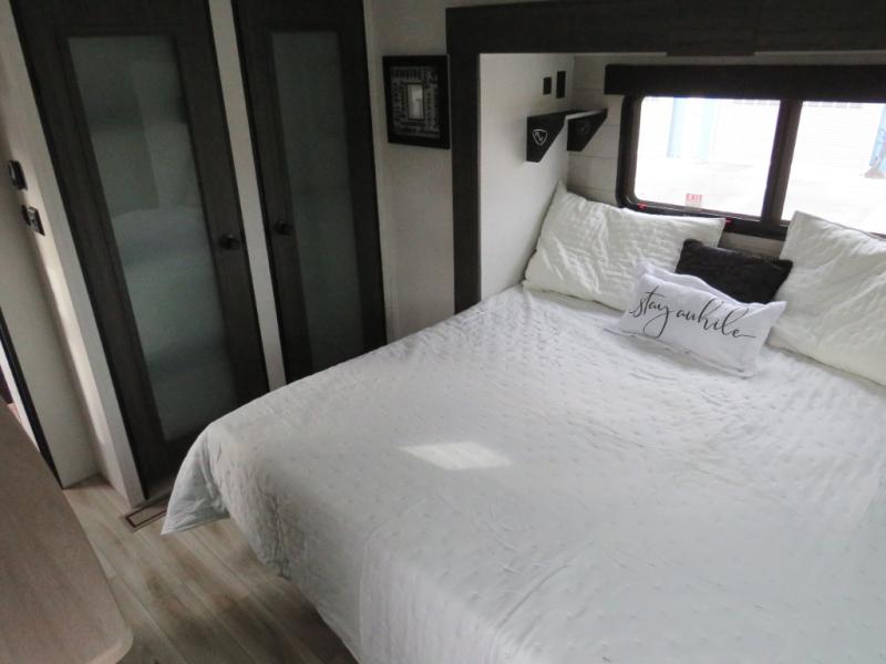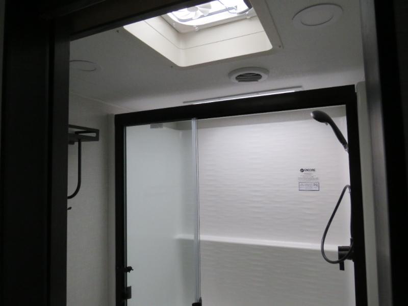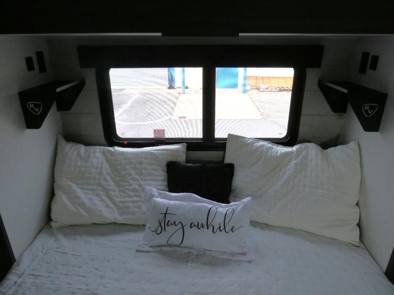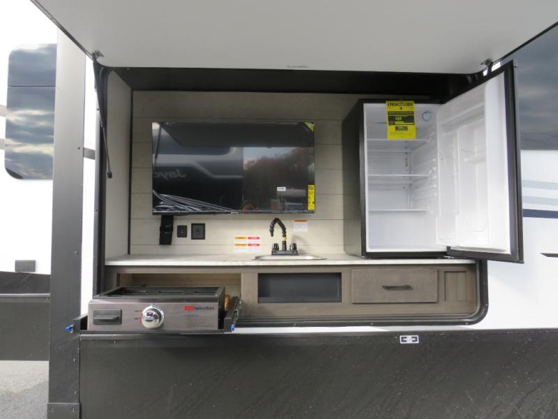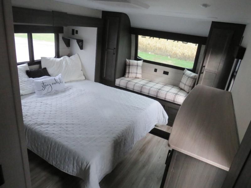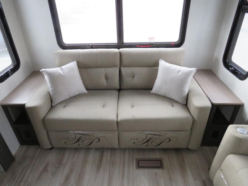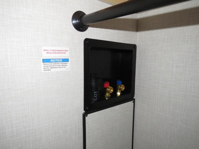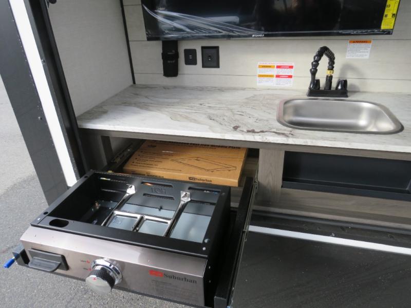 You won't even feel like you're camping in this fifth wheel! The front private bedroom has a Serta king mattress to lay your head on at night, a window seat to comfortably read a book while enjoying the 5,000 BTU fireplace, a shelf storage closet, and a prepped area for a washer and dryer. Freshen up each morning with the 48" fiberglass shower in the full bathroom then head down the floating steps with shoe storage to whip up a delicious breakfast. The fully equipped kitchen even comes with a 18" GE stainless steel dishwasher at the kitchen island for easy clean up. Enjoy your meals at the table with two chairs and two Versa benches. You could even cook at the outside campfire cafe with the griddle. Inside the rear living area, you will find a 70" tri-fold sofa with end tables and theater seating with USB charging across from the entertainment center with a 5,000 BTU fireplace!