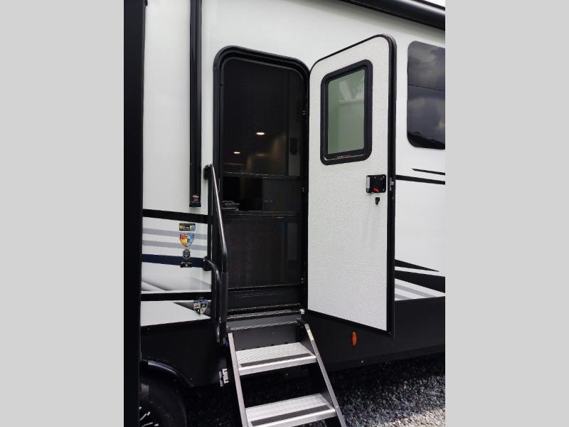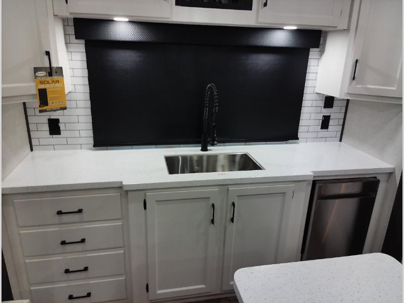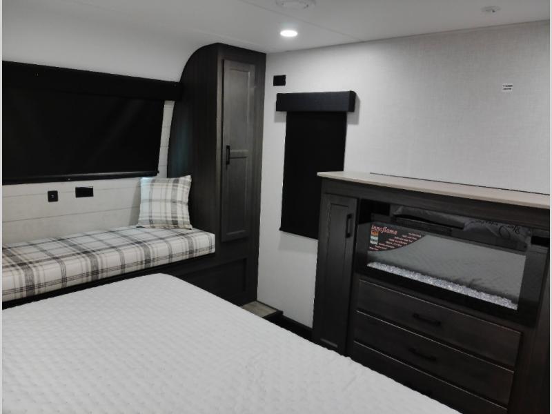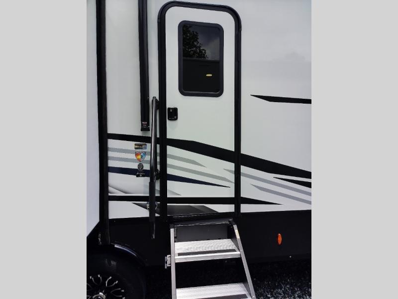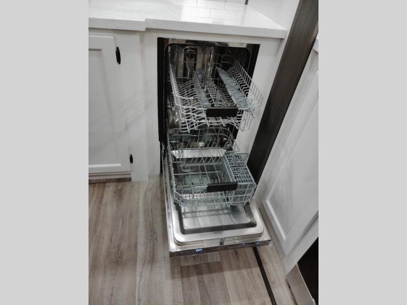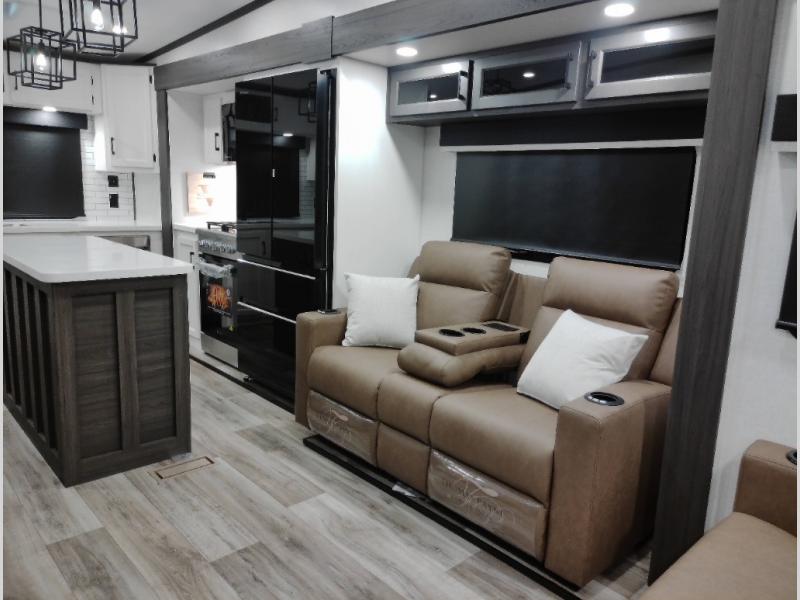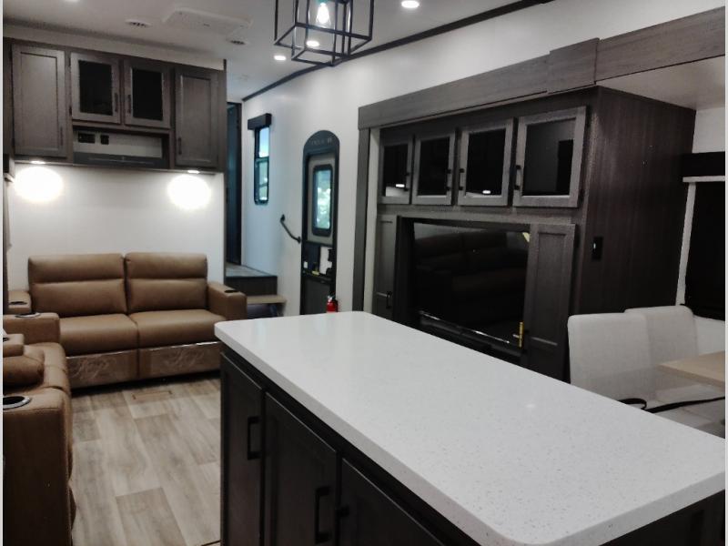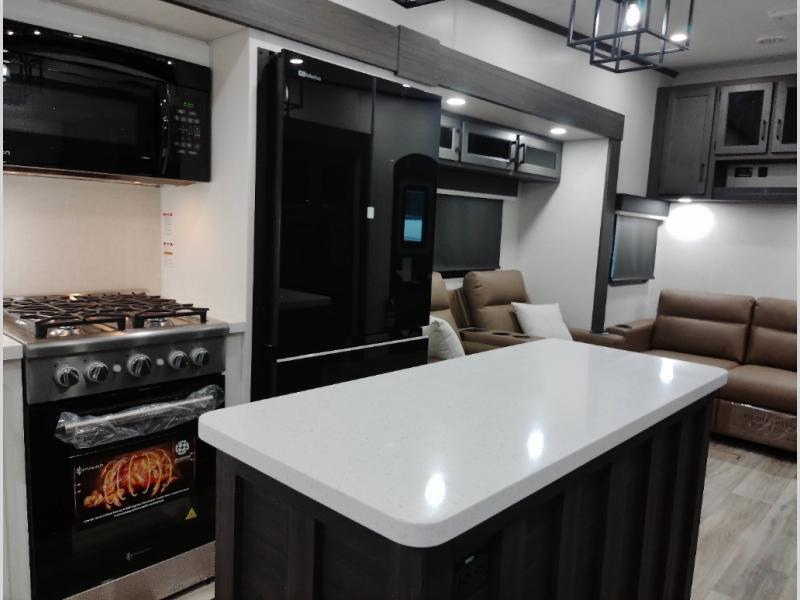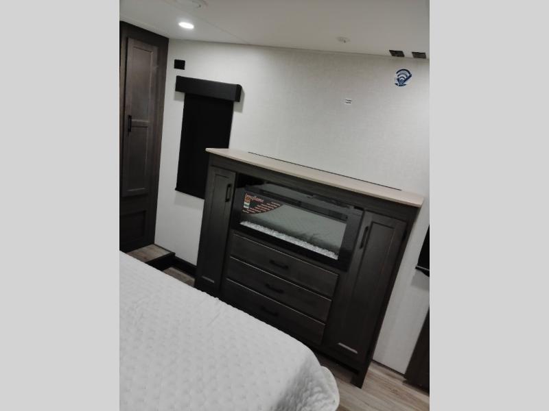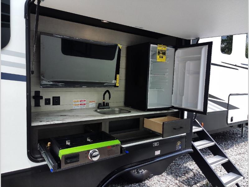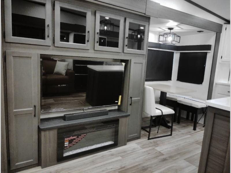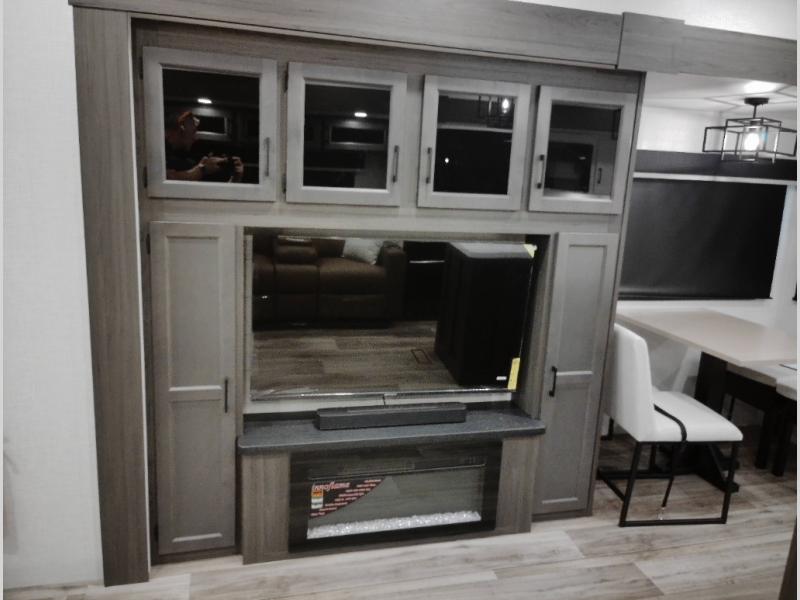 The chef will love cooking in the rear kitchen of this fifth wheel! The front private bedroom has a Serta king mattress to lay your head on at night, a window seat to comfortably read a book while enjoying the 5,000 BTU fireplace, a shelf storage closet, and a prepped area for a washer and dryer. Freshen up each morning with the 48" fiberglass shower with a seat in the full bathroom then head down the floating steps with shoe storage to whip up a delicious breakfast. The fully equipped kitchen even comes with a 18" GE stainless steel dishwasher at the rear sink with countertops on either side for easy clean up. Enjoy your meals at the table with two chairs and two Versa benches. You could even cook at the outside campfire cafe with the griddle. Inside the middle living area, you will find a tri-fold sofa with overhead cabinets and theater seating with USB charging across from the entertainment center with a 5,000 BTU fireplace!