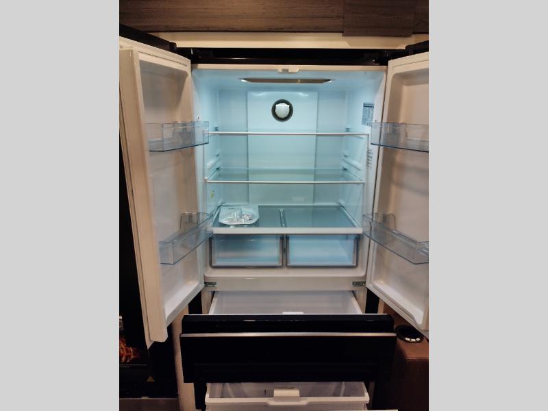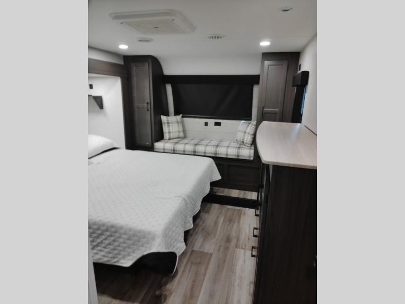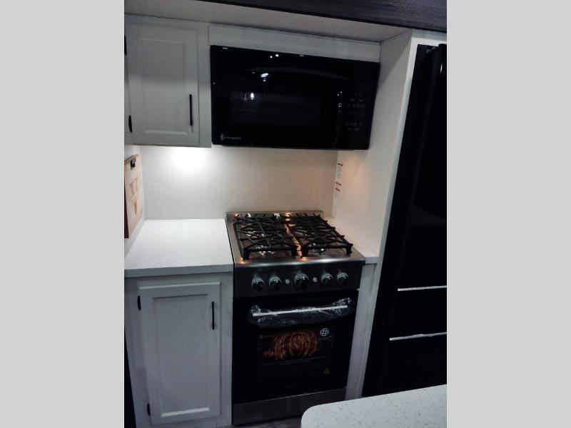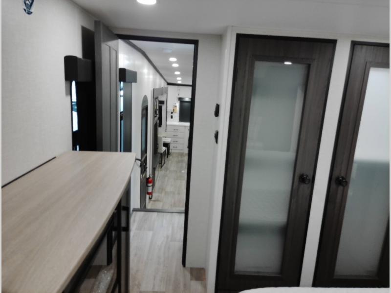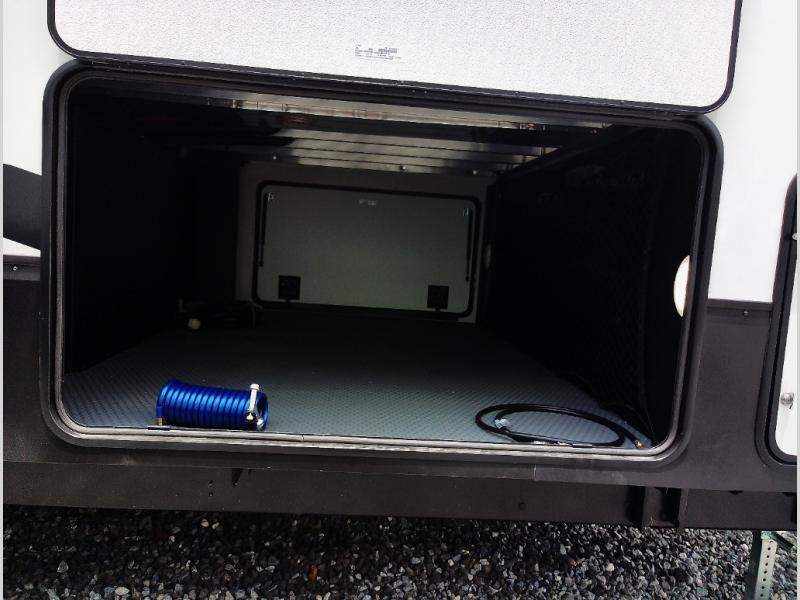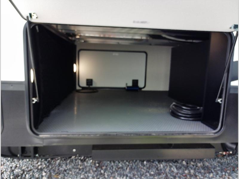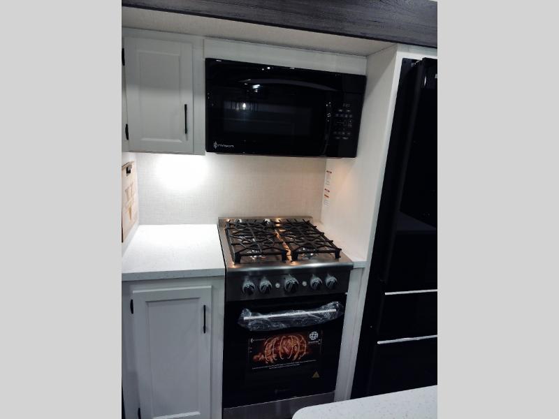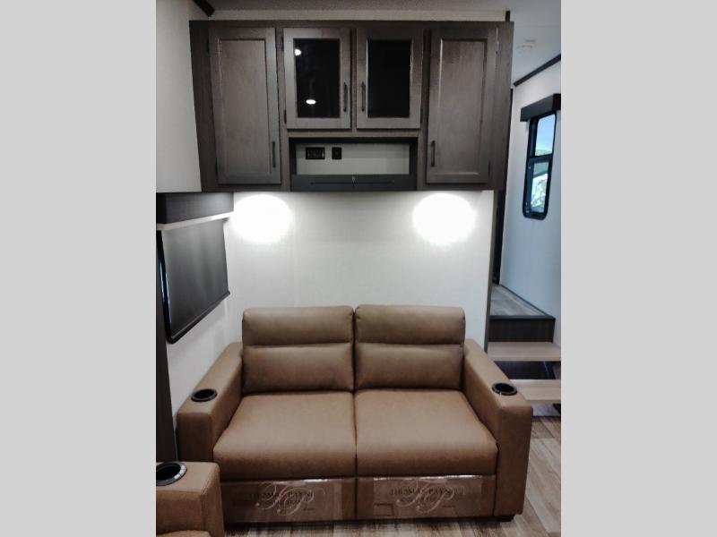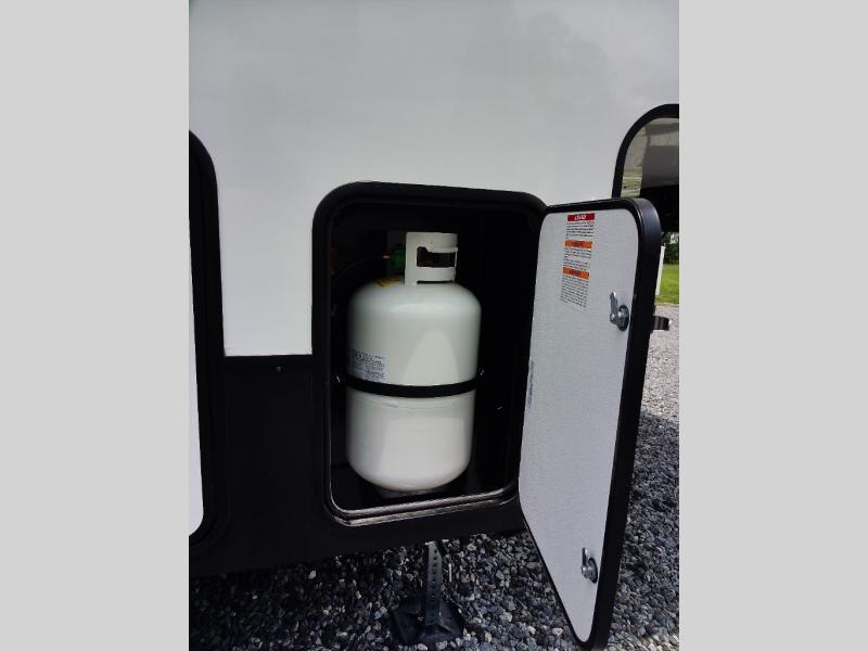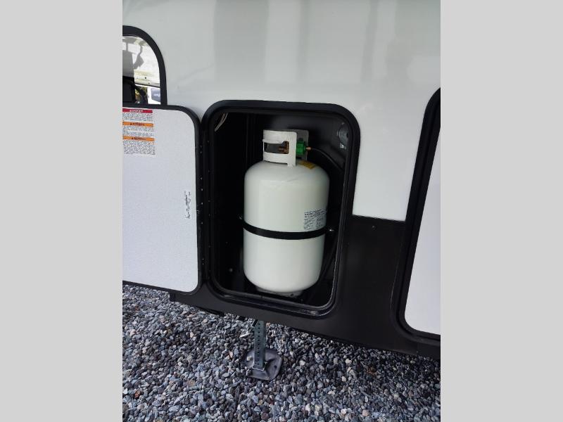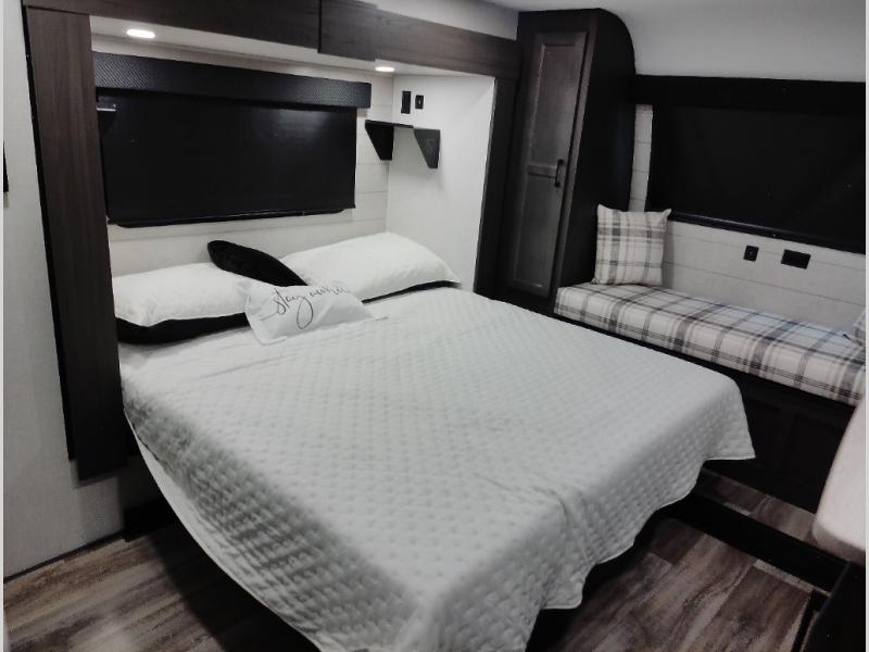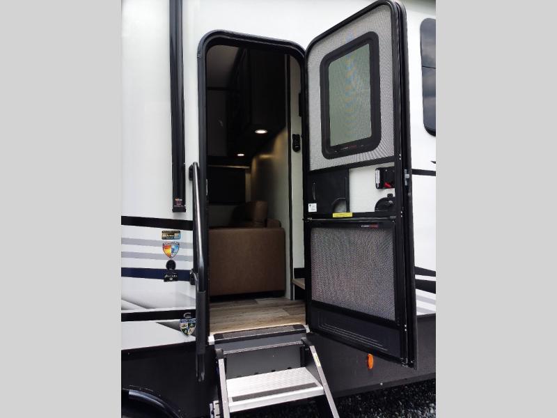 The chef will love cooking in the rear kitchen of this fifth wheel! The front private bedroom has a Serta king mattress to lay your head on at night, a window seat to comfortably read a book while enjoying the 5,000 BTU fireplace, a shelf storage closet, and a prepped area for a washer and dryer. Freshen up each morning with the 48" fiberglass shower with a seat in the full bathroom then head down the floating steps with shoe storage to whip up a delicious breakfast. The fully equipped kitchen even comes with a 18" GE stainless steel dishwasher at the rear sink with countertops on either side for easy clean up. Enjoy your meals at the table with two chairs and two Versa benches. You could even cook at the outside campfire cafe with the griddle. Inside the middle living area, you will find a tri-fold sofa with overhead cabinets and theater seating with USB charging across from the entertainment center with a 5,000 BTU fireplace!