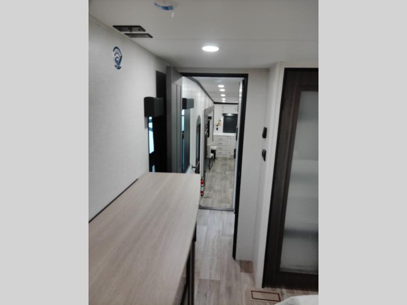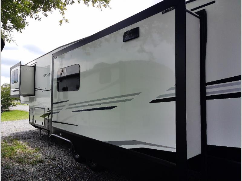 An elegant design and new features come with every one of these Venture RV SportTrek Touring Edition fifth wheels! The NXG Huck bolt frame holds these units together and Tufflex PVC roofing covers them. Heads will turn down the highway and at the campsite with the frameless tinted windows and high gloss fiberglass front cap with automotive paint. The exterior pass-through storage area has slam latch baggage doors with magnetic catches so you don't have to worry about them closing on you and LED lighting on the electric awning so you can see clearly even at night. Luxury abounds throughout these units, especially with the two fireplaces, solid surface kitchen countertops, blackout roller shades, and maximum storage designs. Come find your favorite model today!