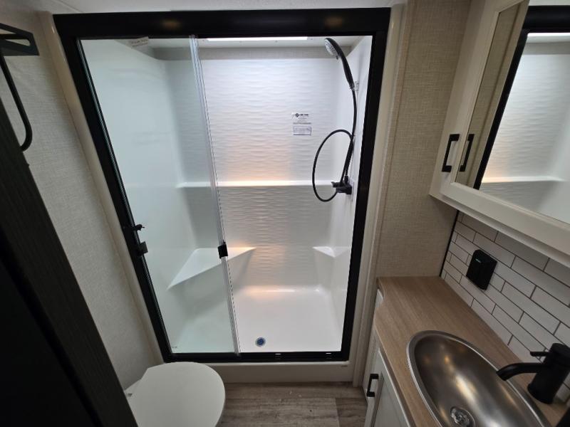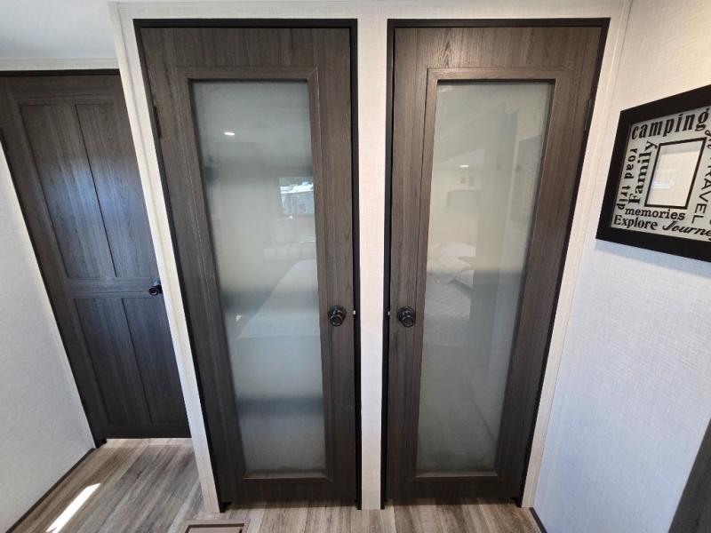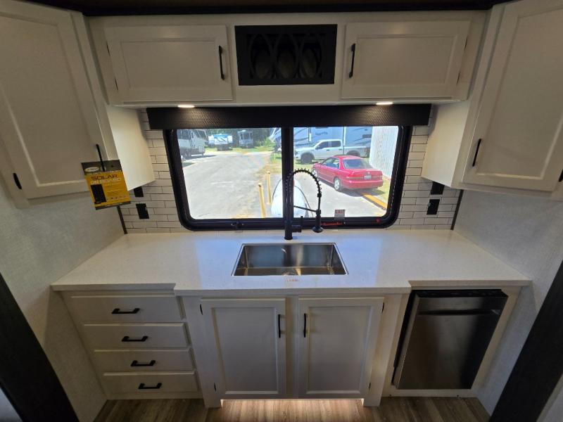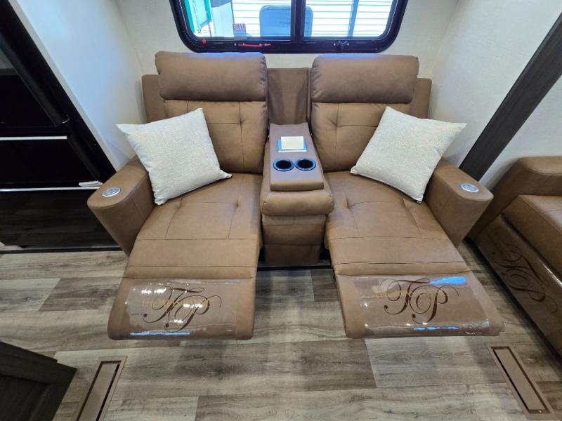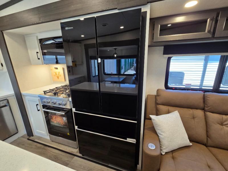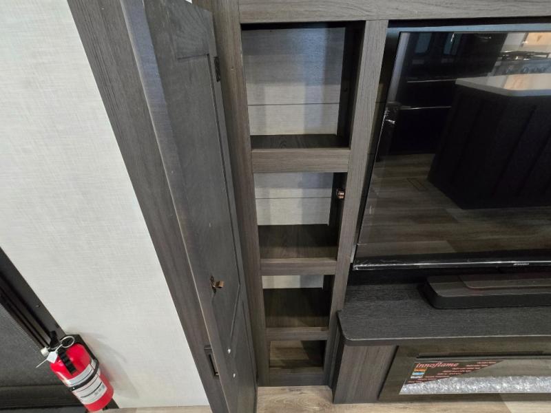 This fifth wheel is the perfect blend of sophistication and practicality, delivering the comforts of home wherever you roam. From the stunning rear kitchen and double fireplaces to the premium Serta king bed and outdoor Campfire Café, every feature has been thoughtfully crafted for travelers who demand luxury and convenience.