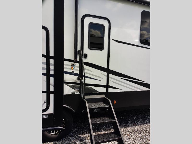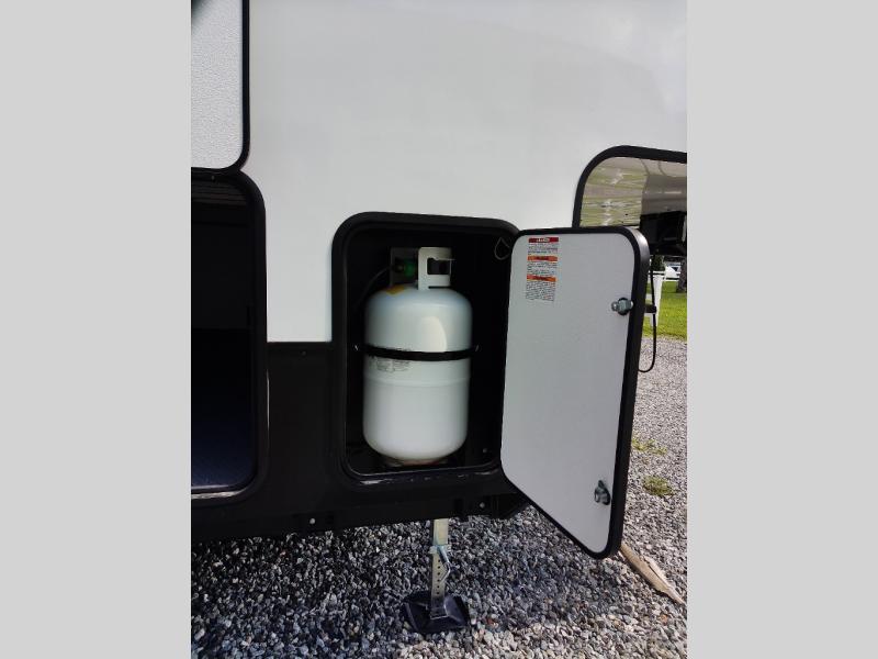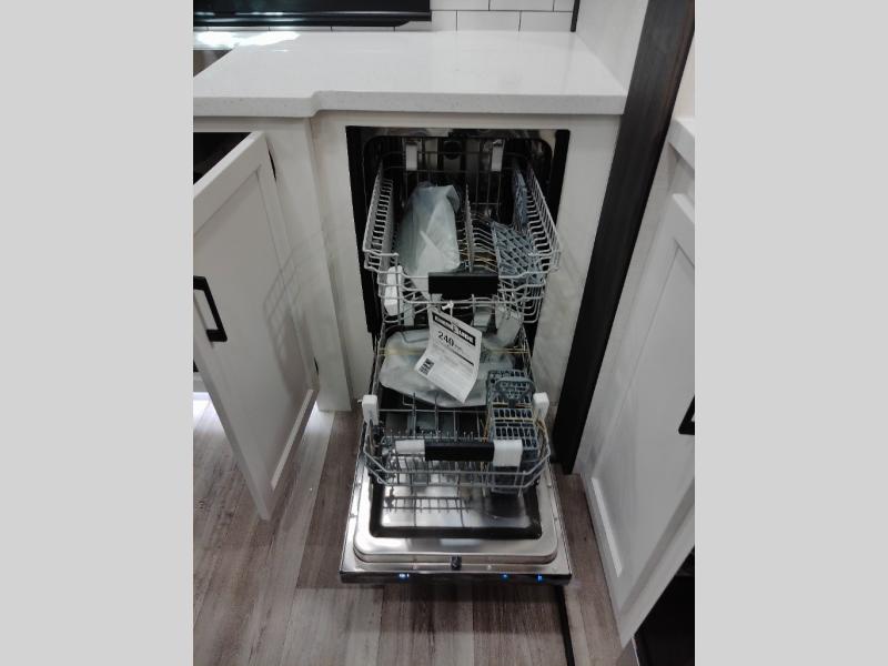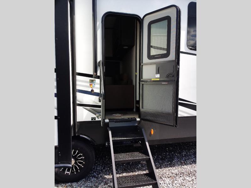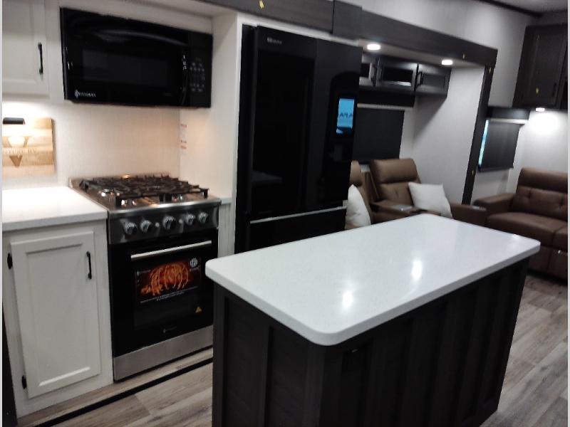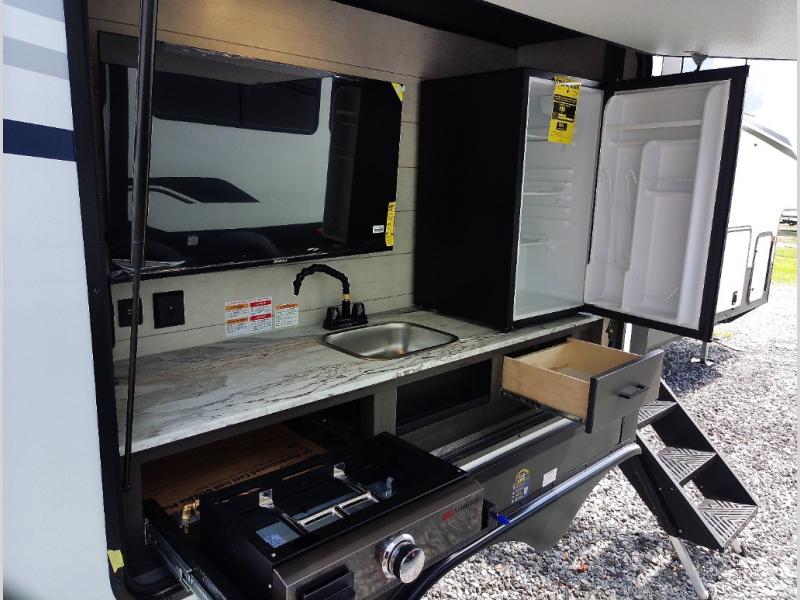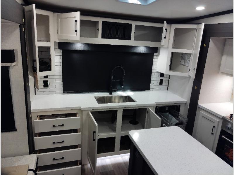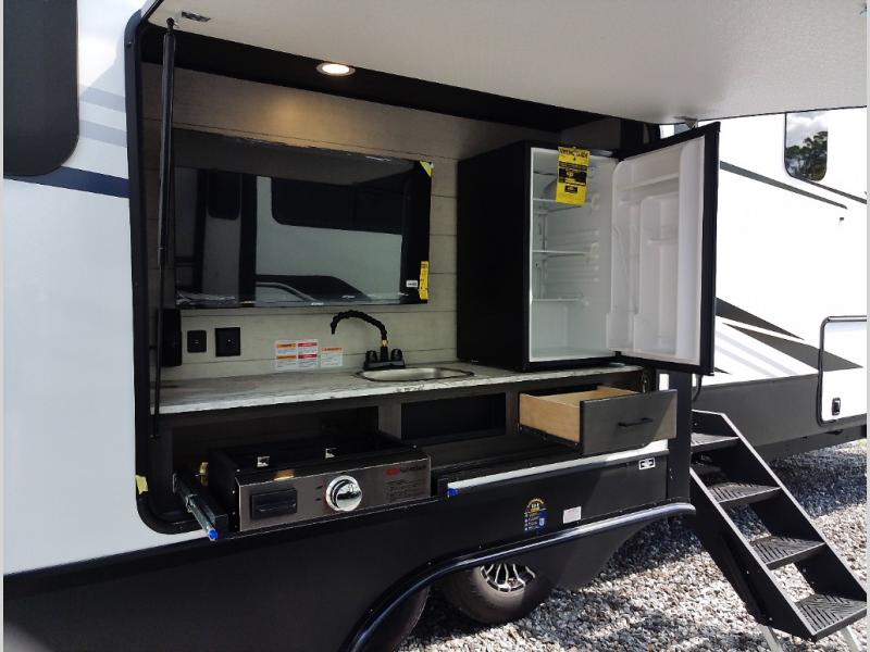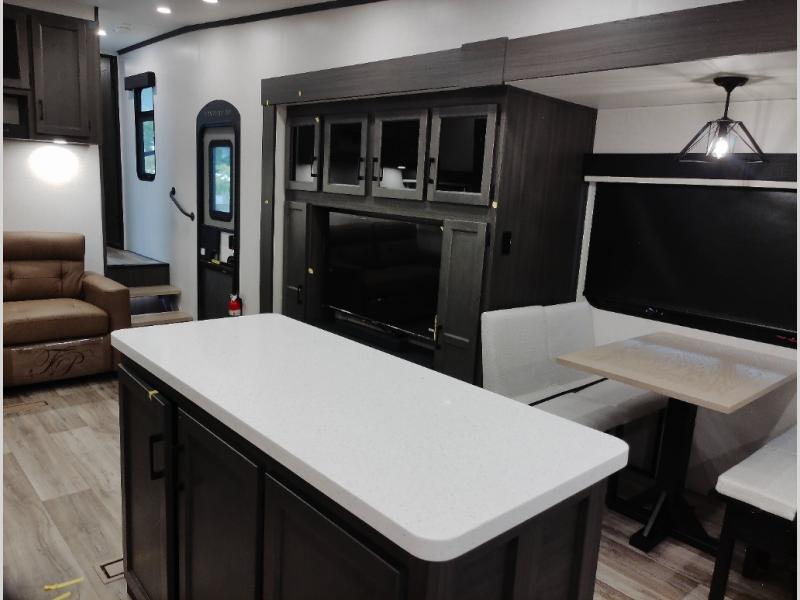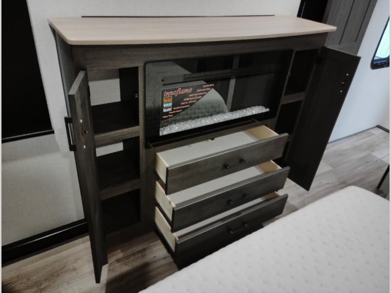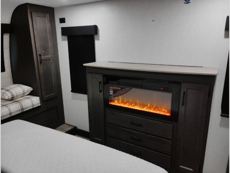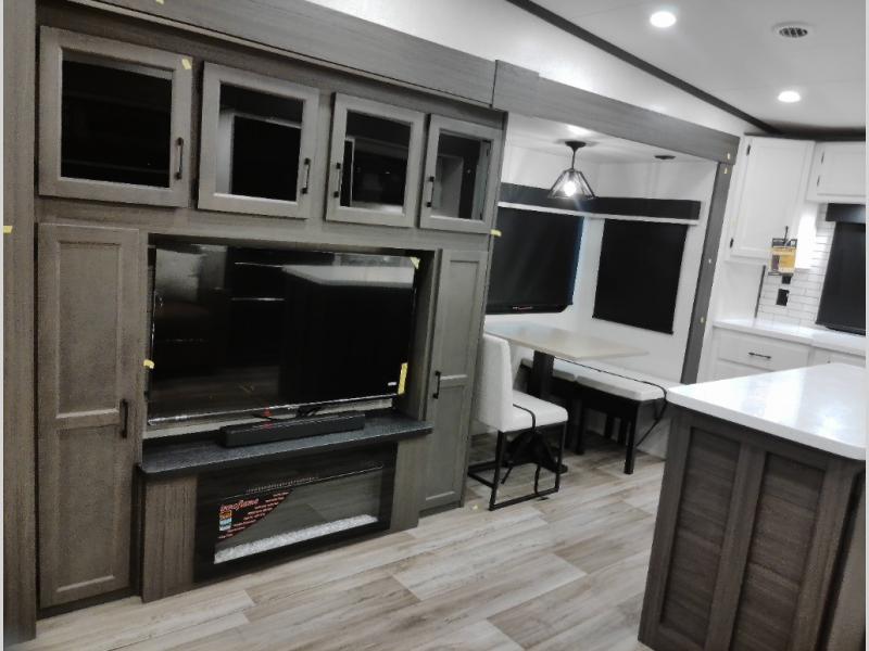 The chef will love cooking in the rear kitchen of this fifth wheel! The front private bedroom has a Serta king mattress to lay your head on at night, a window seat to comfortably read a book while enjoying the 5,000 BTU fireplace, a shelf storage closet, and a prepped area for a washer and dryer. Freshen up each morning with the 48" fiberglass shower with a seat in the full bathroom then head down the floating steps with shoe storage to whip up a delicious breakfast. The fully equipped kitchen even comes with a 18" GE stainless steel dishwasher at the rear sink with countertops on either side for easy clean up. Enjoy your meals at the table with two chairs and two Versa benches. You could even cook at the outside campfire cafe with the griddle. Inside the middle living area, you will find a tri-fold sofa with overhead cabinets and theater seating with USB charging across from the entertainment center with a 5,000 BTU fireplace!