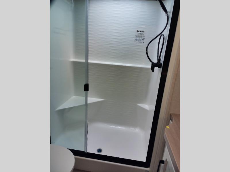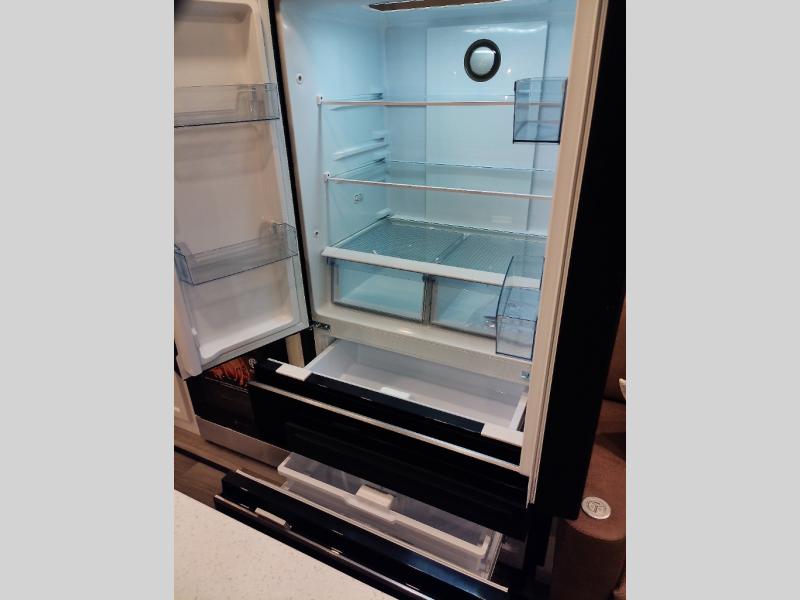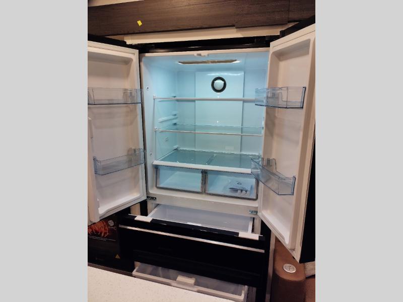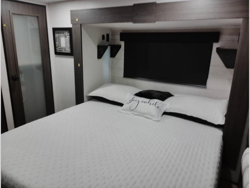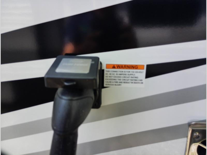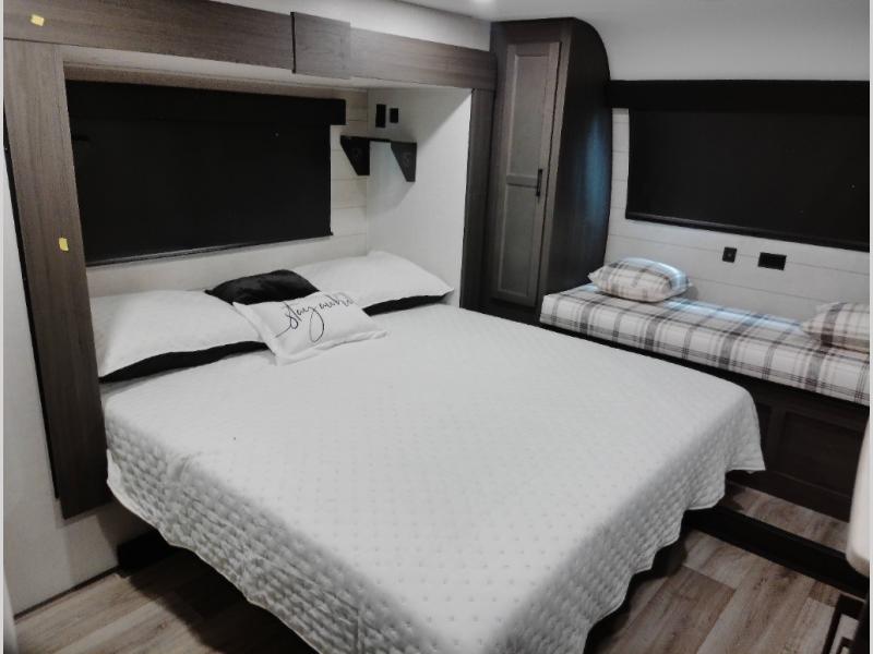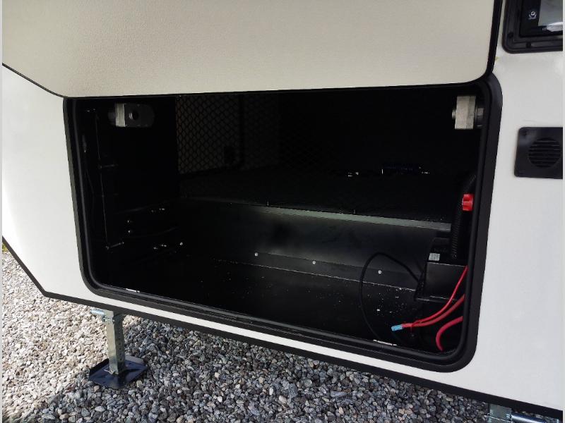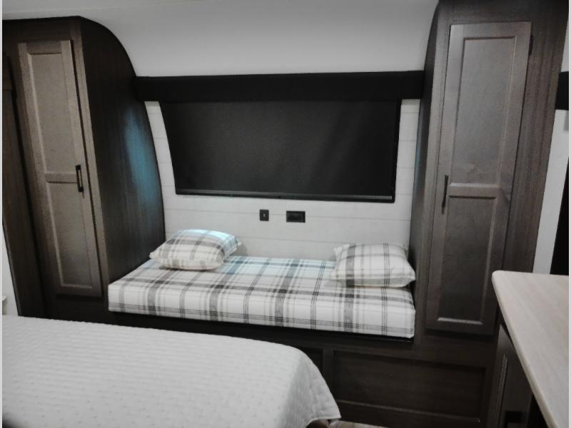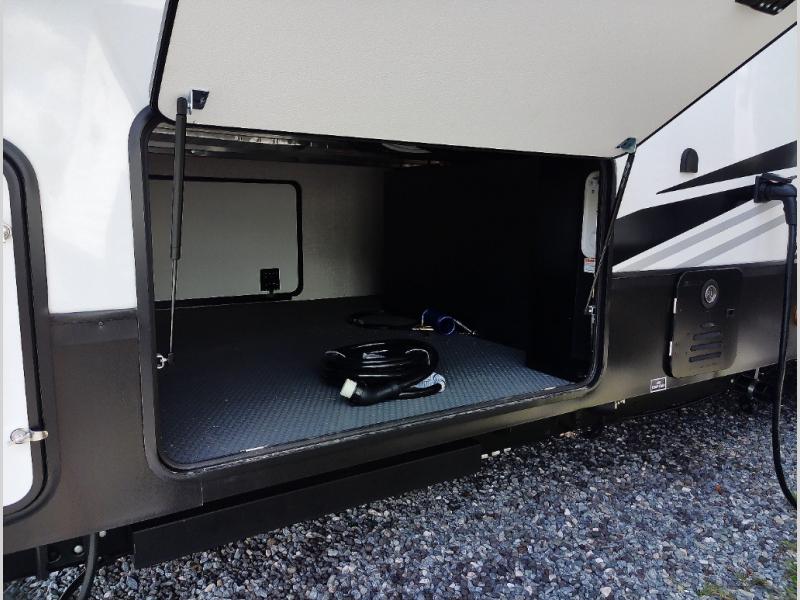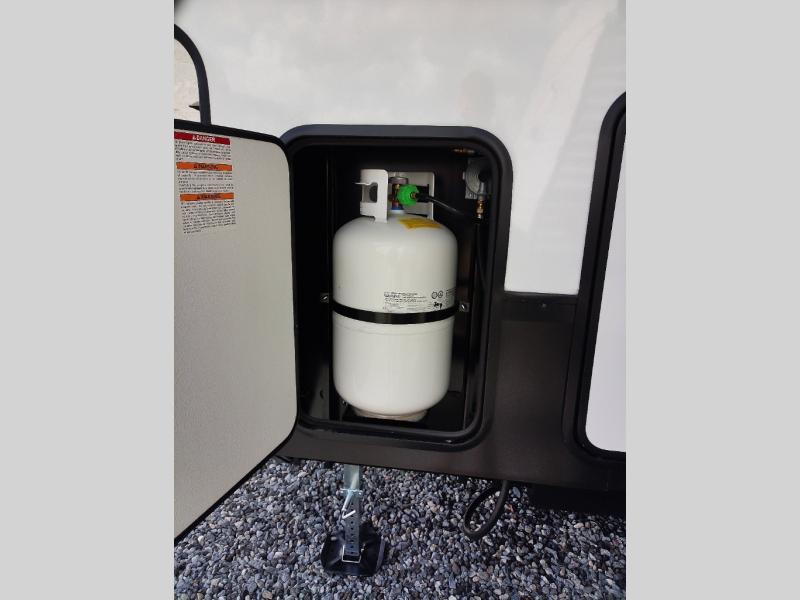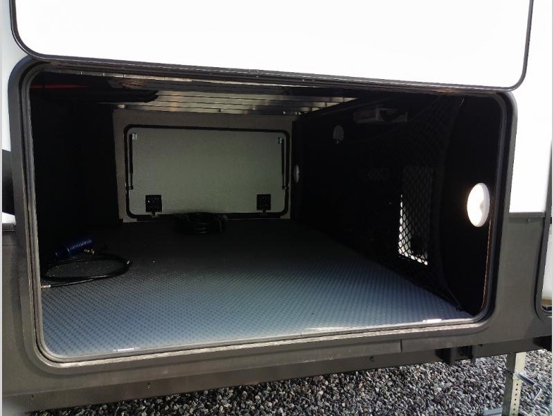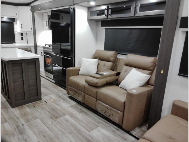 The chef will love cooking in the rear kitchen of this fifth wheel! The front private bedroom has a Serta king mattress to lay your head on at night, a window seat to comfortably read a book while enjoying the 5,000 BTU fireplace, a shelf storage closet, and a prepped area for a washer and dryer. Freshen up each morning with the 48" fiberglass shower with a seat in the full bathroom then head down the floating steps with shoe storage to whip up a delicious breakfast. The fully equipped kitchen even comes with a 18" GE stainless steel dishwasher at the rear sink with countertops on either side for easy clean up. Enjoy your meals at the table with two chairs and two Versa benches. You could even cook at the outside campfire cafe with the griddle. Inside the middle living area, you will find a tri-fold sofa with overhead cabinets and theater seating with USB charging across from the entertainment center with a 5,000 BTU fireplace!