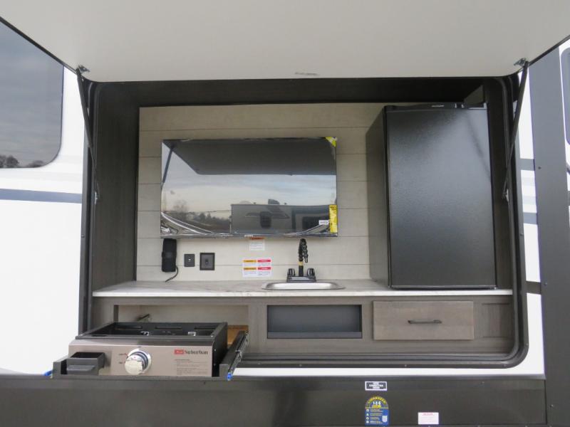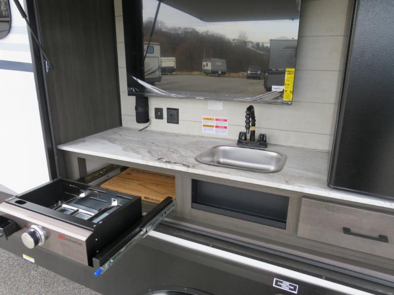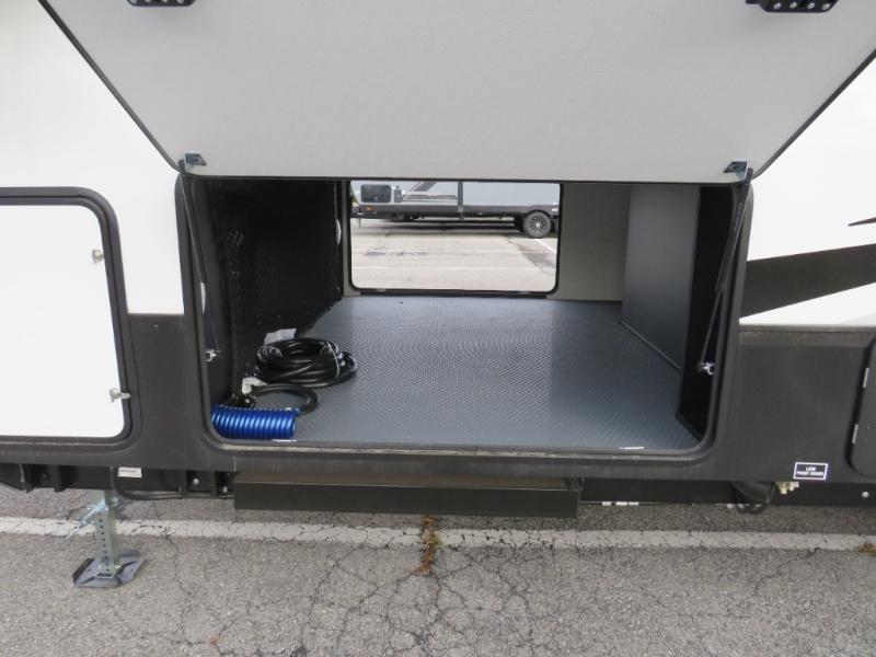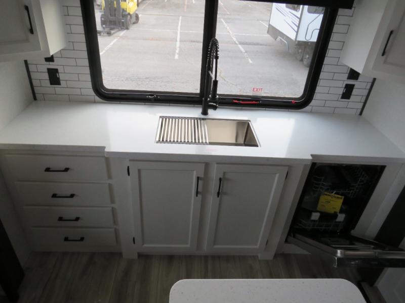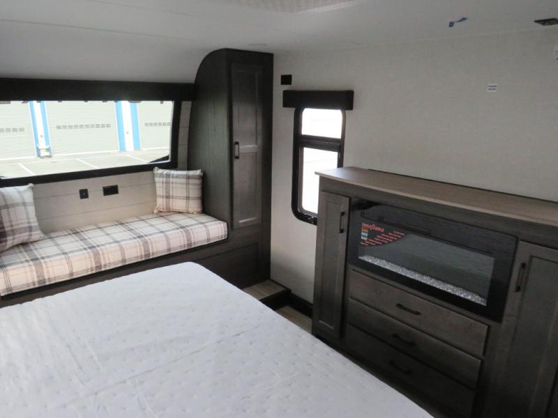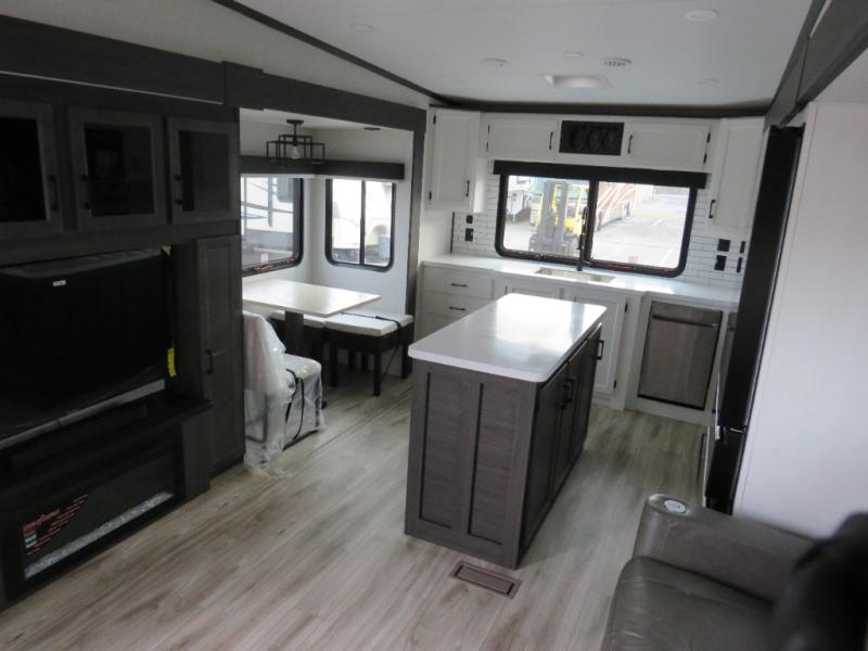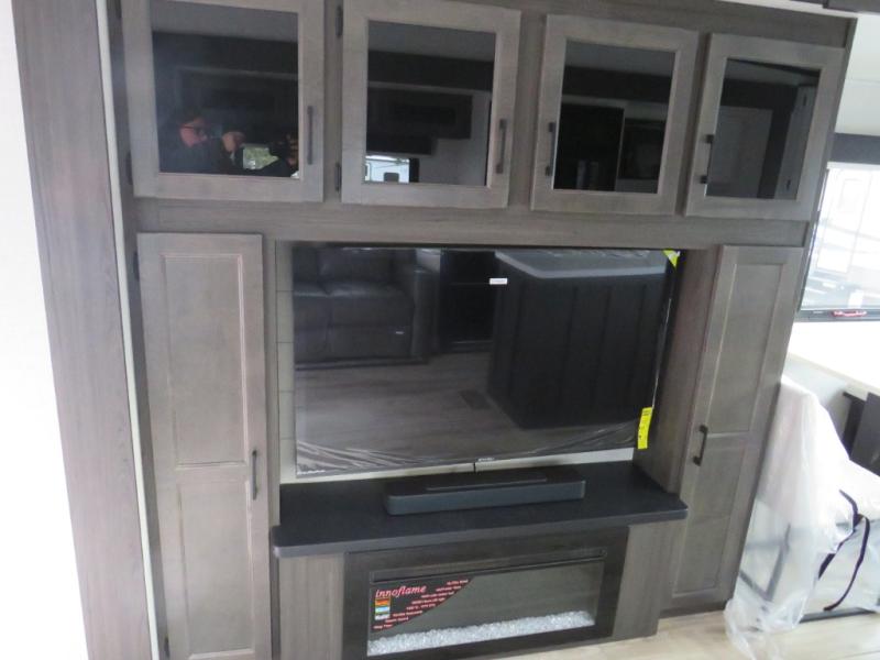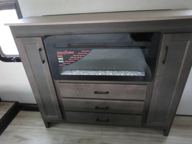 The chef will love cooking in the rear kitchen of this fifth wheel! The front private bedroom has a Serta king mattress to lay your head on at night, a window seat to comfortably read a book while enjoying the 5,000 BTU fireplace, a shelf storage closet, and a prepped area for a washer and dryer. Freshen up each morning with the 48" fiberglass shower with a seat in the full bathroom then head down the floating steps with shoe storage to whip up a delicious breakfast. The fully equipped kitchen even comes with a 18" GE stainless steel dishwasher at the rear sink with countertops on either side for easy clean up. Enjoy your meals at the table with two chairs and two Versa benches. You could even cook at the outside campfire cafe with the griddle. Inside the middle living area, you will find a tri-fold sofa with overhead cabinets and theater seating with USB charging across from the entertainment center with a 5,000 BTU fireplace!