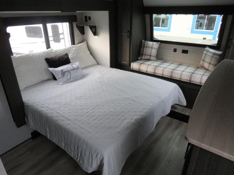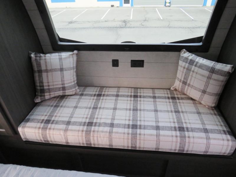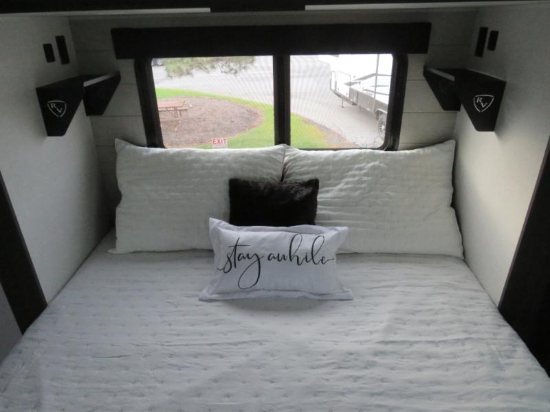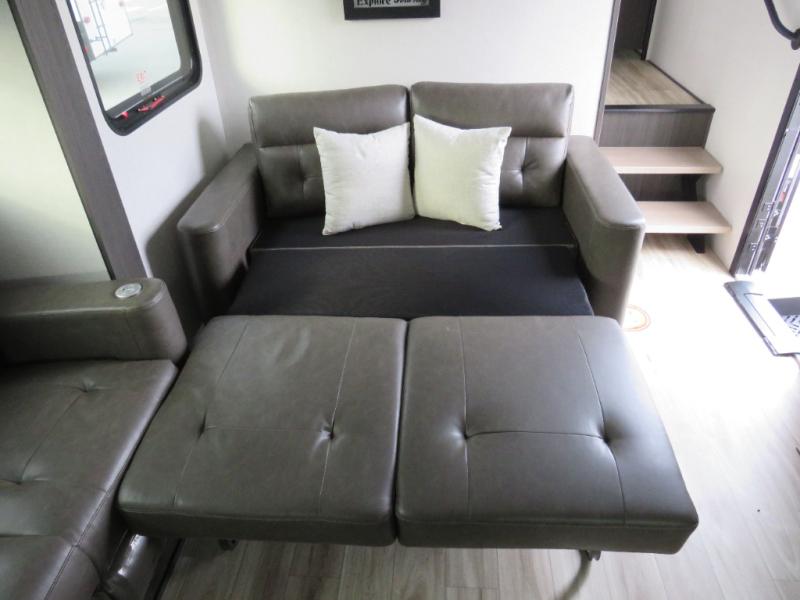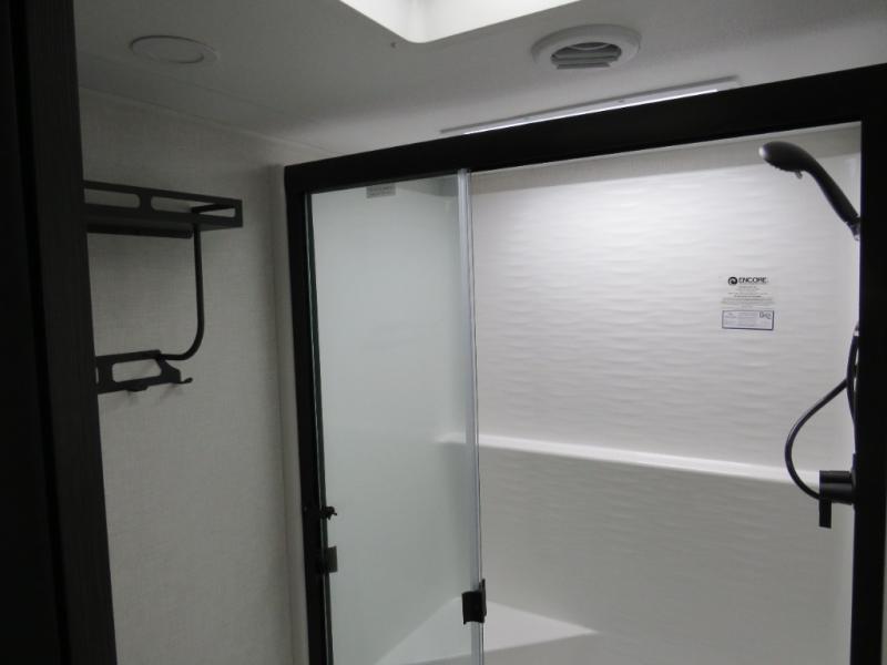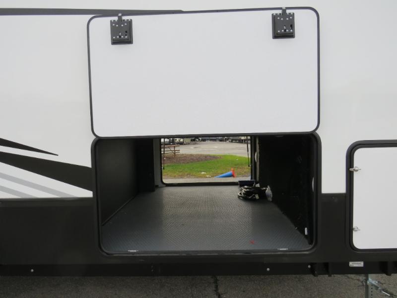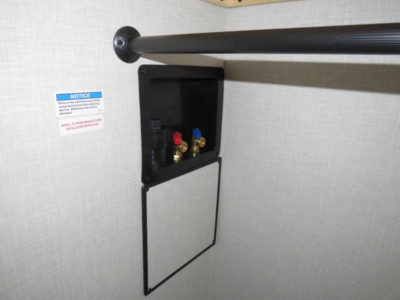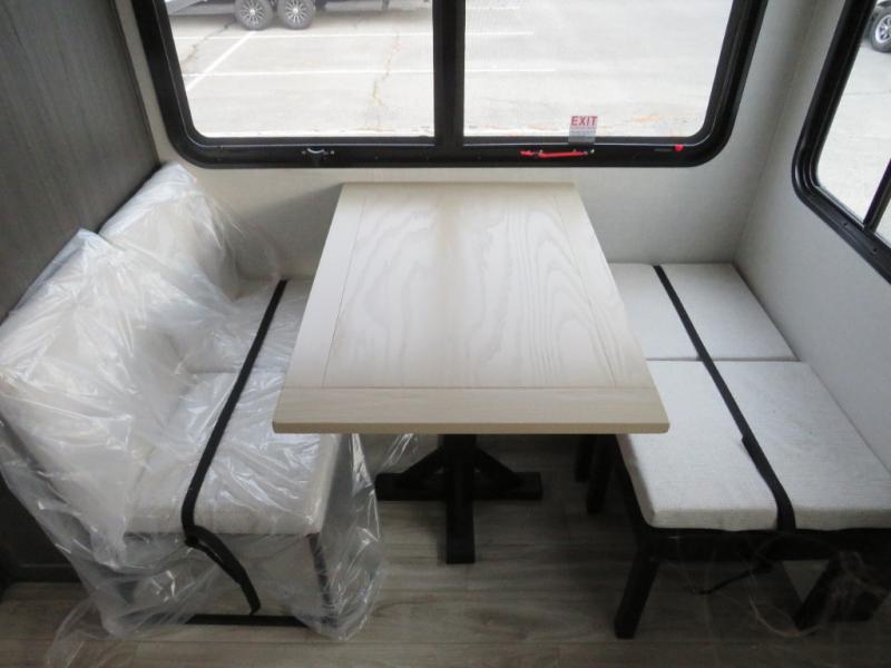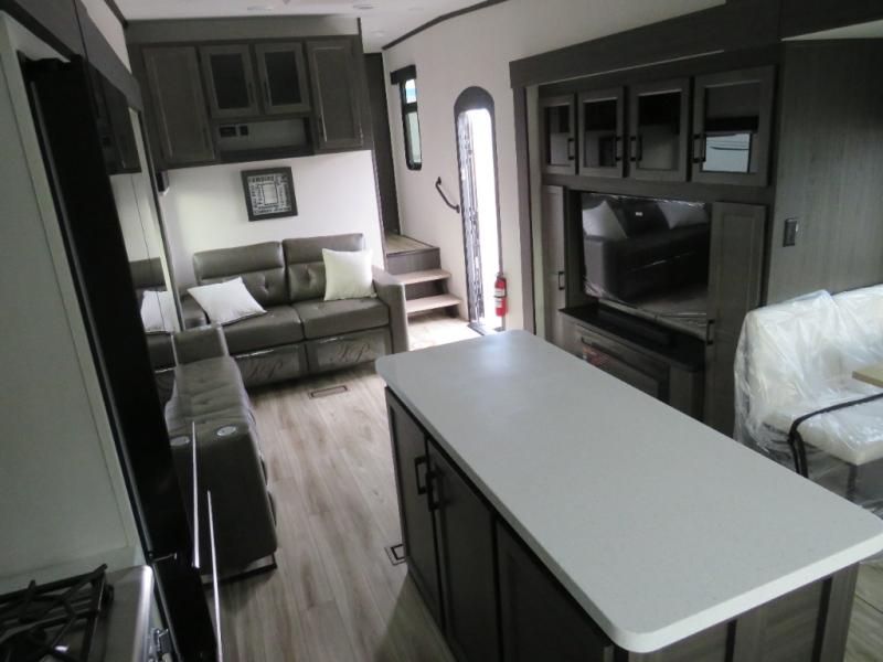 The chef will love cooking in the rear kitchen of this fifth wheel! The front private bedroom has a Serta king mattress to lay your head on at night, a window seat to comfortably read a book while enjoying the 5,000 BTU fireplace, a shelf storage closet, and a prepped area for a washer and dryer. Freshen up each morning with the 48" fiberglass shower with a seat in the full bathroom then head down the floating steps with shoe storage to whip up a delicious breakfast. The fully equipped kitchen even comes with a 18" GE stainless steel dishwasher at the rear sink with countertops on either side for easy clean up. Enjoy your meals at the table with two chairs and two Versa benches. You could even cook at the outside campfire cafe with the griddle. Inside the middle living area, you will find a tri-fold sofa with overhead cabinets and theater seating with USB charging across from the entertainment center with a 5,000 BTU fireplace!