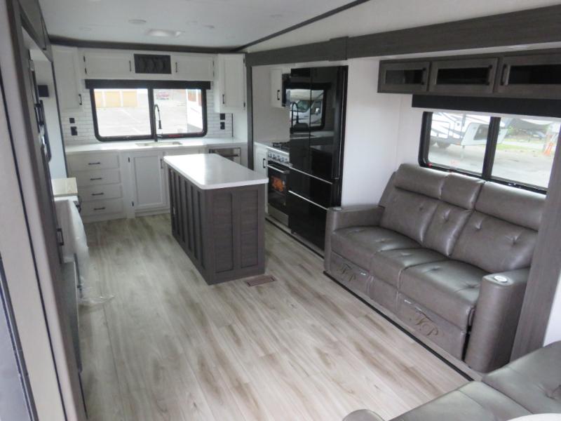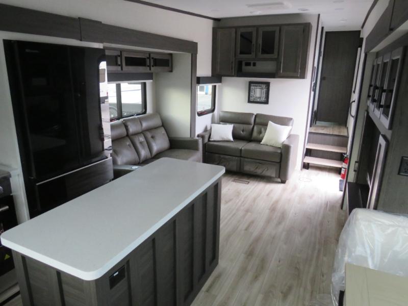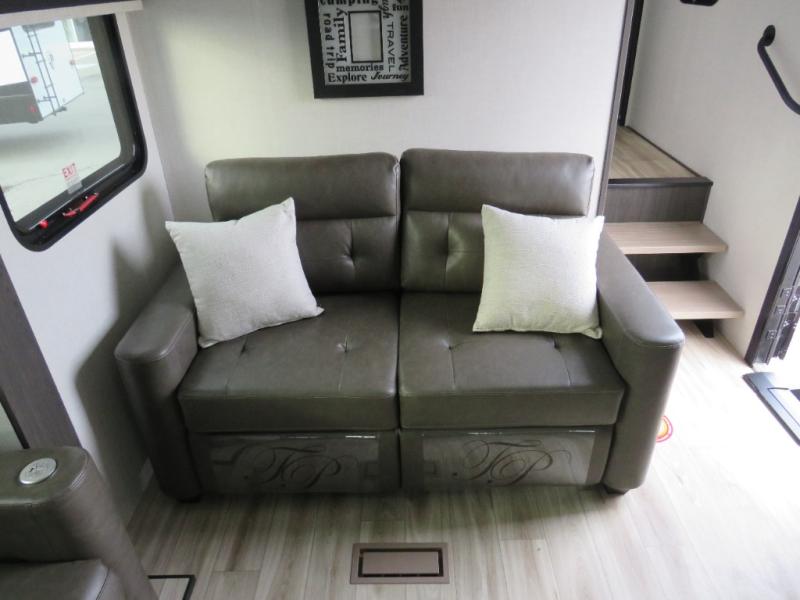 An elegant design and new features come with every one of these Venture RV SportTrek Touring Edition fifth wheels! The NXG Huck bolt frame holds these units together and Tufflex PVC roofing covers them. Heads will turn down the highway and at the campsite with the frameless tinted windows and high gloss fiberglass front cap with automotive paint. The exterior pass-through storage area has slam latch baggage doors with magnetic catches so you don't have to worry about them closing on you and LED lighting on the electric awning so you can see clearly even at night. Luxury abounds throughout these units, especially with the two fireplaces, solid surface kitchen countertops, blackout roller shades, and maximum storage designs. Come find your favorite model today!