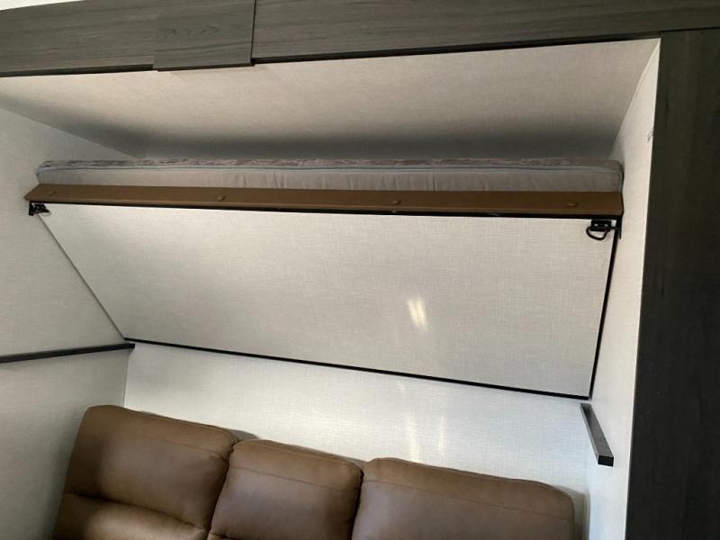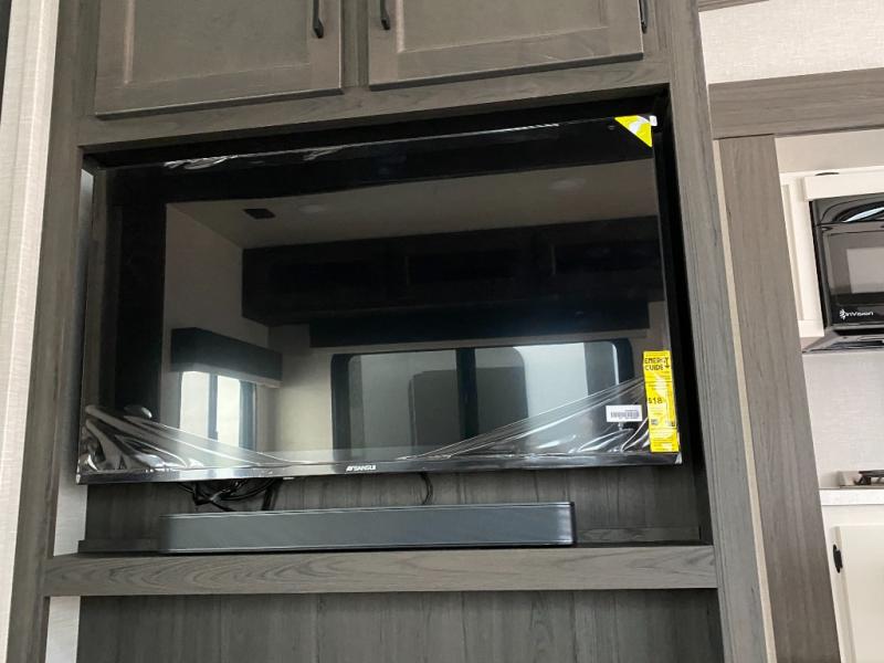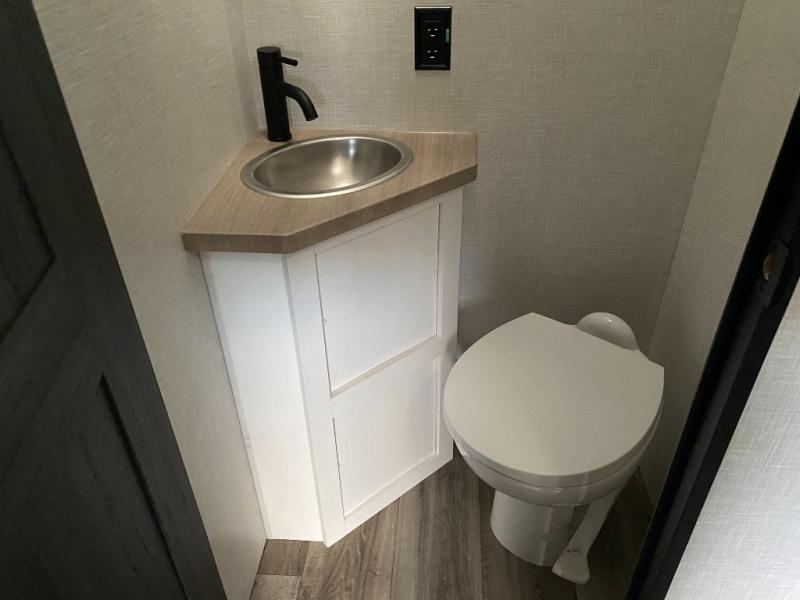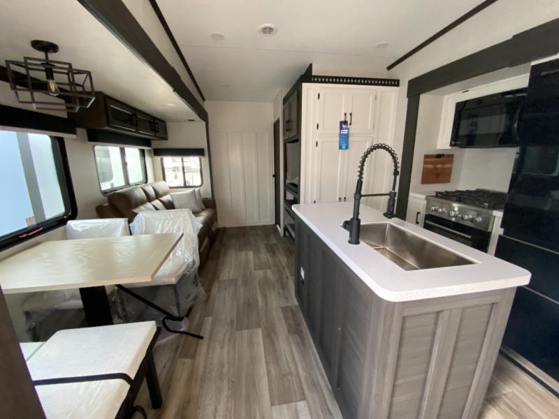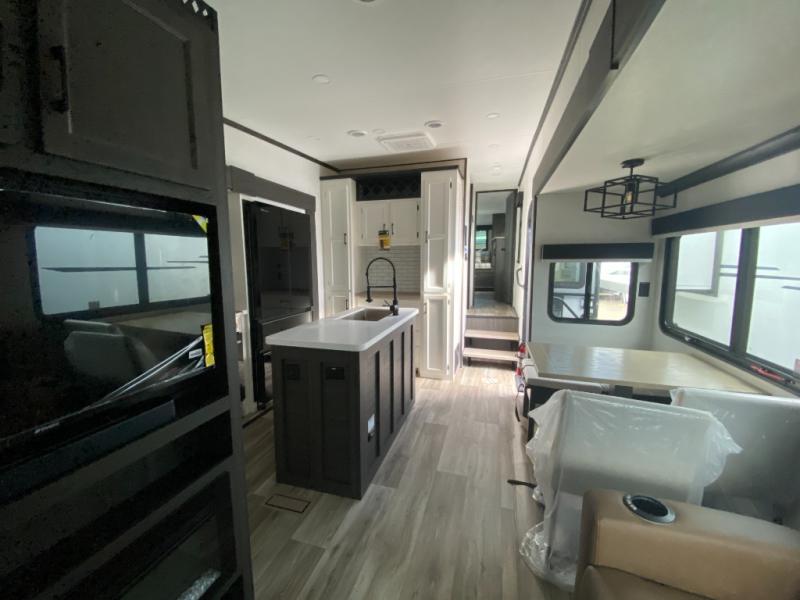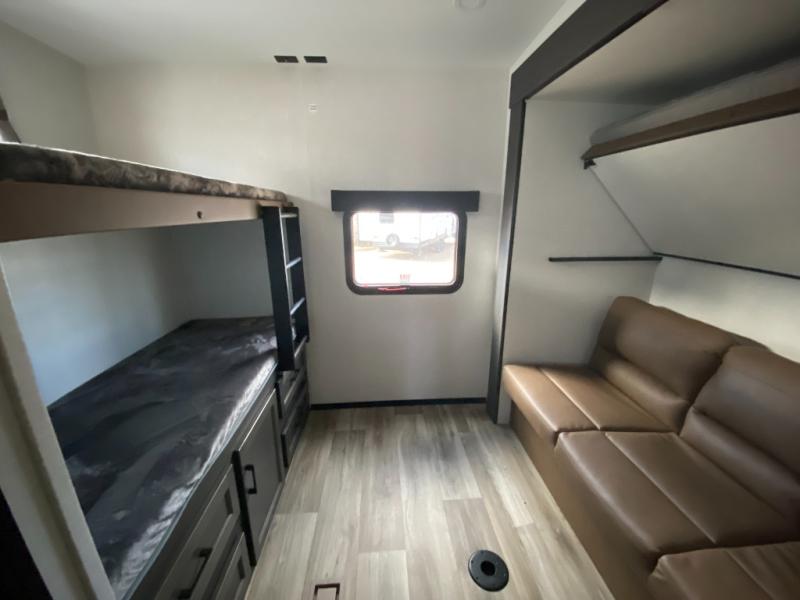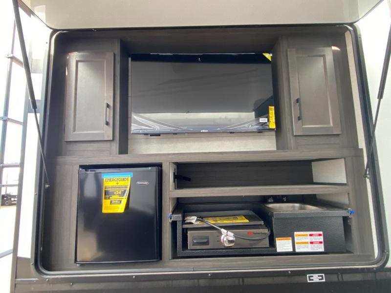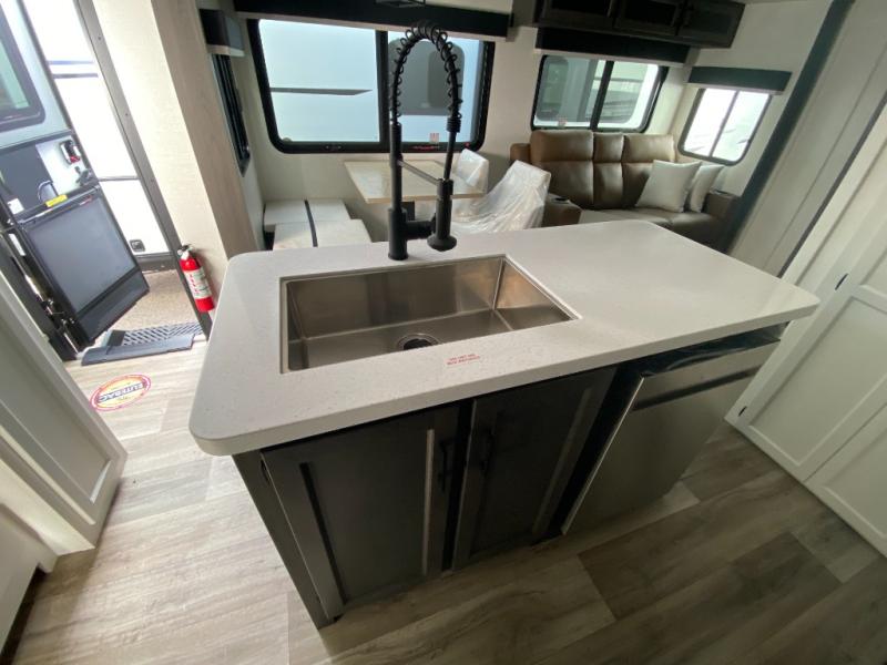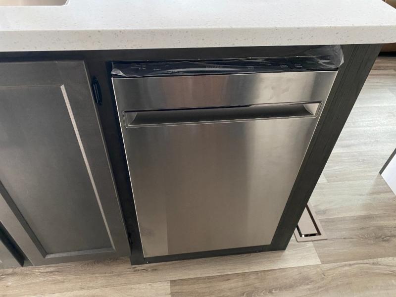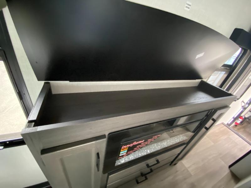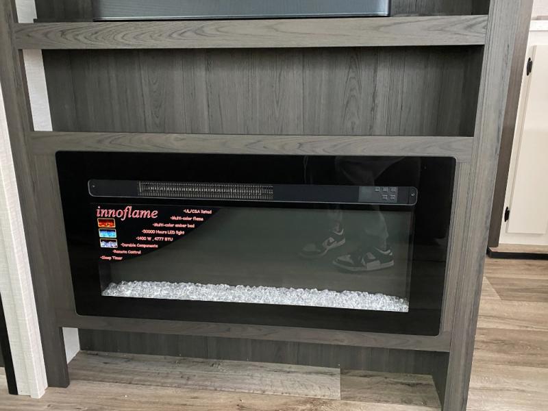 The whole family will have a great time camping in this fifth wheel! The kiddos will enjoy their own privacy with the rear private bunkhouse which has a bunk over bunk, a top bunk above a 70" sofa with table slide, and even its very own half bathroom. With a front private bedroom as well, you will have your own privacy with a Serta king mattress to lay your head on at night, a comfortable window seat to read a book by the 5,000 BTU fireplace, and a shelf storage closet to keep things organized. Everyone can clean up in the 48" fiberglass shower with a seat in the full bathroom, and keep their bellies full with the fully equipped kitchen which even has a 18" GE stainless steel dishwasher at the kitchen island. Relax on the 70" tri-fold sofa in front of the 5,000 BTU fireplace or play a few card games at the table with two chairs and two Versa benches!