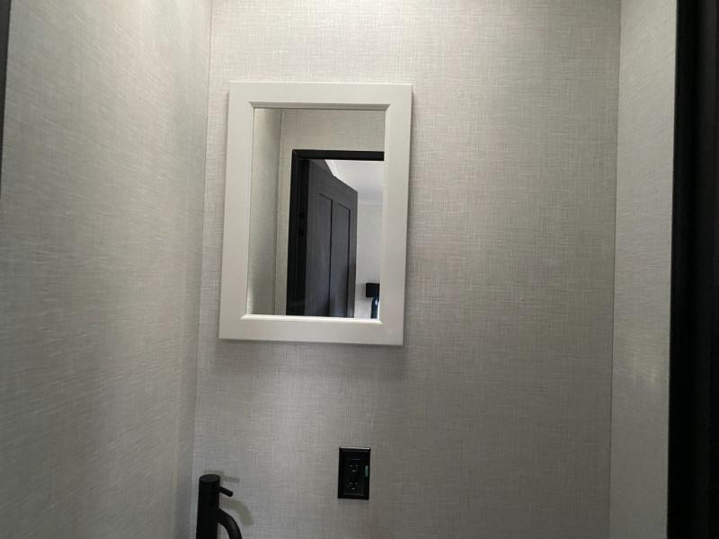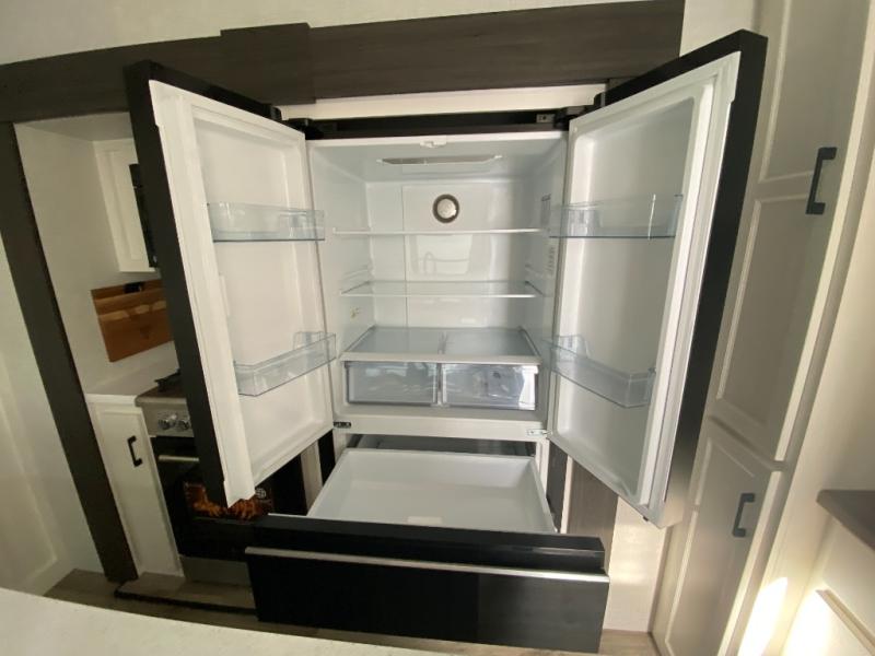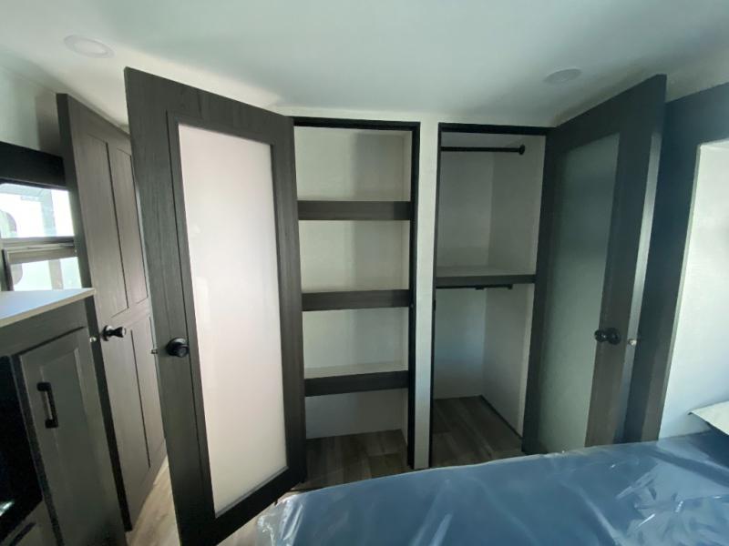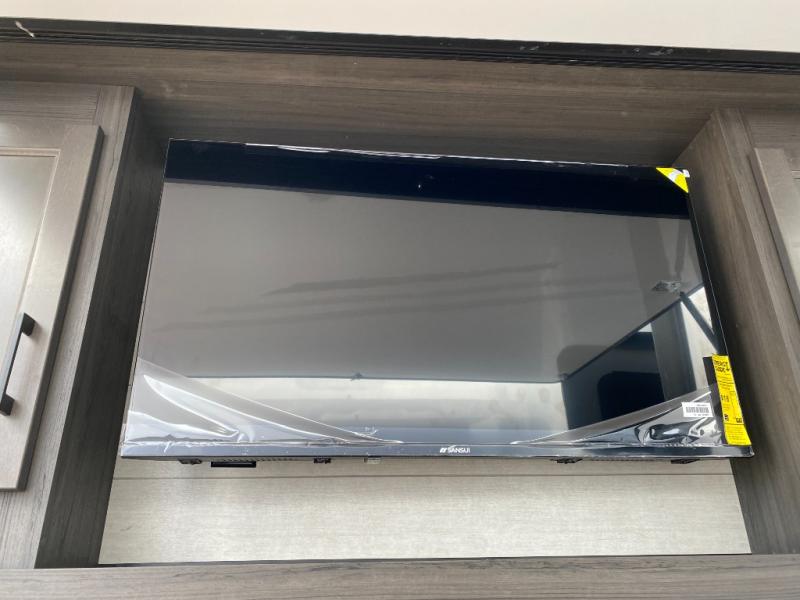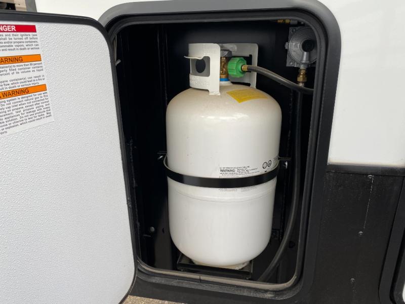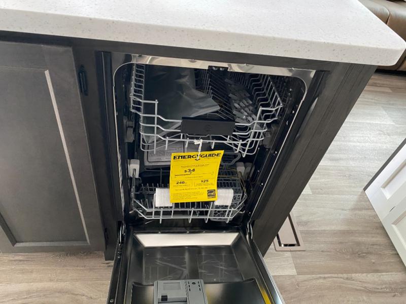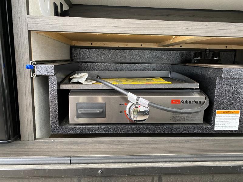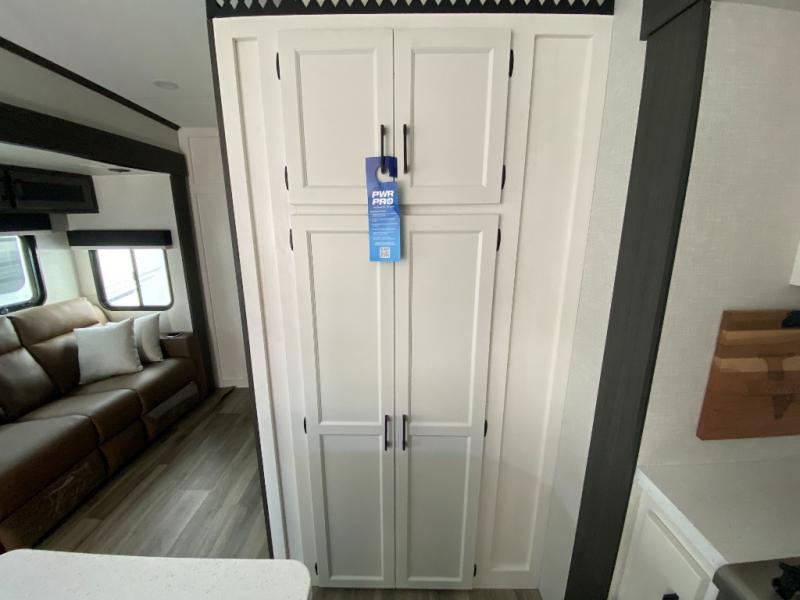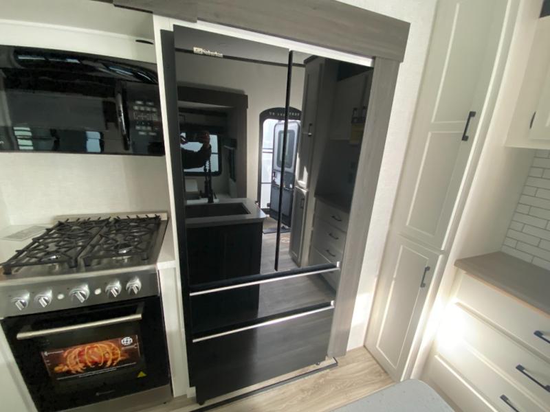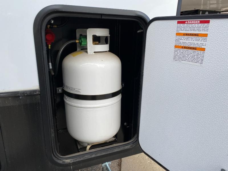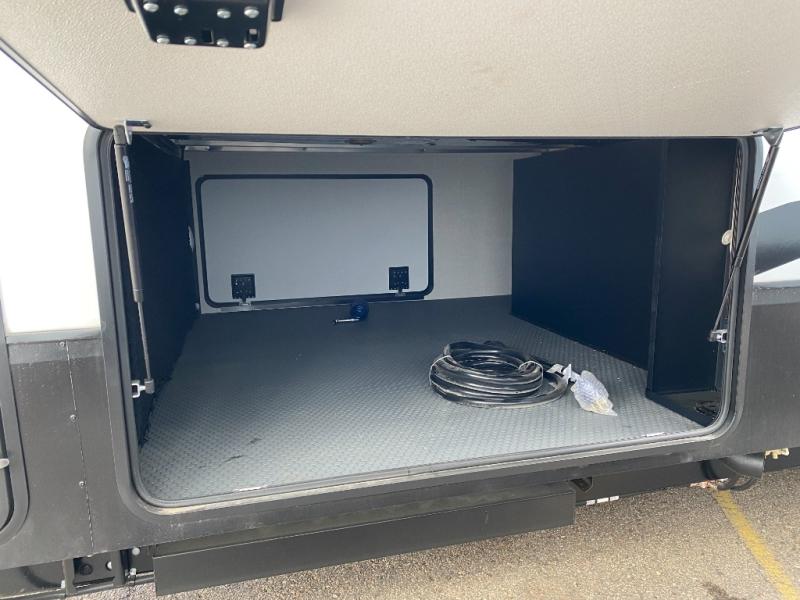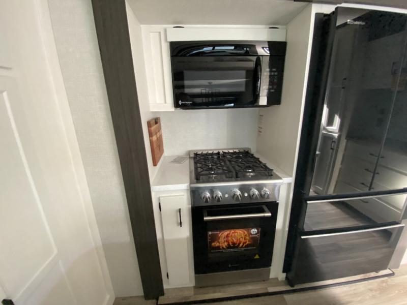 The whole family will have a great time camping in this fifth wheel! The kiddos will enjoy their own privacy with the rear private bunkhouse which has a bunk over bunk, a top bunk above a 70" sofa with table slide, and even its very own half bathroom. With a front private bedroom as well, you will have your own privacy with a Serta king mattress to lay your head on at night, a comfortable window seat to read a book by the 5,000 BTU fireplace, and a shelf storage closet to keep things organized. Everyone can clean up in the 48" fiberglass shower with a seat in the full bathroom, and keep their bellies full with the fully equipped kitchen which even has a 18" GE stainless steel dishwasher at the kitchen island. Relax on the 70" tri-fold sofa in front of the 5,000 BTU fireplace or play a few card games at the table with two chairs and two Versa benches!