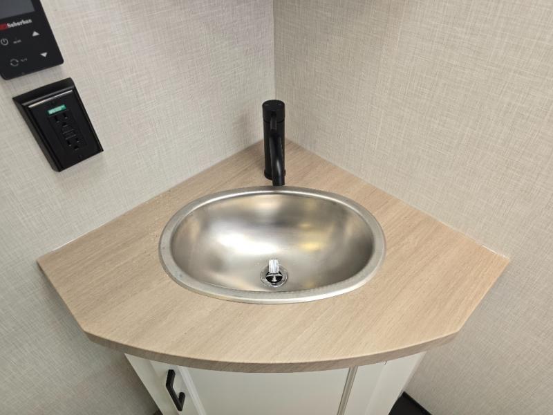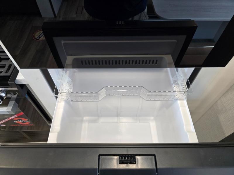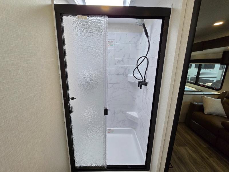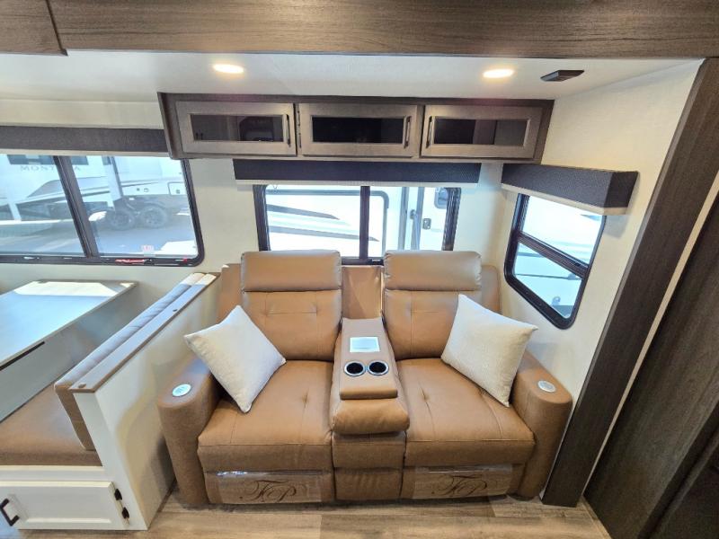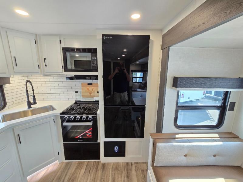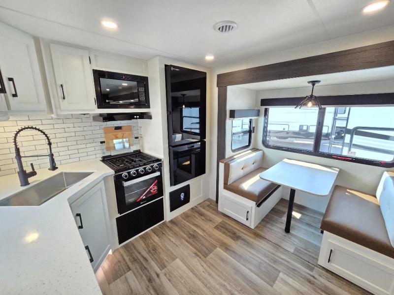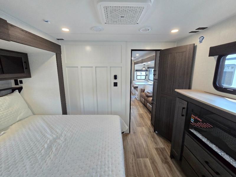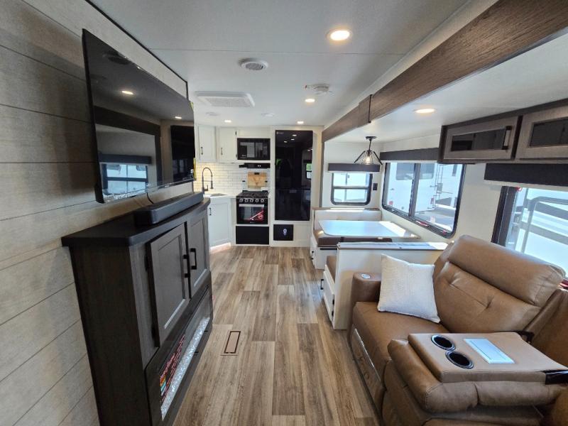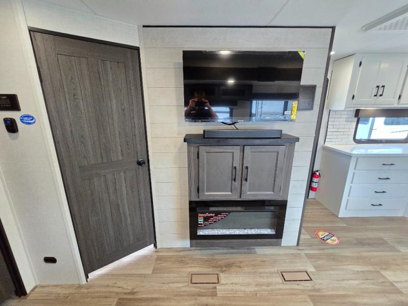 This travel trailer is perfect for two people who want to escape from everyday life! The front private bedroom has a 70" x 80" Sleep Tight king bed slide for more interior space, a dresser with a 30" frameless fireplace and TV, and a window seat to read a book with a view. Freshen up each morning in the full bathroom with the 30" x 36" shower then head to the rear kitchen to fry up some eggs on the three burner cooktop. The Sit N' Slide table offers a comfortable place to enjoy your meals, play card games, and even transform into an extra sleeping space. Grab a snack from the walk-in pantry and relax on the 70" tri-fold sofa across from the entertainment center with a 30" frameless fireplace!