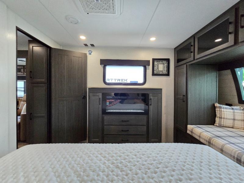 An elegant design and new features come with every one of these Venture RV SportTrek Touring Edition travel trailers! The NXG Huck bolt frame holds these units together and a walkable roof covers them. Heads will turn down the highway and at the campsite with an upgraded graphics package and a painted fiberglass front cap with integrated LED light. The exterior pass-through storage area has slam latch baggage doors with magnetic catches so you don't have to worry about them closing on you and a motion activated light to see your items clearly even at night. Luxury abounds throughout these units, especially with the mandatory Interior Luxury package which comes with solid surface kitchen countertops, designer valances with fabric nightshades, two 30" frameless fireplaces, and Beauflor wood plank flooring that is easy to clean. Come find your favorite model today!