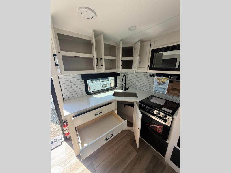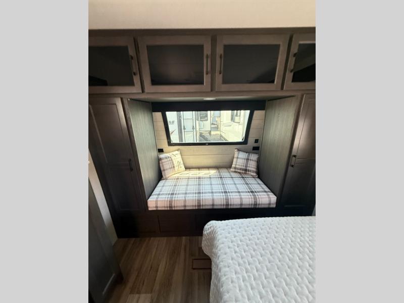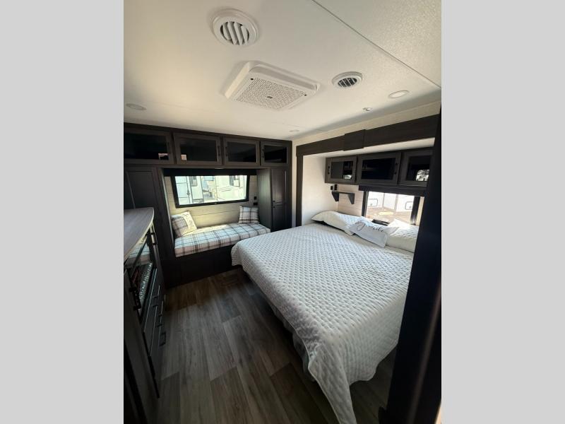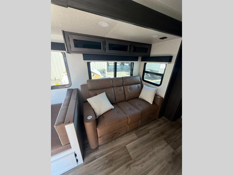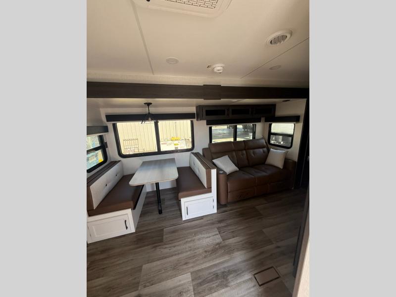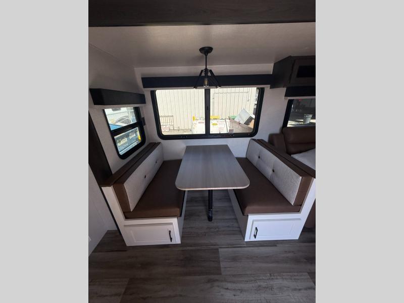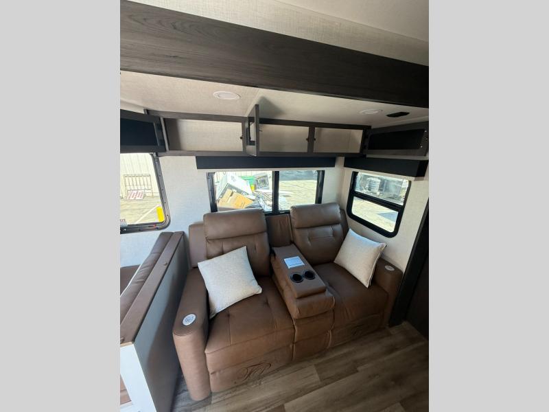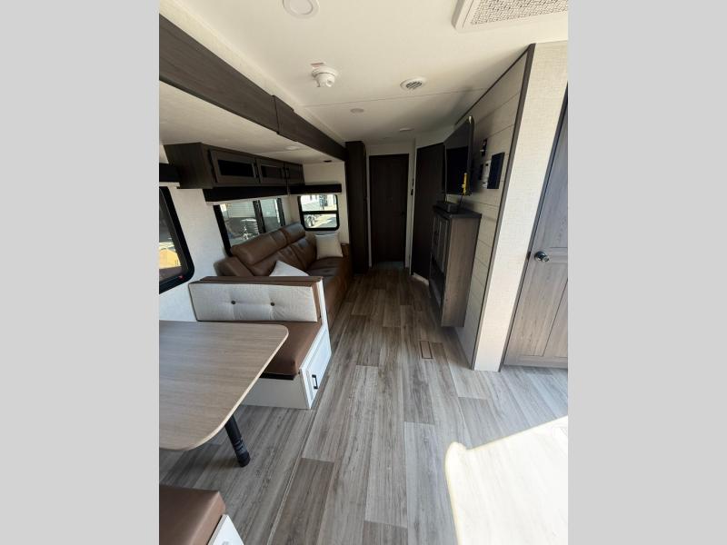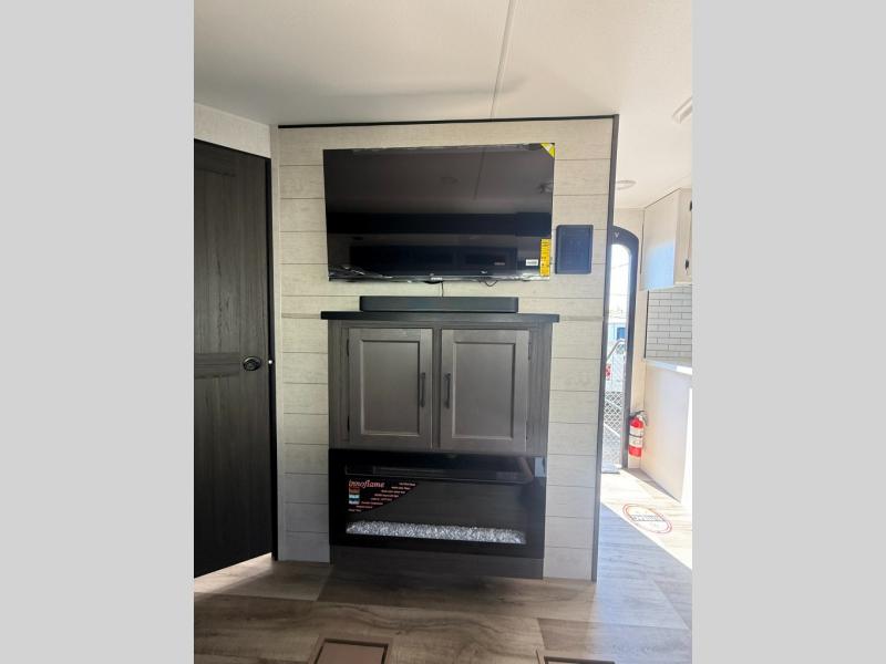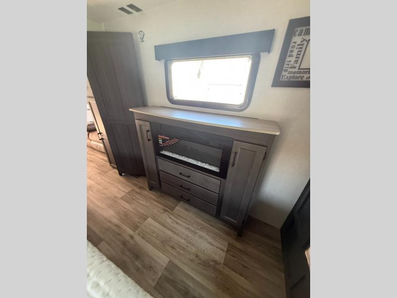 This travel trailer is perfect for two people who want to escape from everyday life! The front private bedroom has a 70" x 80" Sleep Tight king bed slide for more interior space, a dresser with a 30" frameless fireplace and TV, and a window seat to read a book with a view. Freshen up each morning in the full bathroom with the 30" x 36" shower then head to the rear kitchen to fry up some eggs on the three burner cooktop. The Sit N' Slide table offers a comfortable place to enjoy your meals, play card games, and even transform into an extra sleeping space. Grab a snack from the walk-in pantry and relax on the 70" tri-fold sofa across from the entertainment center with a 30" frameless fireplace!