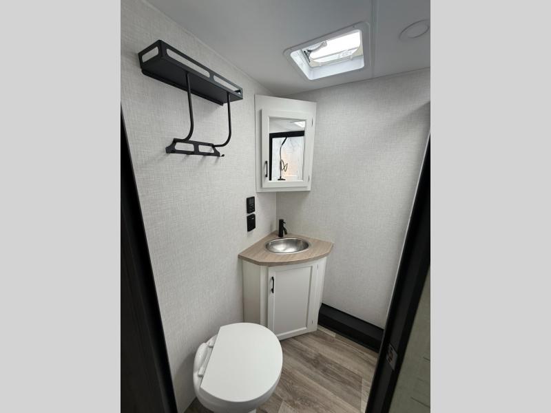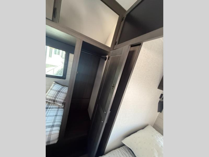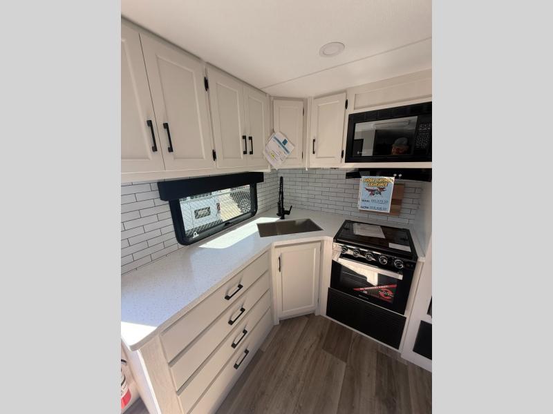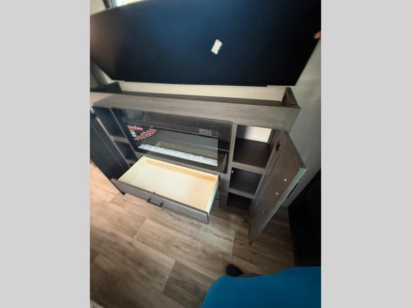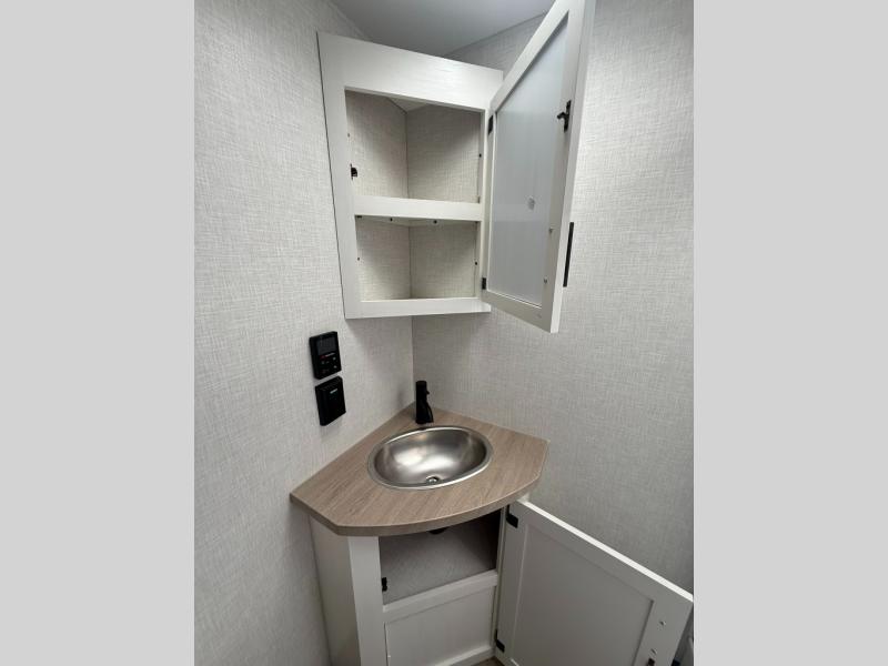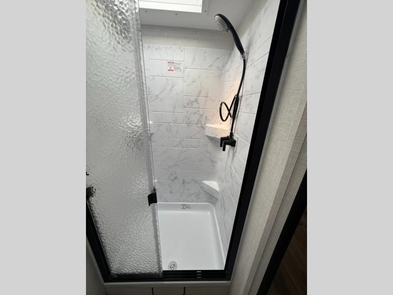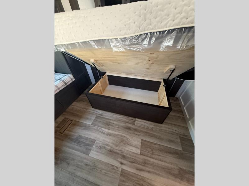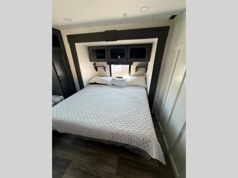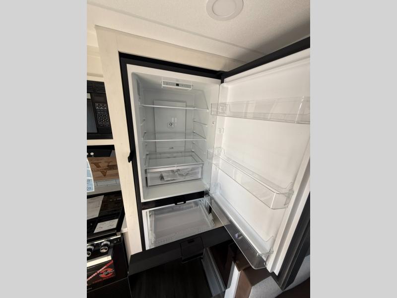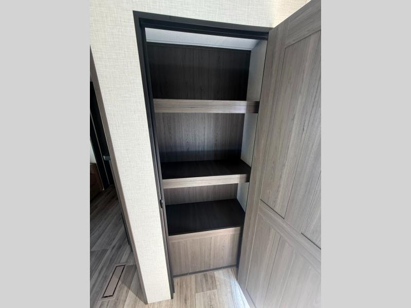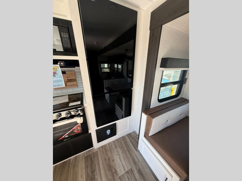 This travel trailer is perfect for two people who want to escape from everyday life! The front private bedroom has a 70" x 80" Sleep Tight king bed slide for more interior space, a dresser with a 30" frameless fireplace and TV, and a window seat to read a book with a view. Freshen up each morning in the full bathroom with the 30" x 36" shower then head to the rear kitchen to fry up some eggs on the three burner cooktop. The Sit N' Slide table offers a comfortable place to enjoy your meals, play card games, and even transform into an extra sleeping space. Grab a snack from the walk-in pantry and relax on the 70" tri-fold sofa across from the entertainment center with a 30" frameless fireplace!