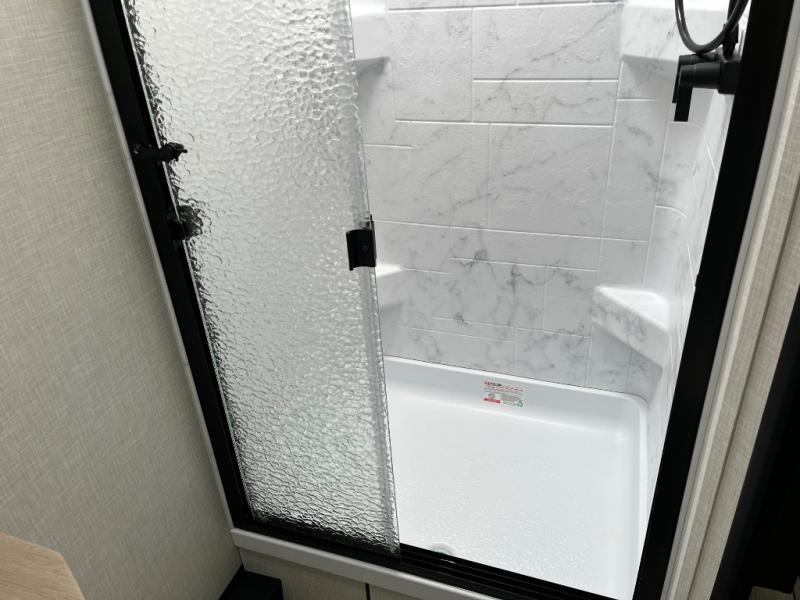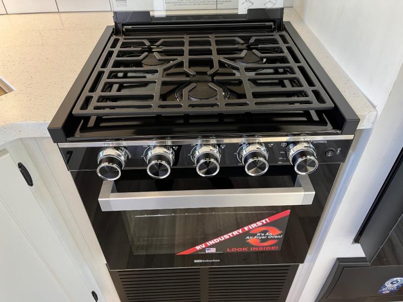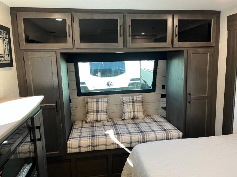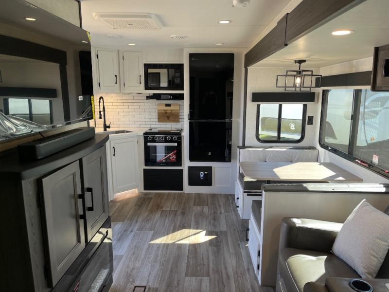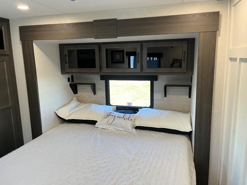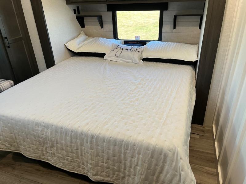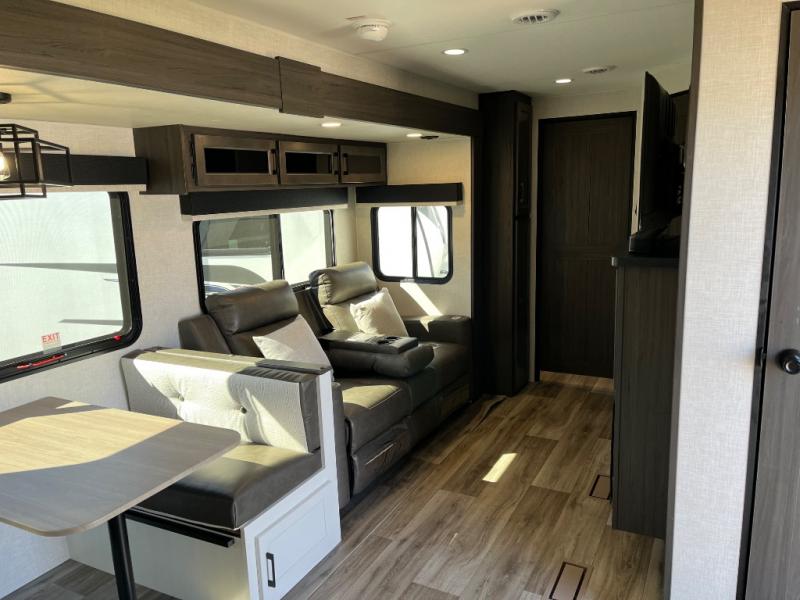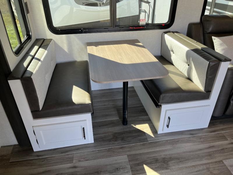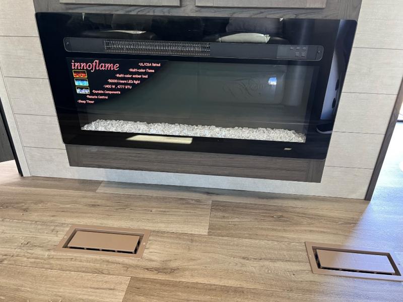 This travel trailer is perfect for two people who want to escape from everyday life! The front private bedroom has a 70" x 80" Sleep Tight king bed slide for more interior space, a dresser with a 30" frameless fireplace and TV, and a window seat to read a book with a view. Freshen up each morning in the full bathroom with the 30" x 36" shower then head to the rear kitchen to fry up some eggs on the three burner cooktop. The Sit N' Slide table offers a comfortable place to enjoy your meals, play card games, and even transform into an extra sleeping space. Grab a snack from the walk-in pantry and relax on the 70" tri-fold sofa across from the entertainment center with a 30" frameless fireplace!