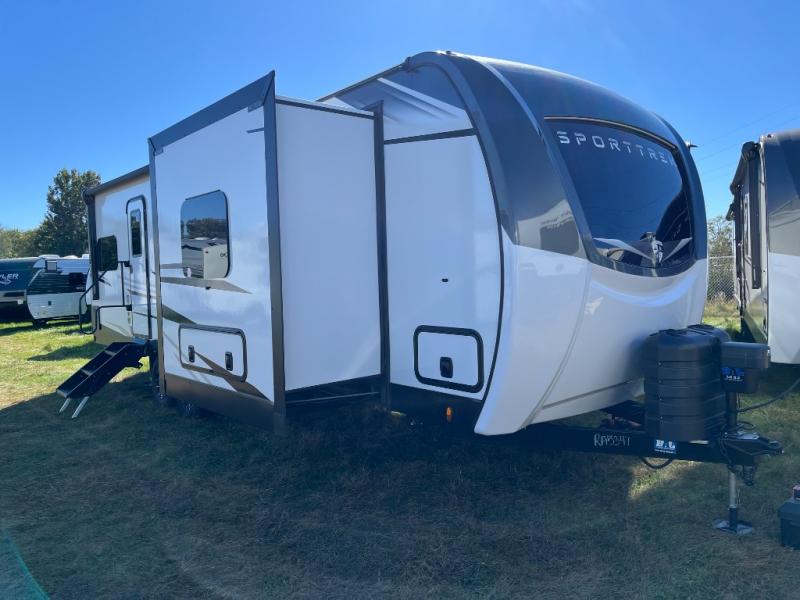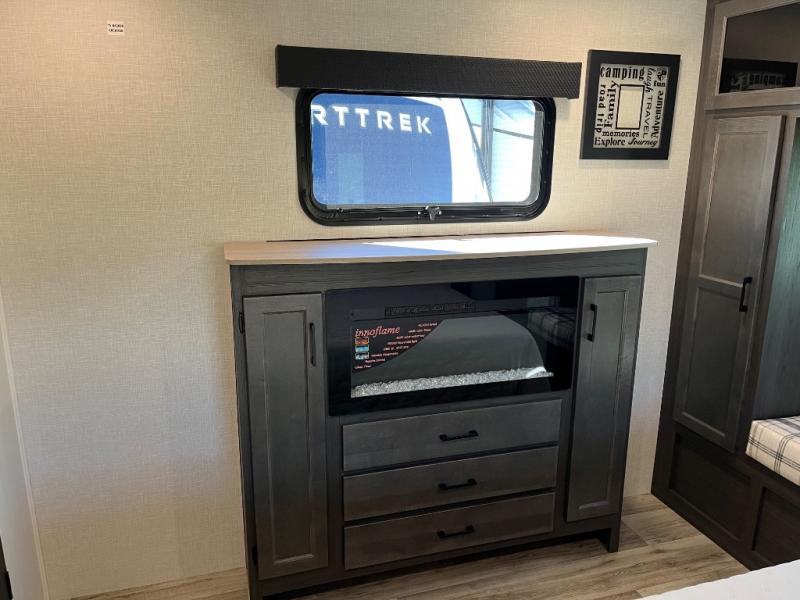 An elegant design and new features come with every one of these Venture RV SportTrek Touring Edition travel trailers! The NXG Huck bolt frame holds these units together and a walkable roof covers them. Heads will turn down the highway and at the campsite with an upgraded graphics package and a painted fiberglass front cap with integrated LED light. The exterior pass-through storage area has slam latch baggage doors with magnetic catches so you don't have to worry about them closing on you and a motion activated light to see your items clearly even at night. Luxury abounds throughout these units, especially with the mandatory Interior Luxury package which comes with solid surface kitchen countertops, designer valances with fabric nightshades, two 30" frameless fireplaces, and Beauflor wood plank flooring that is easy to clean. Come find your favorite model today!