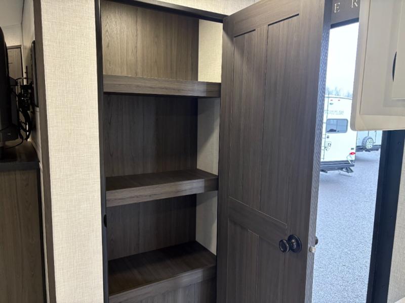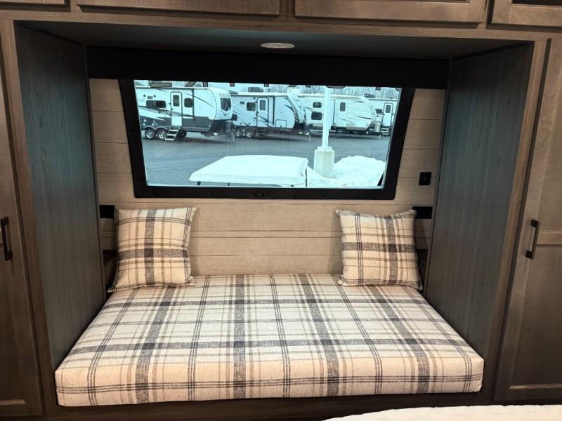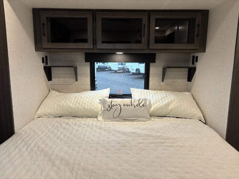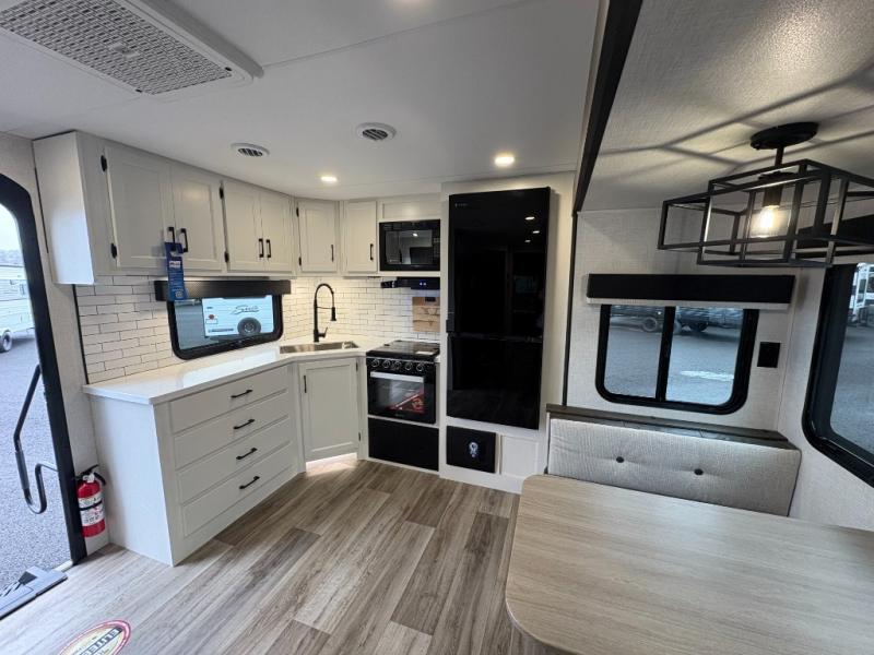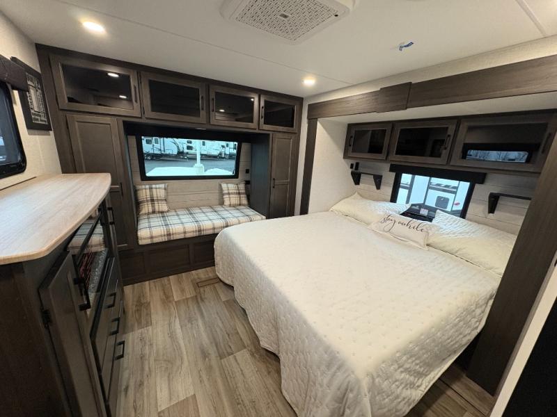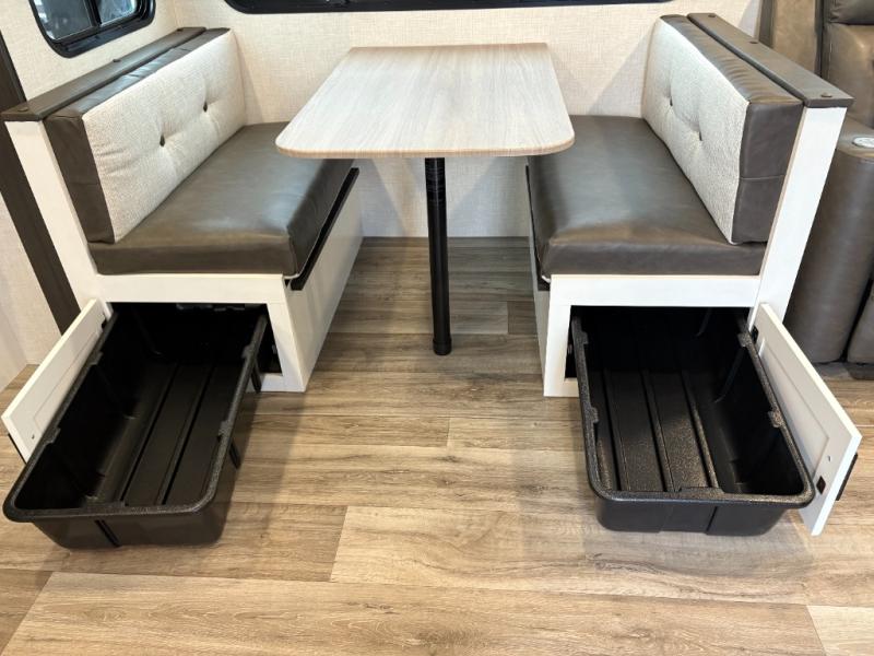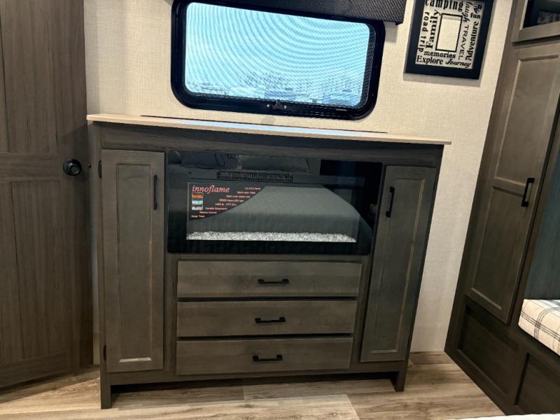 This travel trailer is perfect for two people who want to escape from everyday life! The front private bedroom has a 70" x 80" Sleep Tight king bed slide for more interior space, a dresser with a 30" frameless fireplace and TV, and a window seat to read a book with a view. Freshen up each morning in the full bathroom with the 30" x 36" shower then head to the rear kitchen to fry up some eggs on the three burner cooktop. The Sit N' Slide table offers a comfortable place to enjoy your meals, play card games, and even transform into an extra sleeping space. Grab a snack from the walk-in pantry and relax on the 70" tri-fold sofa across from the entertainment center with a 30" frameless fireplace!