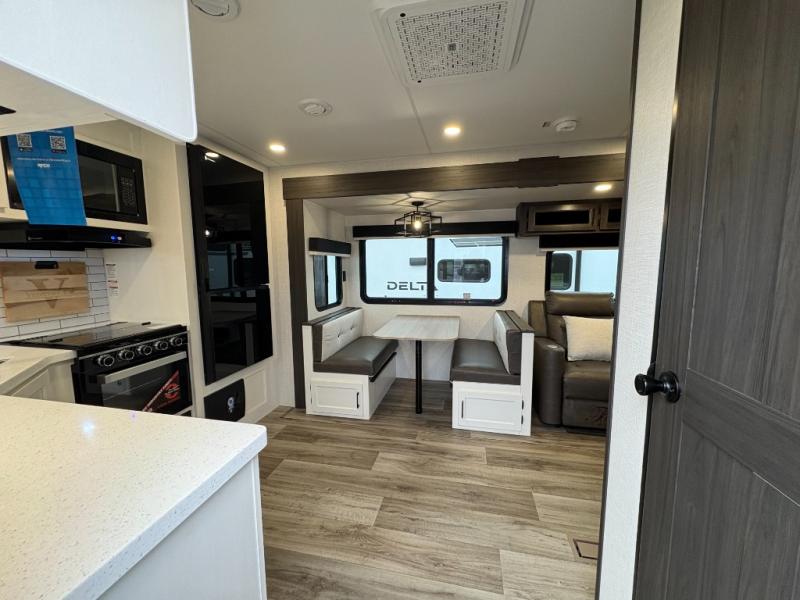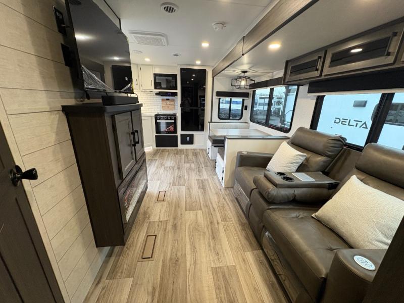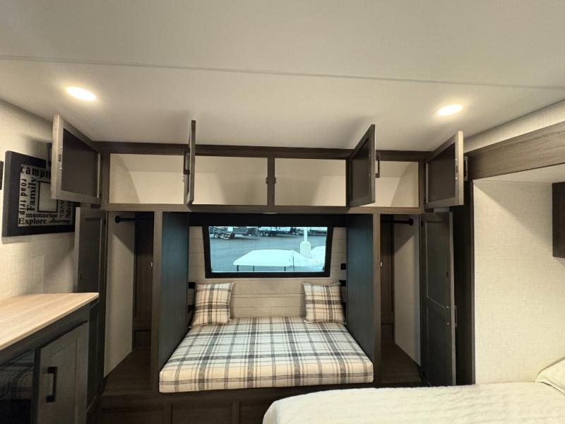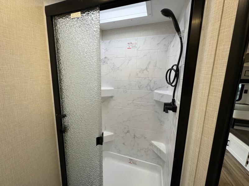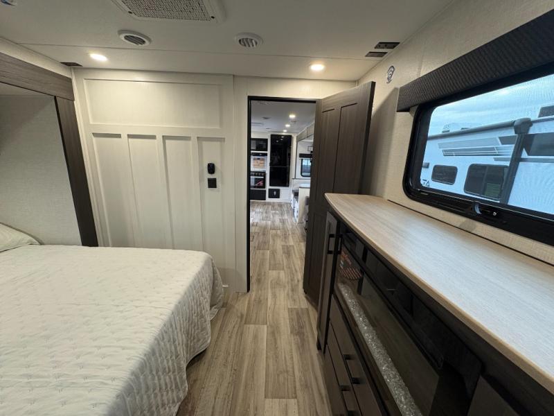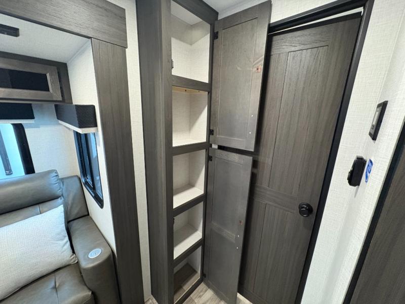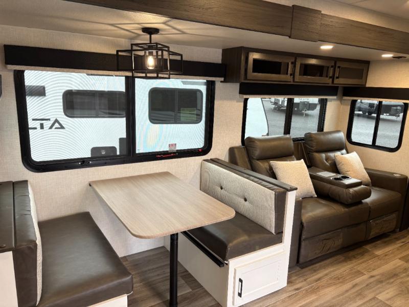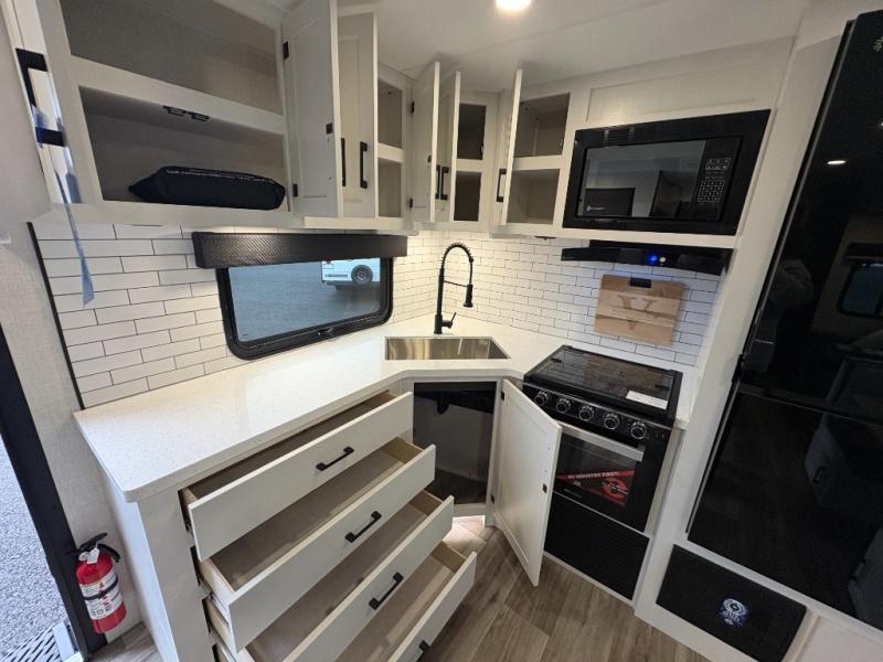 This travel trailer is perfect for two people who want to escape from everyday life! The front private bedroom has a 70" x 80" Sleep Tight king bed slide for more interior space, a dresser with a 30" frameless fireplace and TV, and a window seat to read a book with a view. Freshen up each morning in the full bathroom with the 30" x 36" shower then head to the rear kitchen to fry up some eggs on the three burner cooktop. The Sit N' Slide table offers a comfortable place to enjoy your meals, play card games, and even transform into an extra sleeping space. Grab a snack from the walk-in pantry and relax on the 70" tri-fold sofa across from the entertainment center with a 30" frameless fireplace!