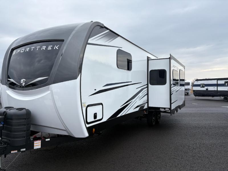 An elegant design and new features come with every one of these Venture RV SportTrek Touring Edition travel trailers! The NXG Huck bolt frame holds these units together and a walkable roof covers them. Heads will turn down the highway and at the campsite with an upgraded graphics package and a painted fiberglass front cap with integrated LED light. The exterior pass-through storage area has slam latch baggage doors with magnetic catches so you don't have to worry about them closing on you and a motion activated light to see your items clearly even at night. Luxury abounds throughout these units, especially with the mandatory Interior Luxury package which comes with solid surface kitchen countertops, designer valances with fabric nightshades, two 30" frameless fireplaces, and Beauflor wood plank flooring that is easy to clean. Come find your favorite model today!