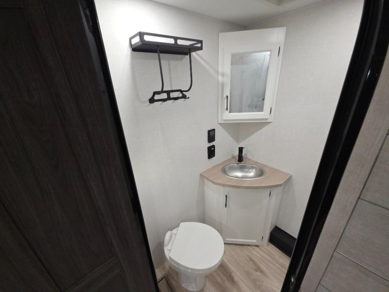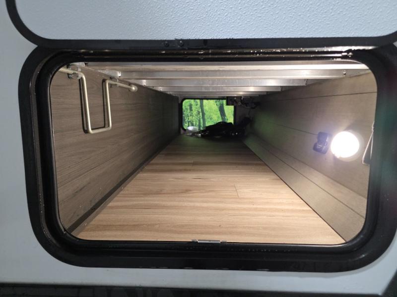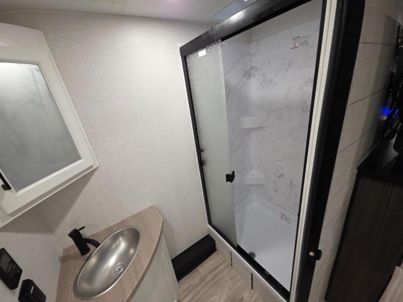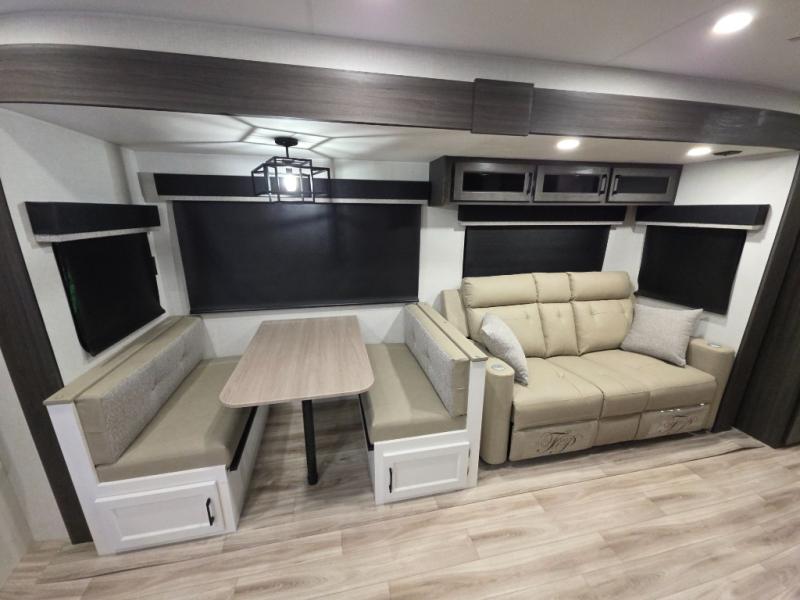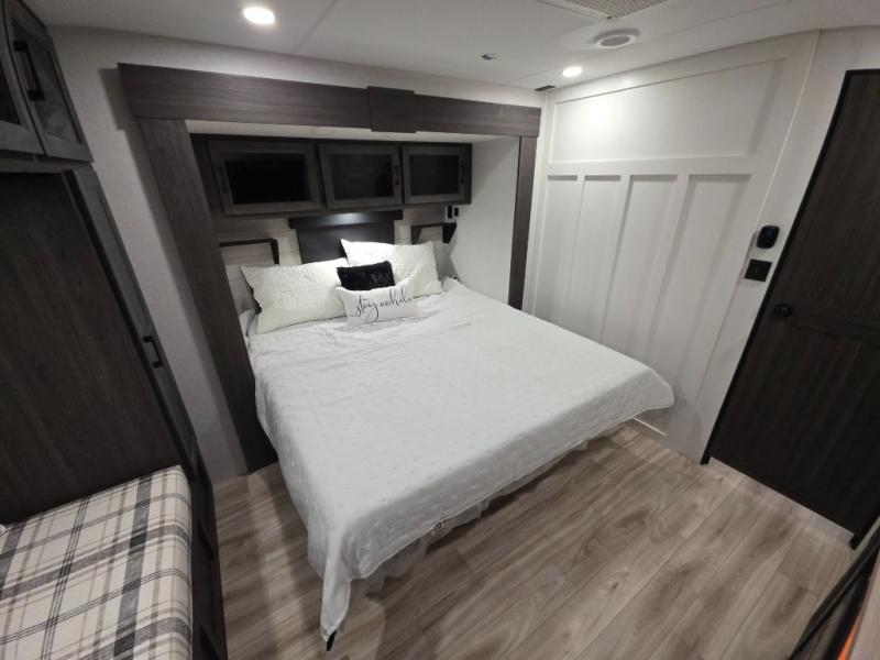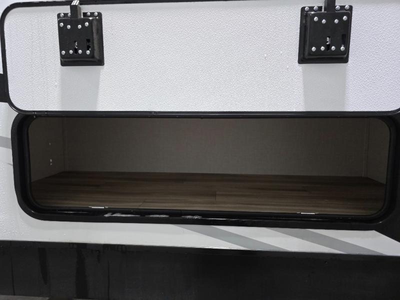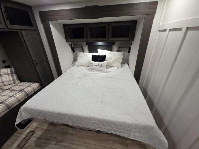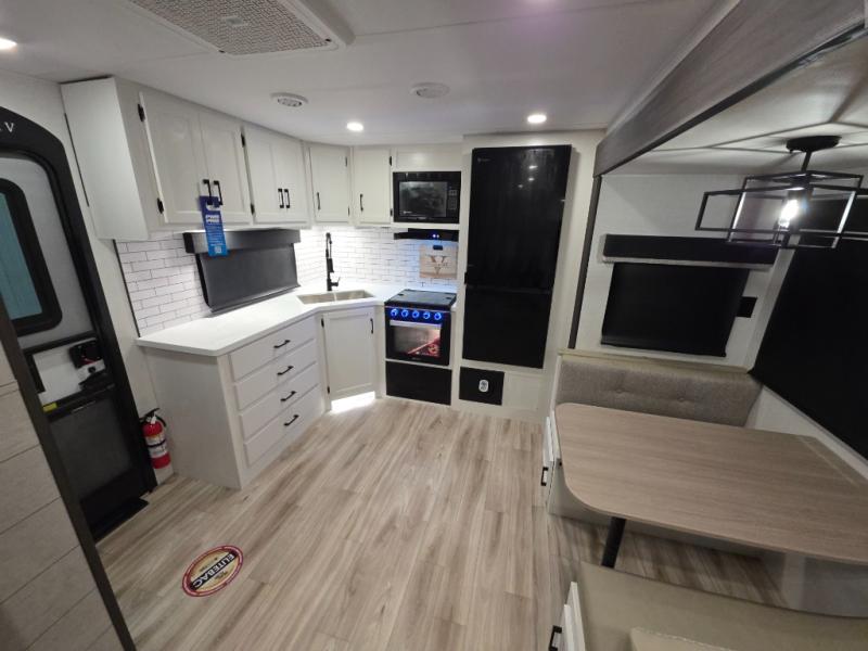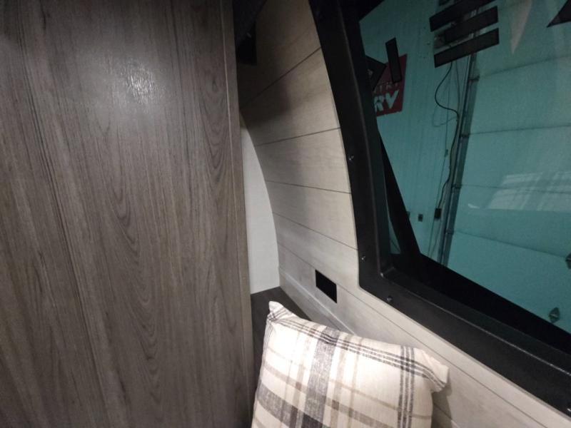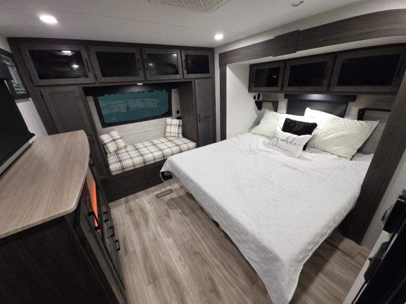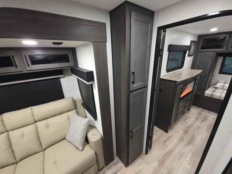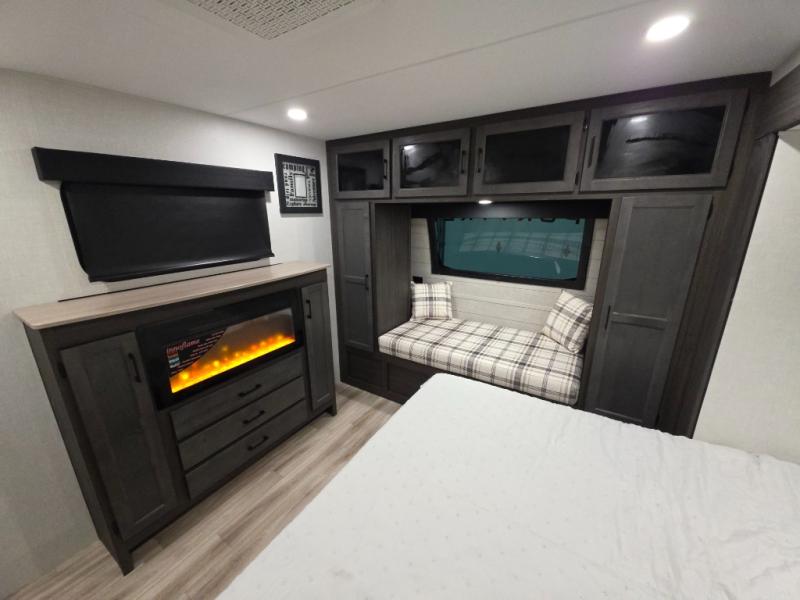This travel trailer is perfect for two people who want to escape from everyday life! The front private bedroom has a 70" x 80" Sleep Tight king bed slide for more interior space, a dresser with a 30" frameless fireplace and TV, and a window seat to read a book with a view. Freshen up each morning in the full bathroom with the 30" x 36" shower then head to the rear kitchen to fry up some eggs on the three burner cooktop. The Sit N' Slide table offers a comfortable place to enjoy your meals, play card games, and even transform into an extra sleeping space. Grab a snack from the walk-in pantry and relax on the 70" tri-fold sofa across from the entertainment center with a 30" frameless fireplace!