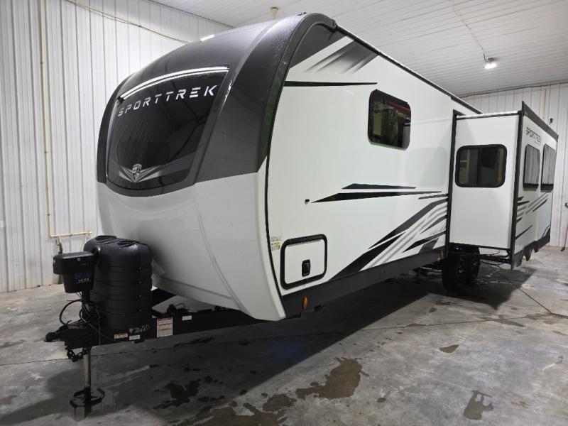 An elegant design and new features come with every one of these Venture RV SportTrek Touring Edition travel trailers! The NXG Huck bolt frame holds these units together and a walkable roof covers them. Heads will turn down the highway and at the campsite with an upgraded graphics package and a painted fiberglass front cap with integrated LED light. The exterior pass-through storage area has slam latch baggage doors with magnetic catches so you don't have to worry about them closing on you and a motion activated light to see your items clearly even at night. Luxury abounds throughout these units, especially with the mandatory Interior Luxury package which comes with solid surface kitchen countertops, designer valances with fabric nightshades, two 30" frameless fireplaces, and Beauflor wood plank flooring that is easy to clean. Come find your favorite model today!