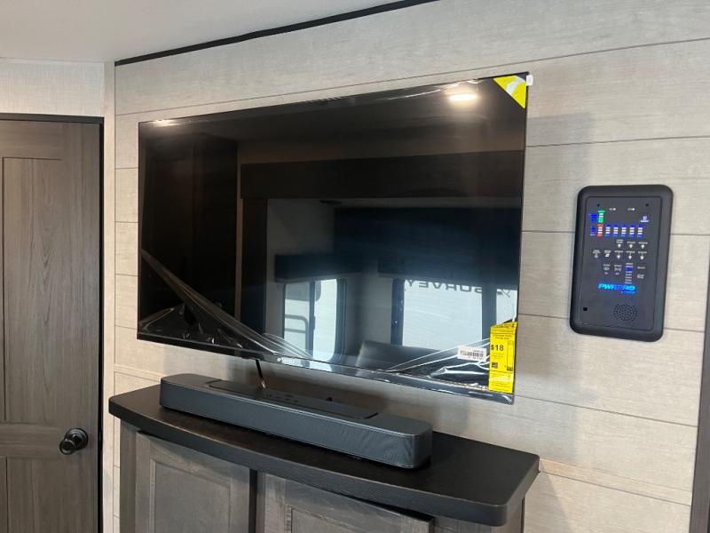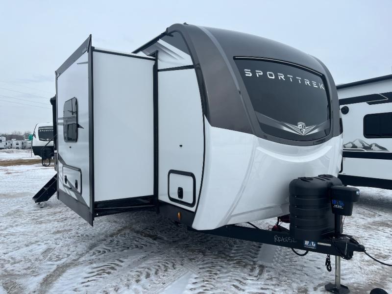 An elegant design and new features come with every one of these Venture RV SportTrek Touring Edition travel trailers! The NXG Huck bolt frame holds these units together and a walkable roof covers them. Heads will turn down the highway and at the campsite with an upgraded graphics package and a painted fiberglass front cap with integrated LED light. The exterior pass-through storage area has slam latch baggage doors with magnetic catches so you don't have to worry about them closing on you and a motion activated light to see your items clearly even at night. Luxury abounds throughout these units, especially with the mandatory Interior Luxury package which comes with solid surface kitchen countertops, designer valances with fabric nightshades, two 30" frameless fireplaces, and Beauflor wood plank flooring that is easy to clean. Come find your favorite model today!