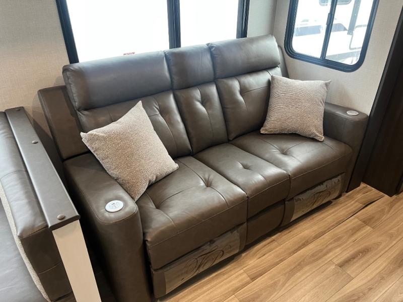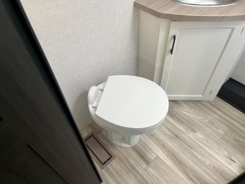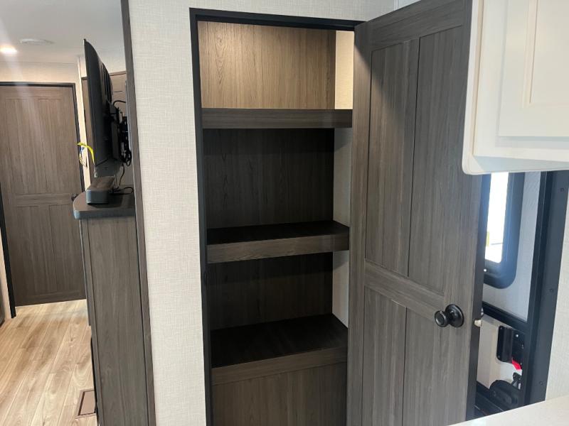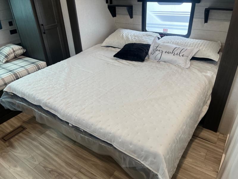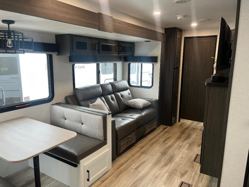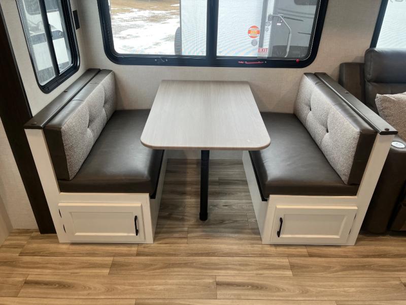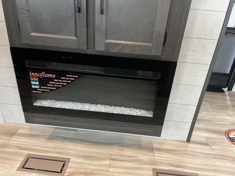 This travel trailer is perfect for two people who want to escape from everyday life! The front private bedroom has a 70" x 80" Sleep Tight king bed slide for more interior space, a dresser with a 30" frameless fireplace and TV, and a window seat to read a book with a view. Freshen up each morning in the full bathroom with the 30" x 36" shower then head to the rear kitchen to fry up some eggs on the three burner cooktop. The Sit N' Slide table offers a comfortable place to enjoy your meals, play card games, and even transform into an extra sleeping space. Grab a snack from the walk-in pantry and relax on the 70" tri-fold sofa across from the entertainment center with a 30" frameless fireplace!