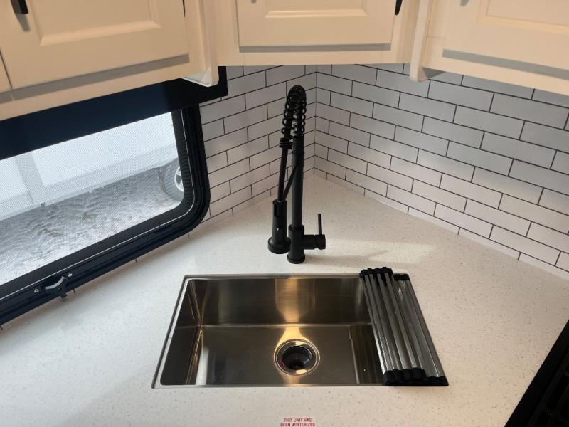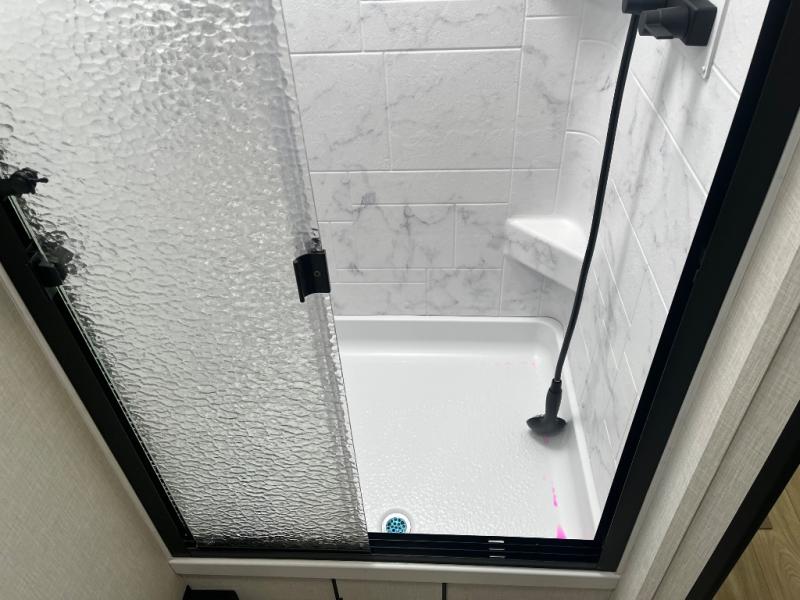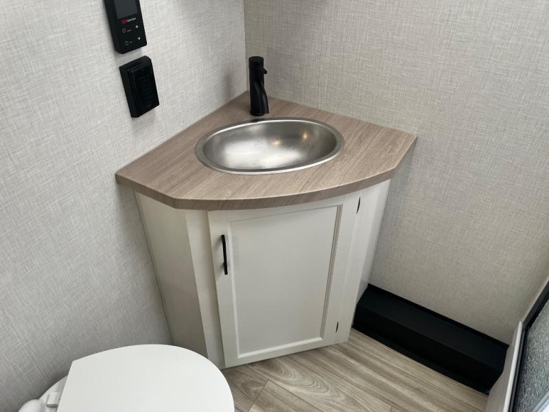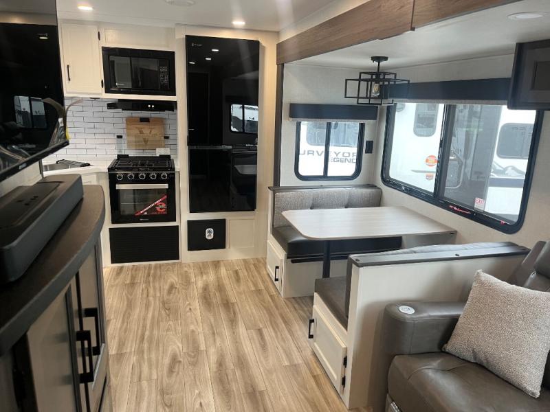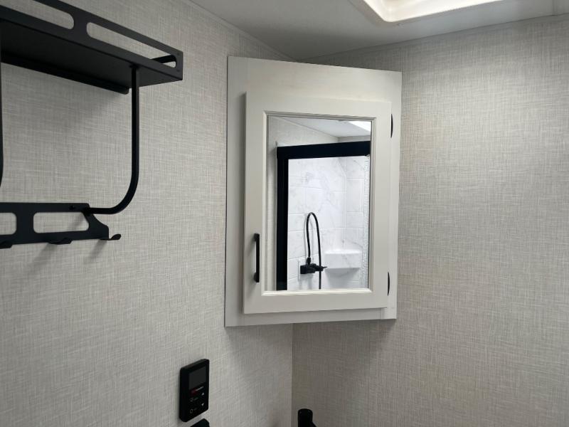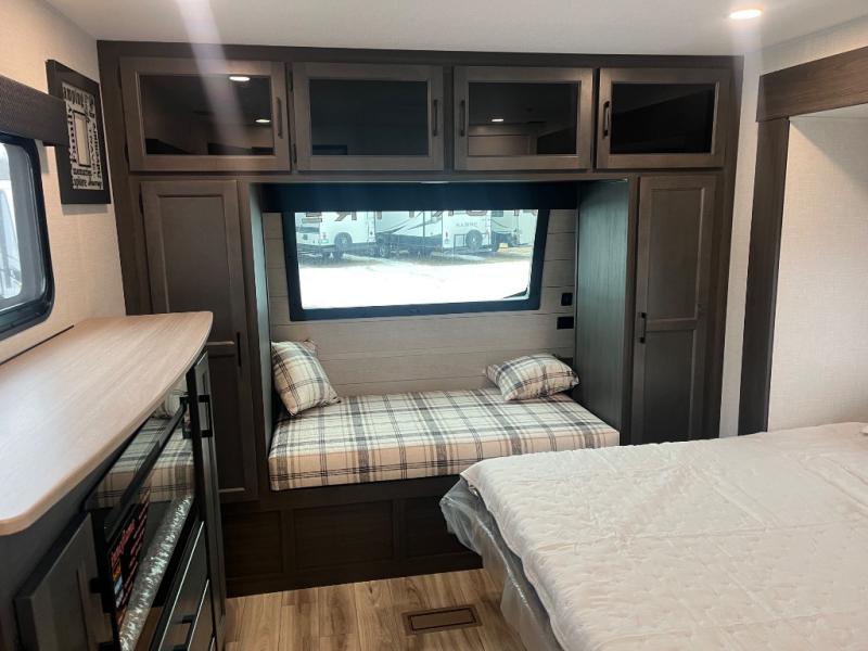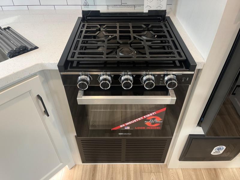 This travel trailer is perfect for two people who want to escape from everyday life! The front private bedroom has a 70" x 80" Sleep Tight king bed slide for more interior space, a dresser with a 30" frameless fireplace and TV, and a window seat to read a book with a view. Freshen up each morning in the full bathroom with the 30" x 36" shower then head to the rear kitchen to fry up some eggs on the three burner cooktop. The Sit N' Slide table offers a comfortable place to enjoy your meals, play card games, and even transform into an extra sleeping space. Grab a snack from the walk-in pantry and relax on the 70" tri-fold sofa across from the entertainment center with a 30" frameless fireplace!