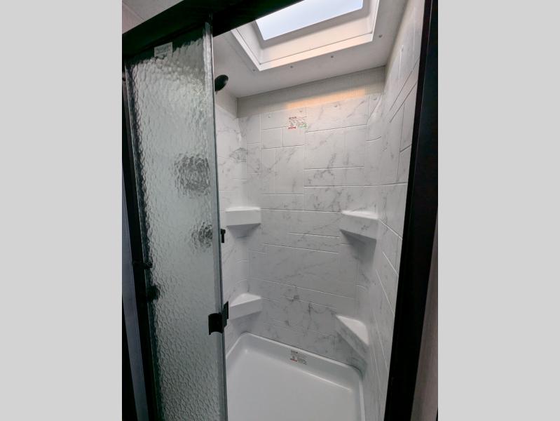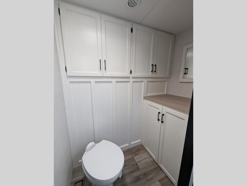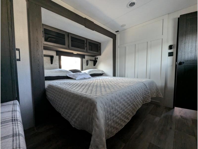 Pack your bags for an adventure of a lifetime with your spouse in this travel trailer! The front private bedroom has a 70" x 80" Sleep Tight king bed slide for more interior space, a dresser with a 30" frameless fireplace and TV, and a window seat to read a book with a view. Freshen up each morning in the rear full bathroom with the 30" x 36" shower, and store your linens in the three door linen closet, then head to the fully equipped kitchen to fry up some eggs on the three burner cooktop. The Sit N' Slide table offers a comfortable place to enjoy your meals, play card games, and even transform into an extra sleeping space. Grab a snack from the walk-in pantry with coat hooks and relax on the 70" tri-fold sofa bed across from the entertainment center with a 30" frameless fireplace!