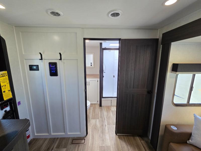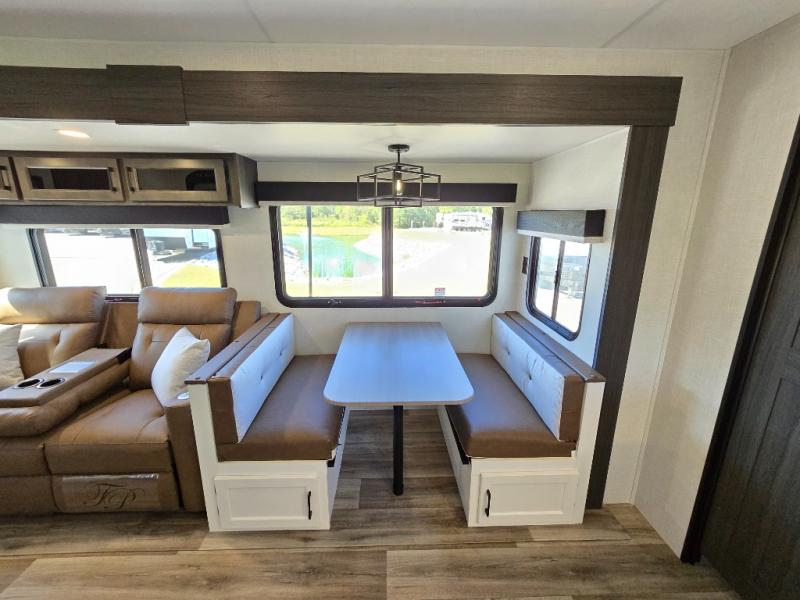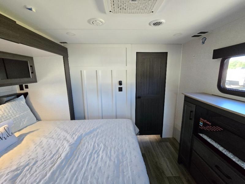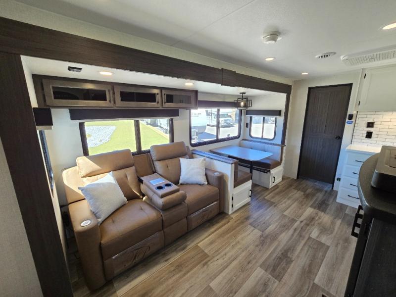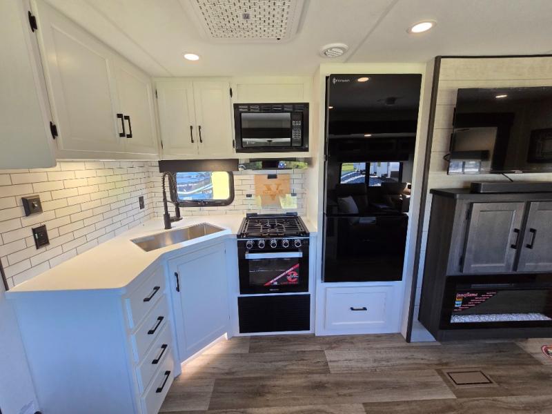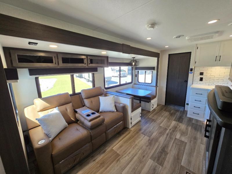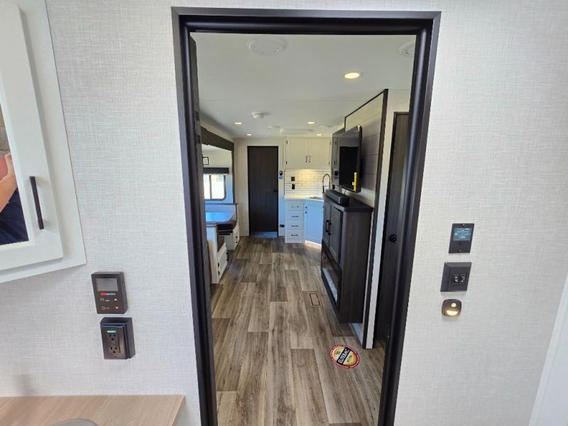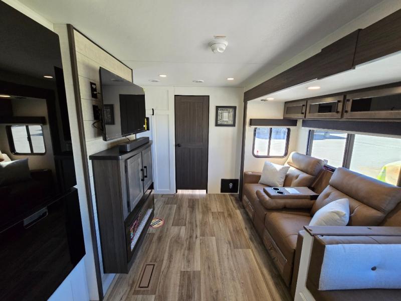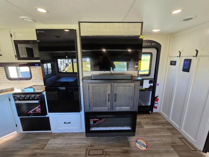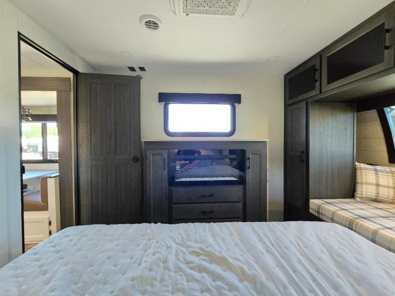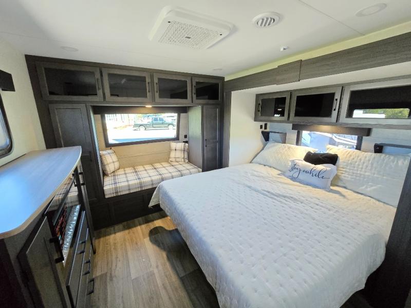Pack your bags for an adventure of a lifetime with your spouse in this travel trailer! The front private bedroom has a 70" x 80" Sleep Tight king bed slide for more interior space, a dresser with a 30" frameless fireplace and TV, and a window seat to read a book with a view. Freshen up each morning in the rear full bathroom with the 30" x 36" shower, and store your linens in the three door linen closet, then head to the fully equipped kitchen to fry up some eggs on the three burner cooktop. The Sit N' Slide table offers a comfortable place to enjoy your meals, play card games, and even transform into an extra sleeping space. Grab a snack from the walk-in pantry with coat hooks and relax on the 70" tri-fold sofa bed across from the entertainment center with a 30" frameless fireplace!