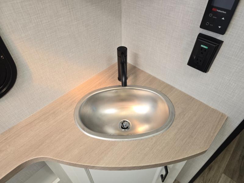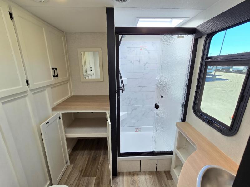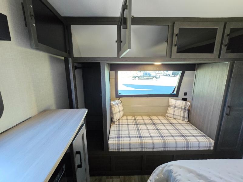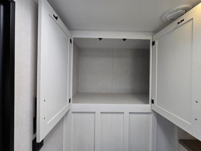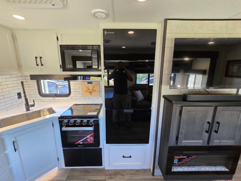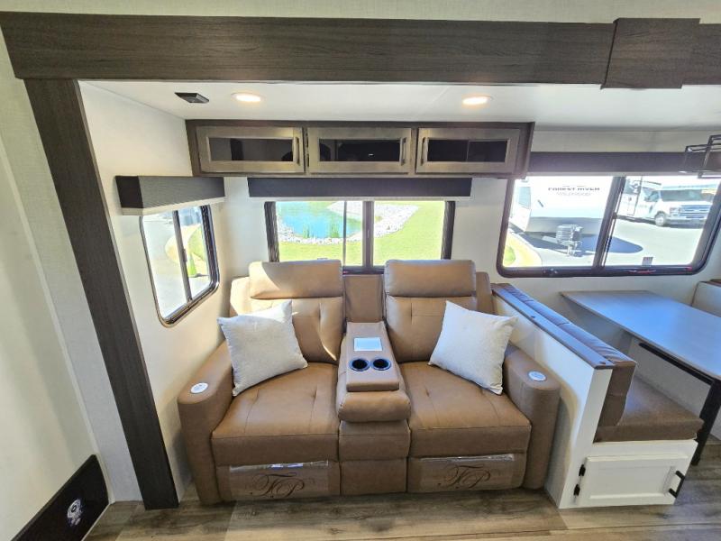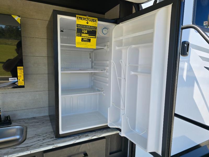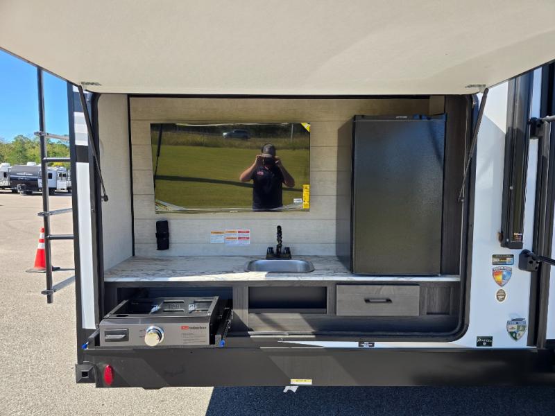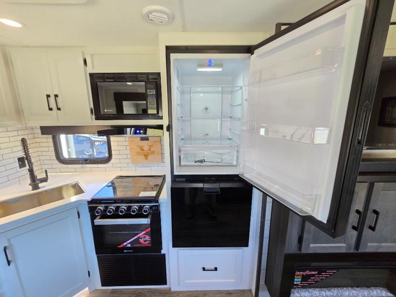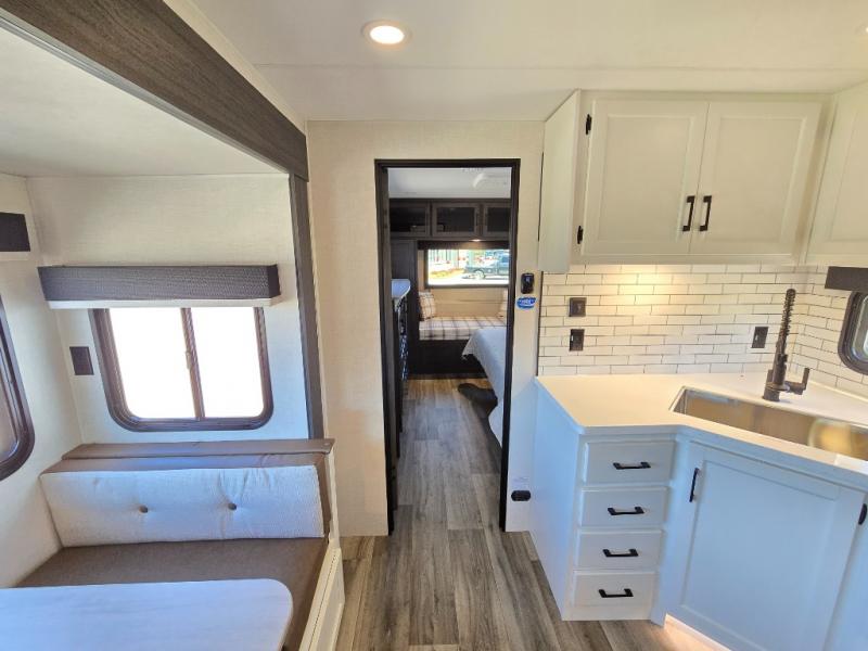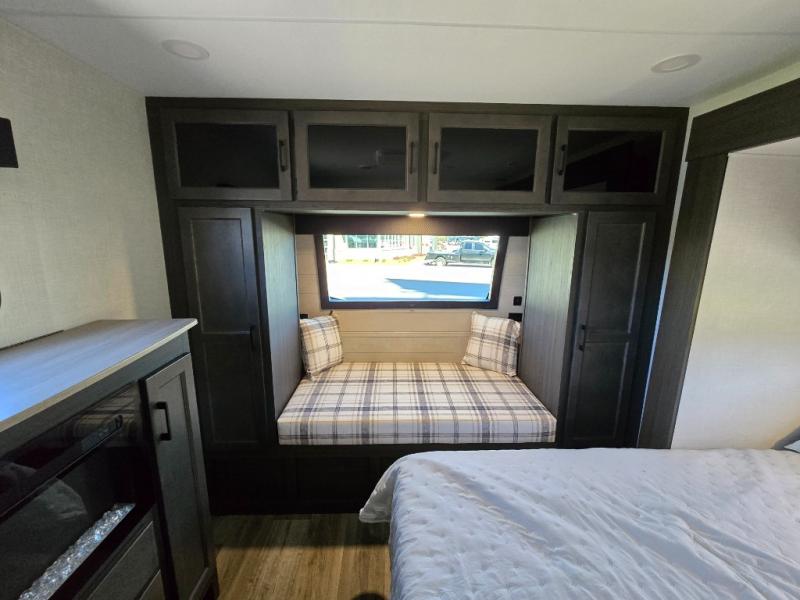 Pack your bags for an adventure of a lifetime with your spouse in this travel trailer! The front private bedroom has a 70" x 80" Sleep Tight king bed slide for more interior space, a dresser with a 30" frameless fireplace and TV, and a window seat to read a book with a view. Freshen up each morning in the rear full bathroom with the 30" x 36" shower, and store your linens in the three door linen closet, then head to the fully equipped kitchen to fry up some eggs on the three burner cooktop. The Sit N' Slide table offers a comfortable place to enjoy your meals, play card games, and even transform into an extra sleeping space. Grab a snack from the walk-in pantry with coat hooks and relax on the 70" tri-fold sofa bed across from the entertainment center with a 30" frameless fireplace!