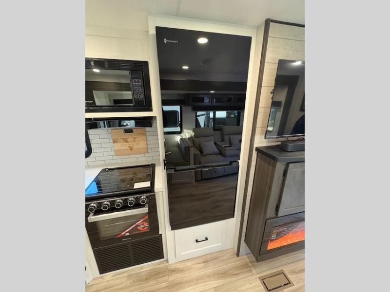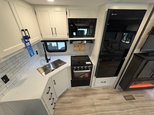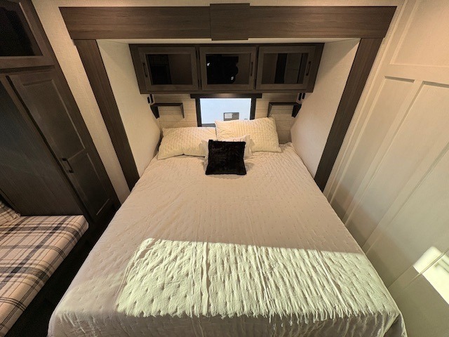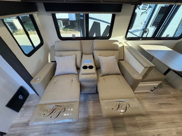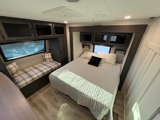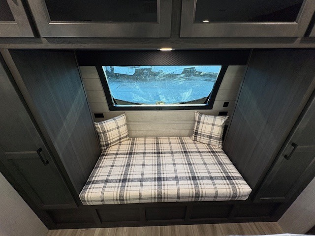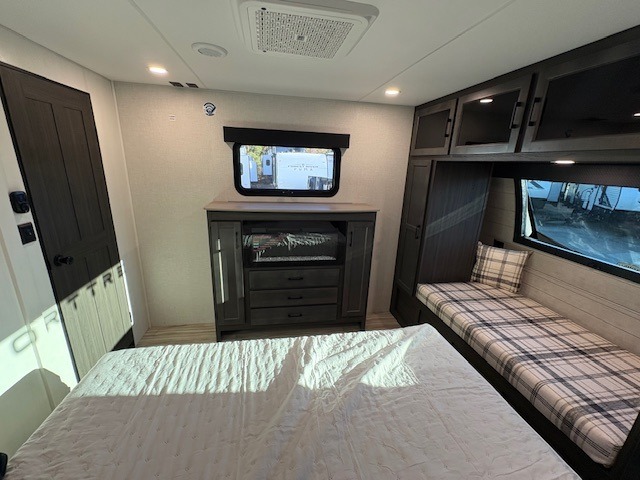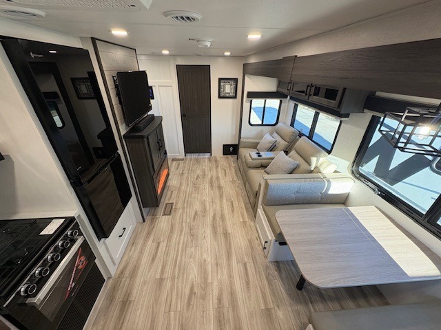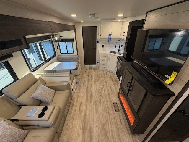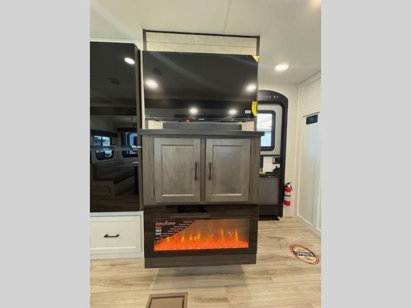 Pack your bags for an adventure of a lifetime with your spouse in this travel trailer! The front private bedroom has a 70" x 80" Sleep Tight king bed slide for more interior space, a dresser with a 30" frameless fireplace and TV, and a window seat to read a book with a view. Freshen up each morning in the rear full bathroom with the 30" x 36" shower, and store your linens in the three door linen closet, then head to the fully equipped kitchen to fry up some eggs on the three burner cooktop. The Sit N' Slide table offers a comfortable place to enjoy your meals, play card games, and even transform into an extra sleeping space. Grab a snack from the walk-in pantry with coat hooks and relax on the 70" tri-fold sofa bed across from the entertainment center with a 30" frameless fireplace!