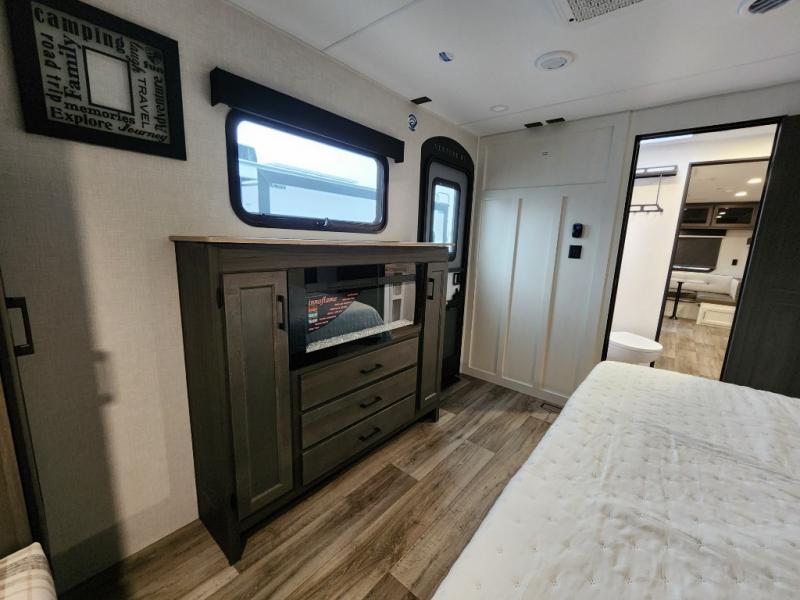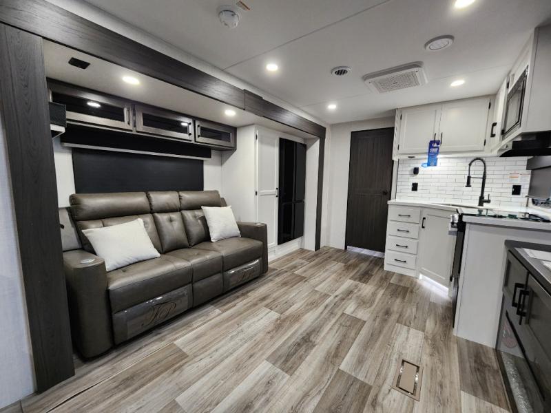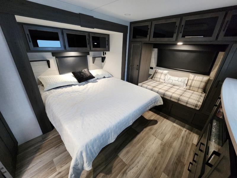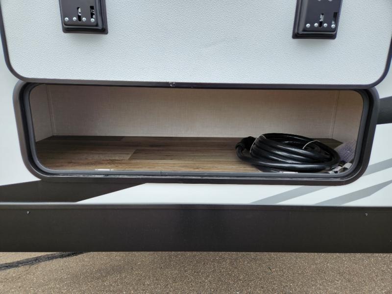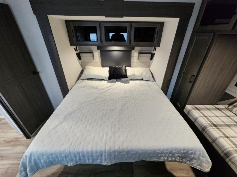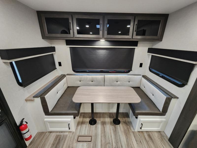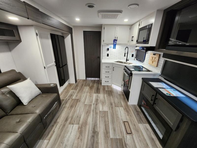 This travel trailer with dual entry doors allows you to enter in through the front master bedroom or the rear living area! You're sure to get a great night's rest on the king bed slide out, and you'll love the front bench seat with closets on either side for your things. There is also a dresser and a private door that leads to the walk-thru bath. Your crew can dine around the U-shaped dinette, relax on the 70" sofa slide out, and watch a movie with the Smart TV. There is also a fully equipped kitchen so you can make meals every day!