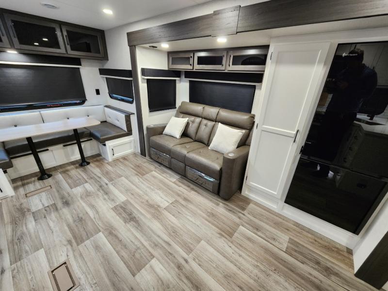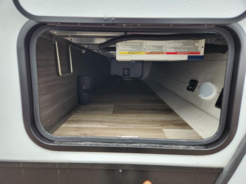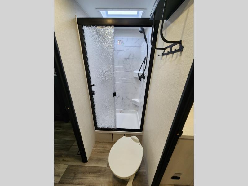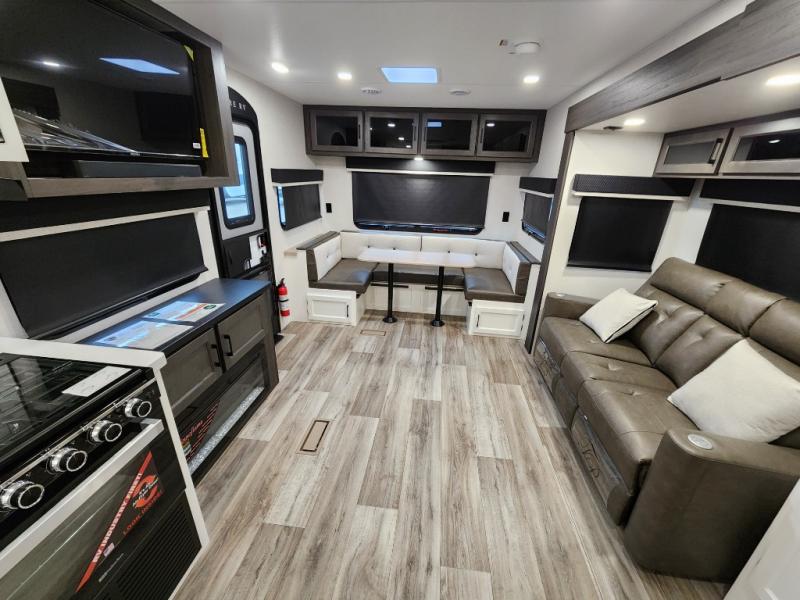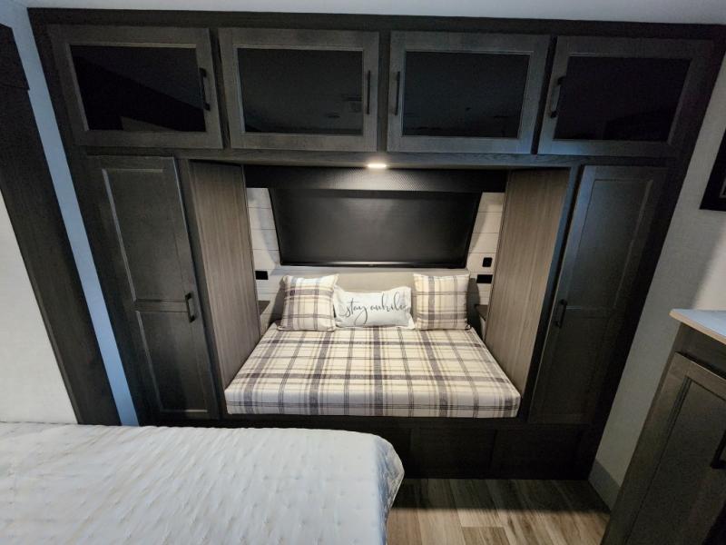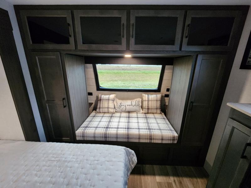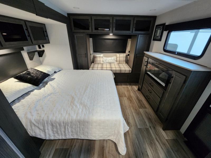This travel trailer with dual entry doors allows you to enter in through the front master bedroom or the rear living area! You're sure to get a great night's rest on the king bed slide out, and you'll love the front bench seat with closets on either side for your things. There is also a dresser and a private door that leads to the walk-thru bath. Your crew can dine around the U-shaped dinette, relax on the 70" sofa slide out, and watch a movie with the Smart TV. There is also a fully equipped kitchen so you can make meals every day!