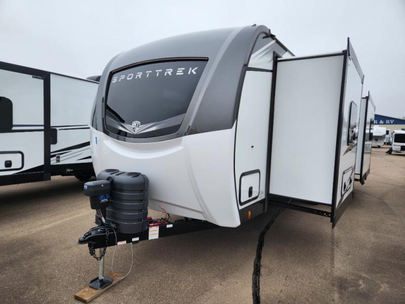 An elegant design and new features come with every one of these Venture RV SportTrek Touring Edition travel trailers! The NXG Huck bolt frame holds these units together and a walkable roof covers them. Heads will turn down the highway and at the campsite with an upgraded graphics package and a painted fiberglass front cap with integrated LED light. The exterior pass-through storage area has slam latch baggage doors with magnetic catches so you don't have to worry about them closing on you and a motion activated light to see your items clearly even at night. Luxury abounds throughout these units, especially with the mandatory Interior Luxury package which comes with solid surface kitchen countertops, designer valances with fabric nightshades, and Beauflor wood plank flooring that is easy to clean. Come find your favorite model today!
