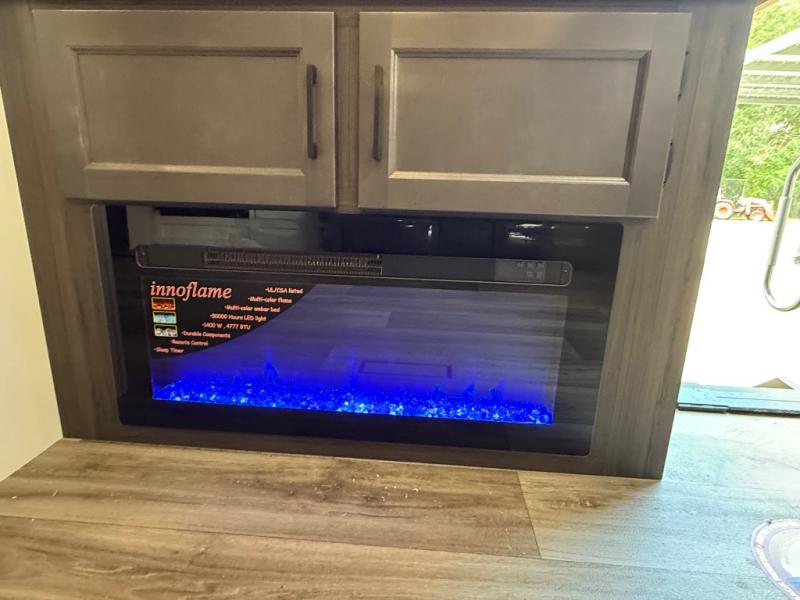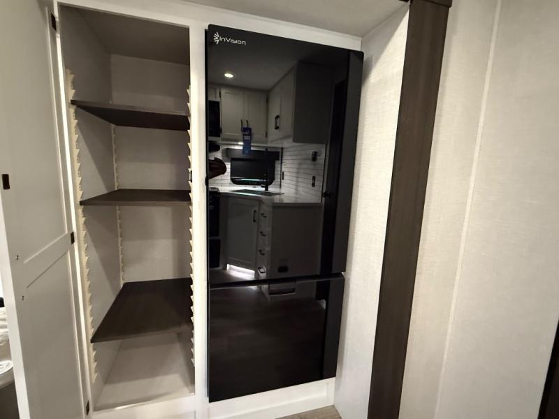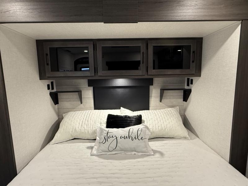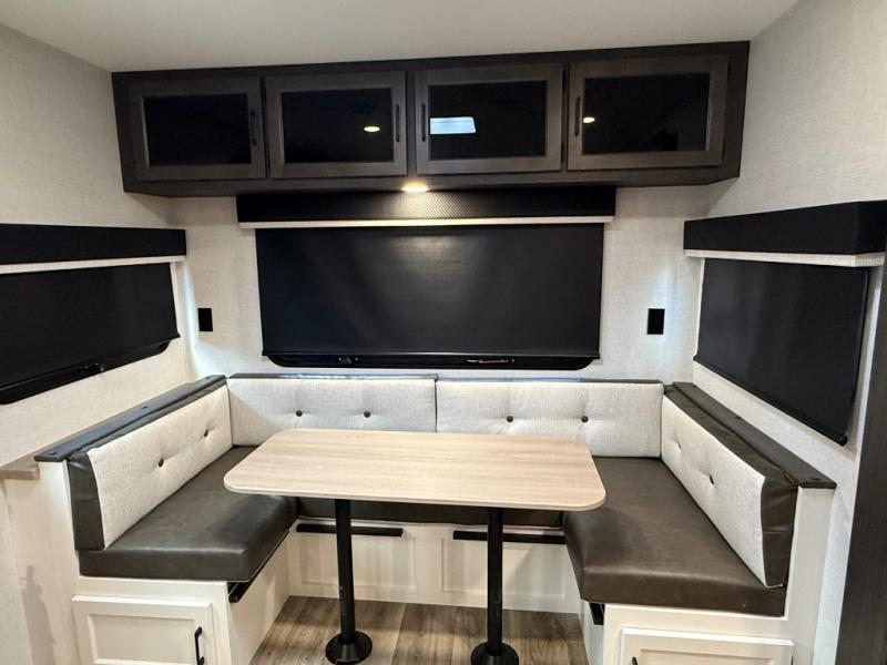 This travel trailer with dual entry doors allows you to enter in through the front master bedroom or the rear living area! You're sure to get a great night's rest on the king bed slide out, and you'll love the front bench seat with closets on either side for your things. There is also a dresser and a private door that leads to the walk-thru bath. Your crew can dine around the U-shaped dinette, relax on the 70" sofa slide out, and watch a movie with the Smart TV. There is also a fully equipped kitchen so you can make meals every day!