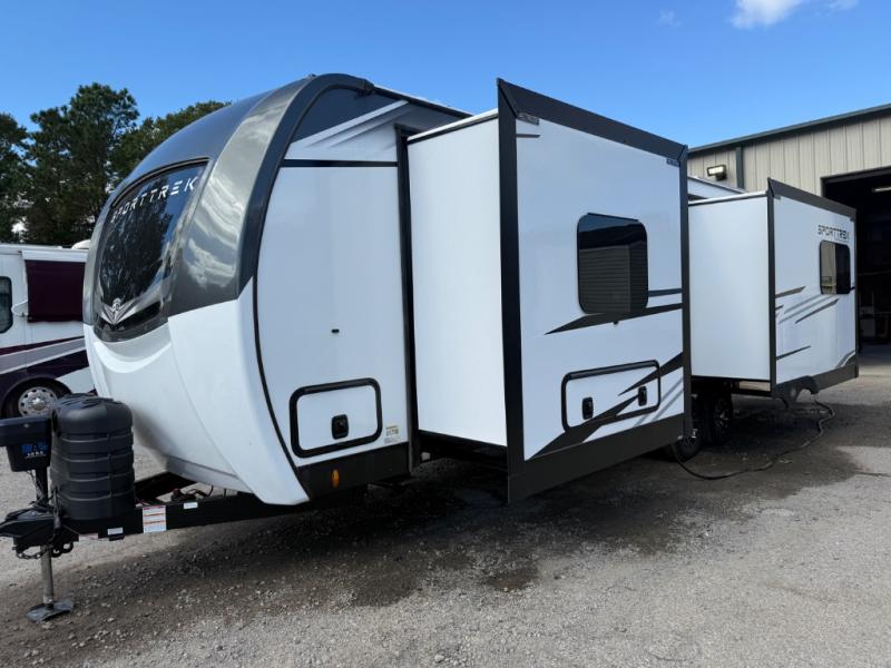 An elegant design and new features come with every one of these Venture RV SportTrek Touring Edition travel trailers! The NXG Huck bolt frame holds these units together and a walkable roof covers them. Heads will turn down the highway and at the campsite with an upgraded graphics package and a painted fiberglass front cap with integrated LED light. The exterior pass-through storage area has slam latch baggage doors with magnetic catches so you don't have to worry about them closing on you and a motion activated light to see your items clearly even at night. Luxury abounds throughout these units, especially with the mandatory Interior Luxury package which comes with solid surface kitchen countertops, designer valances with fabric nightshades, and Beauflor wood plank flooring that is easy to clean. Come find your favorite model today!