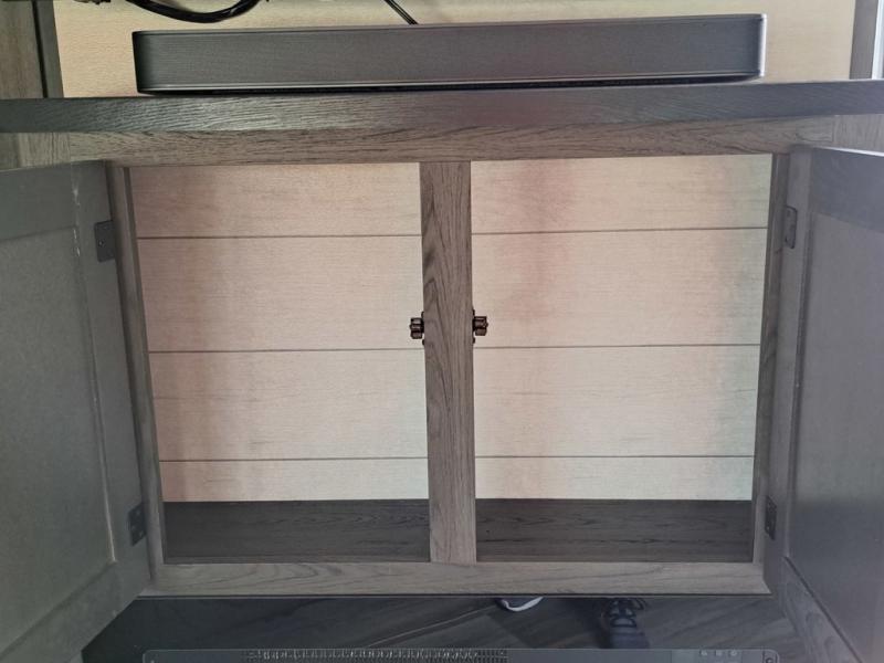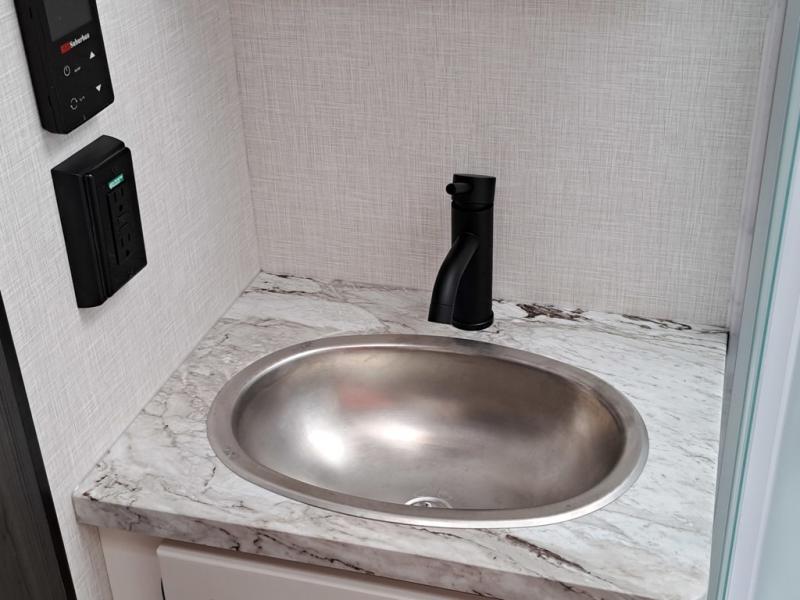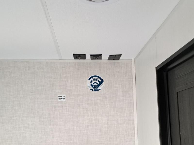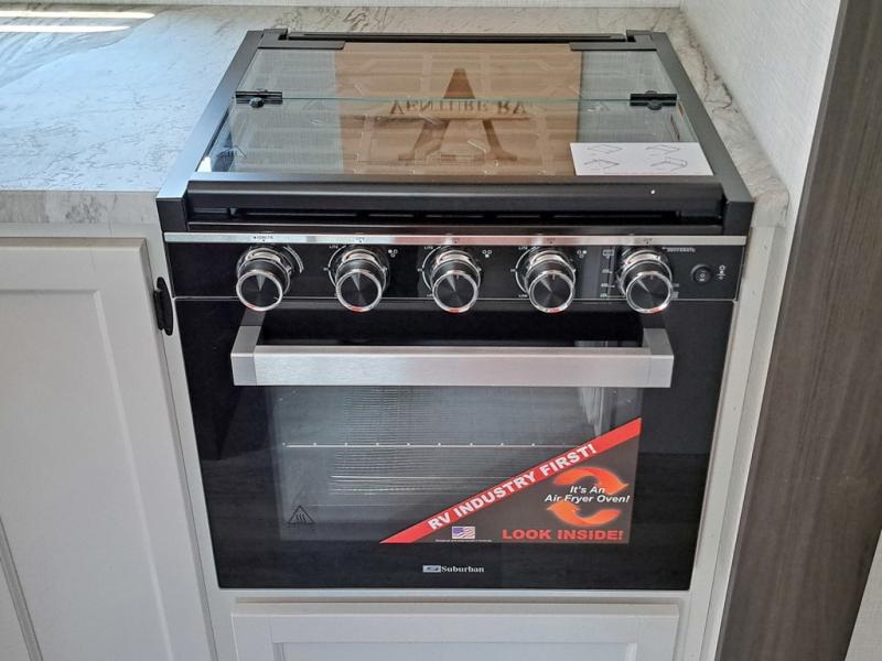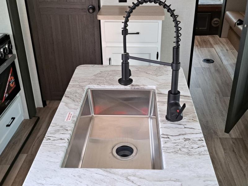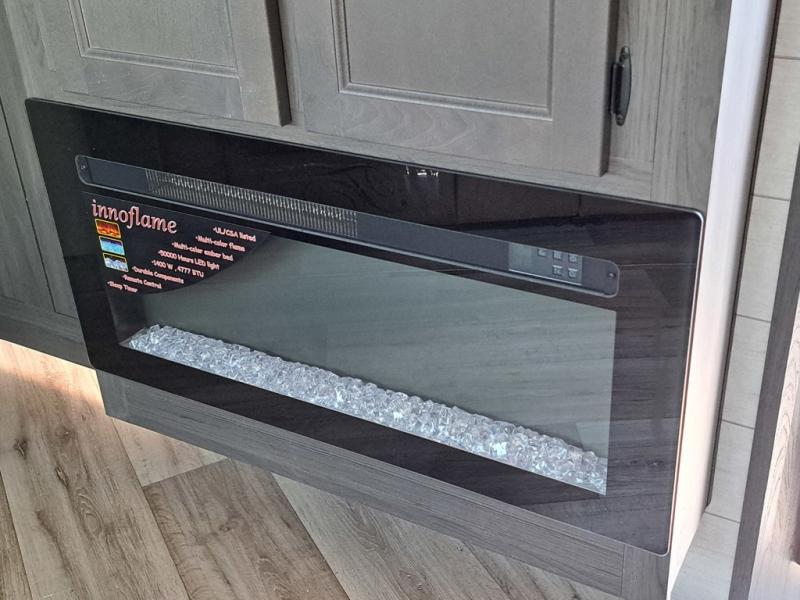 Comfort and convenience is what you will find all throughout this travel trailer! The front kitchen has a large single-bowl under-mount stainless steel sink with lots of countertop space on either side of it, a three burner cooktop, a 10 cu. ft. refrigerator to keep your perishables fresh, a pantry for your snacks, and a kitchen island to make meal prepping even easier. You can enjoy your meals at the table and chairs then relax on either the 64" sofa or theater seating with USB charging ports. You will feel right at home in the rear private bedroom with a 70" x 80" Sleep Tight king bed slide, a dresser with a 30" frameless fireplace, and a wardrobe that is prepped to add an optional washer and dryer, plus you even have an entrance/exit door to the unit with triple pull-out aluminum steps. There is an exterior campfire café with a refrigerator, a sink with countertop space, and a griddle for juicy burgers!