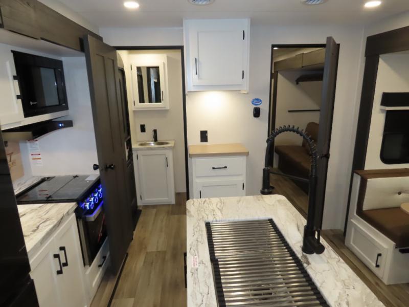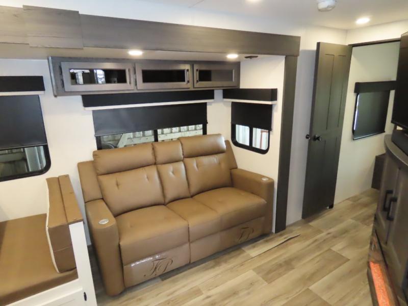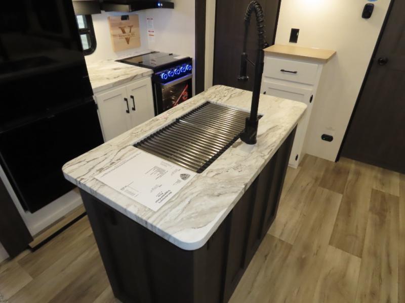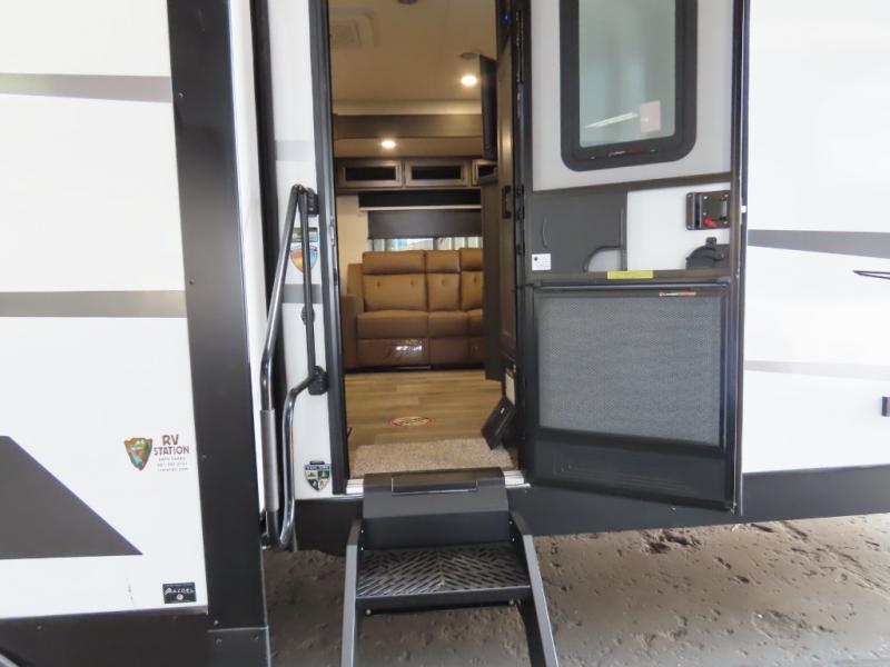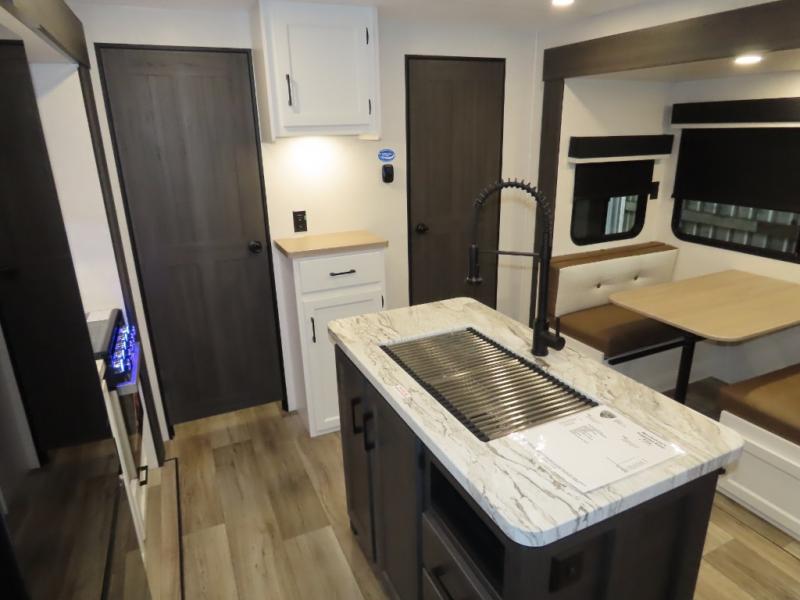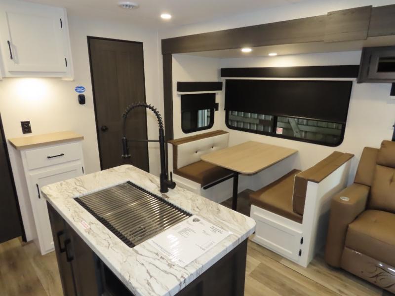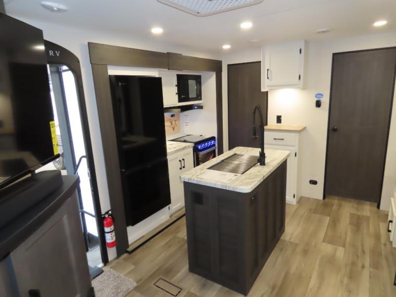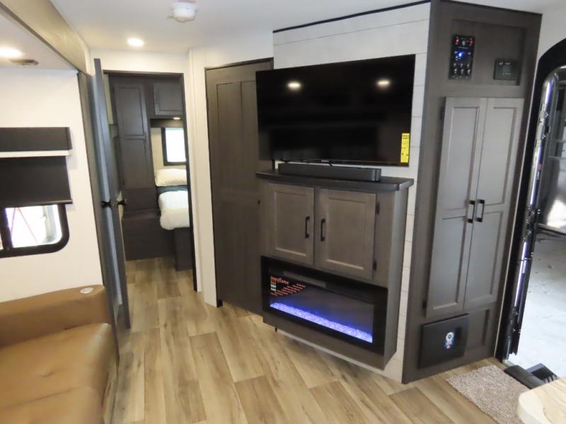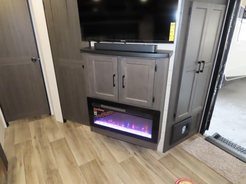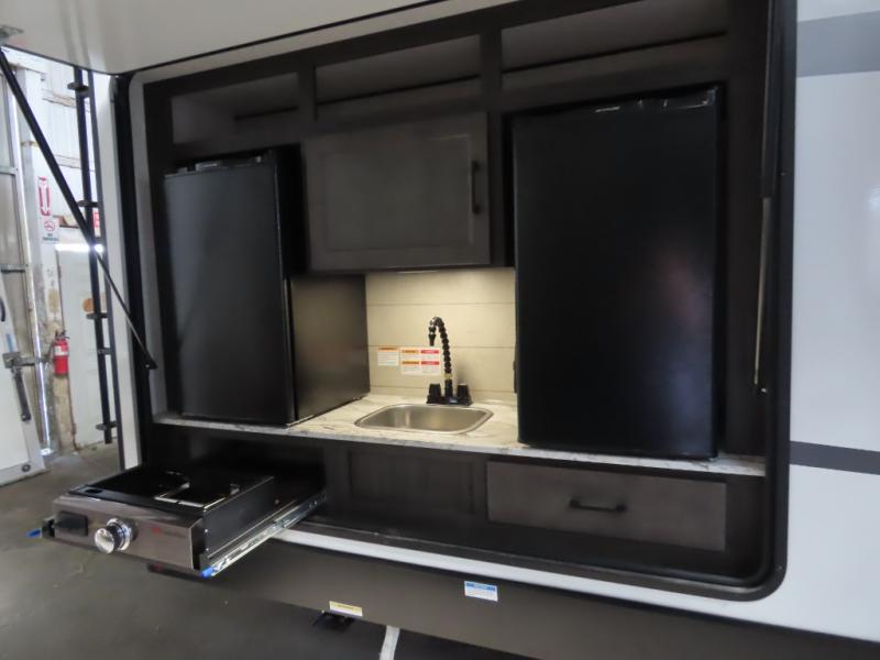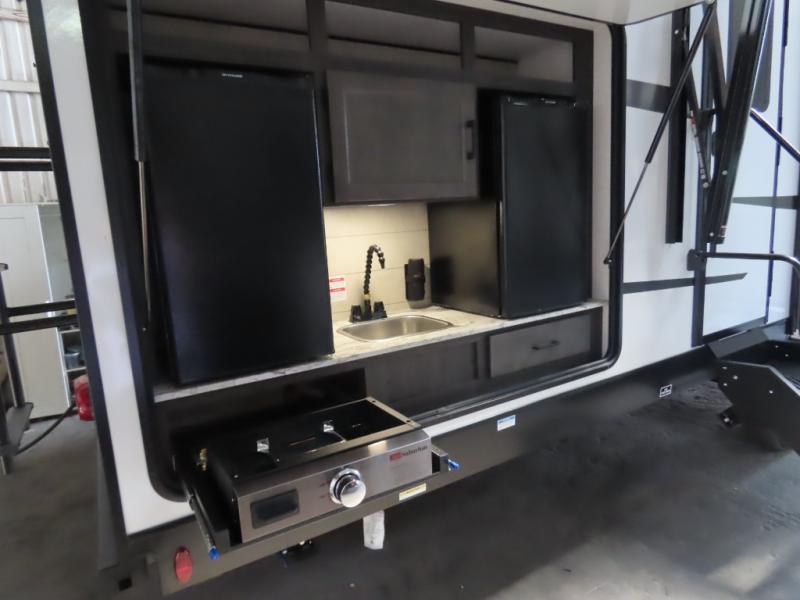 Comfort and convenience is what you will find all throughout this travel trailer! The front kitchen has a large single-bowl under-mount stainless steel sink with lots of countertop space on either side of it, a three burner cooktop, a 10 cu. ft. refrigerator to keep your perishables fresh, a pantry for your snacks, and a kitchen island to make meal prepping even easier. You can enjoy your meals at the table and chairs then relax on either the 64" sofa or theater seating with USB charging ports. You will feel right at home in the rear private bedroom with a 70" x 80" Sleep Tight king bed slide, a dresser with a 30" frameless fireplace, and a wardrobe that is prepped to add an optional washer and dryer, plus you even have an entrance/exit door to the unit with triple pull-out aluminum steps. There is an exterior campfire café with a refrigerator, a sink with countertop space, and a griddle for juicy burgers!