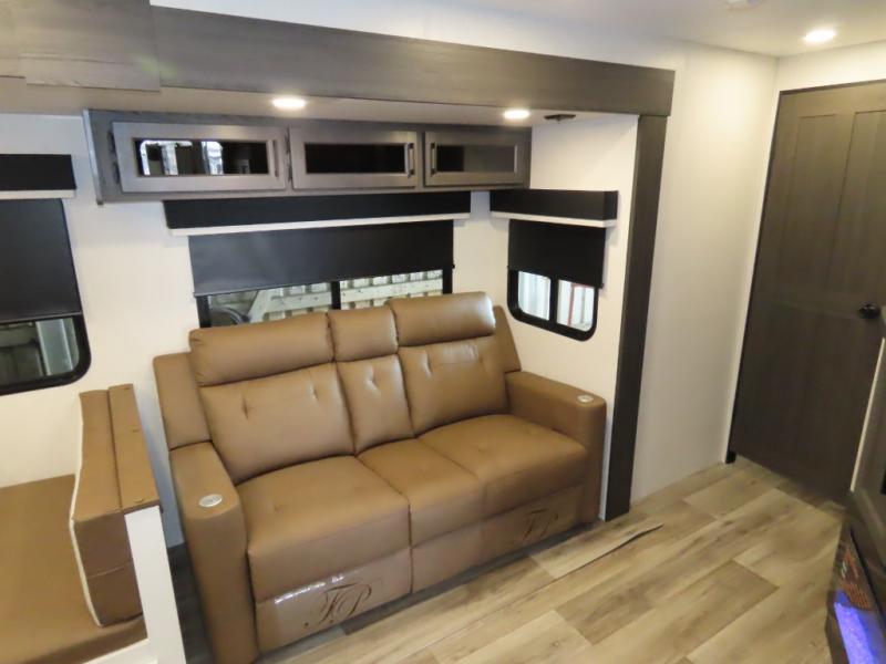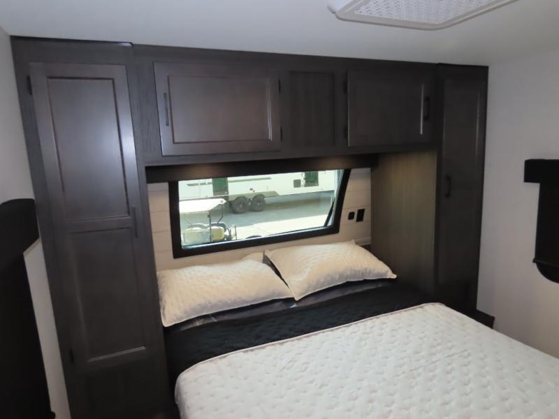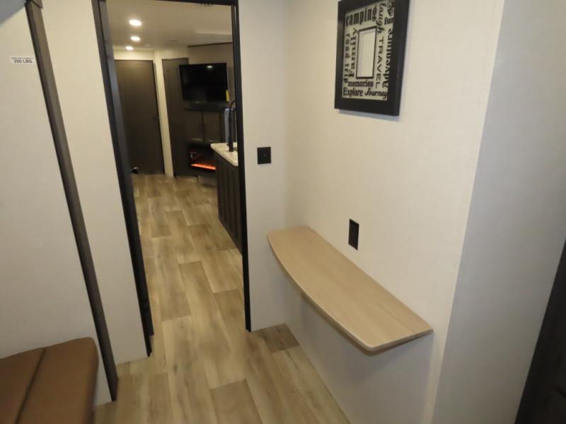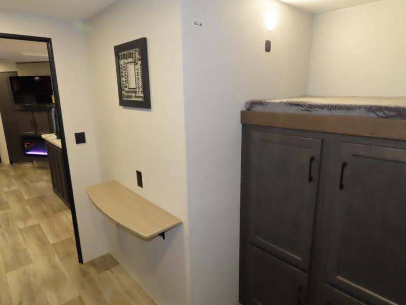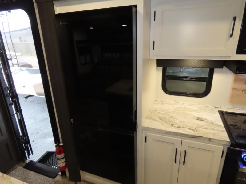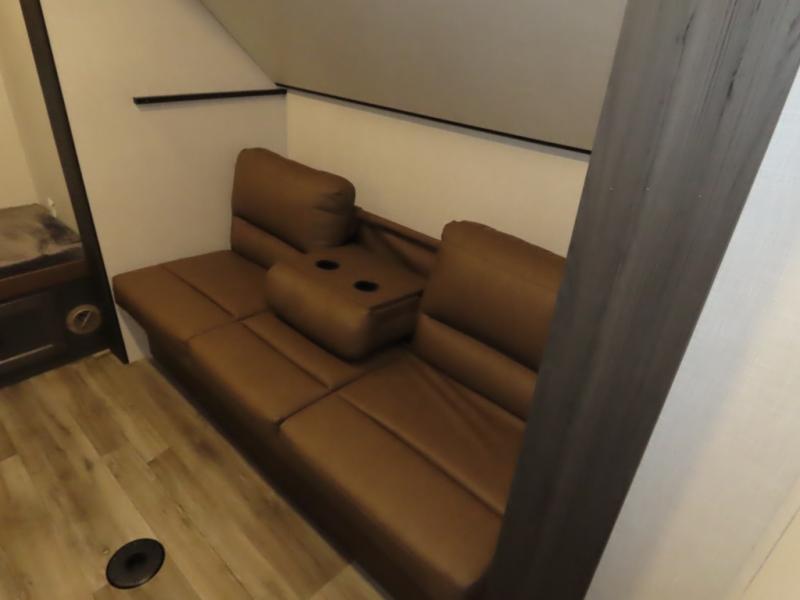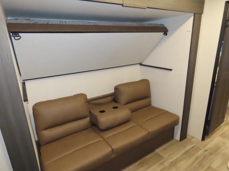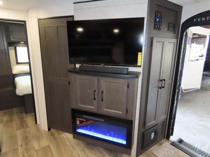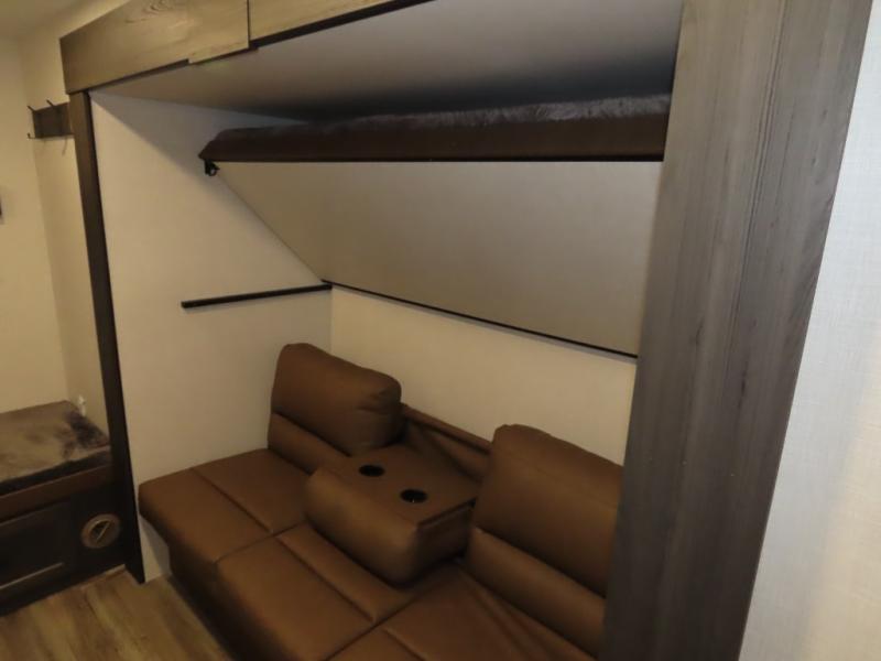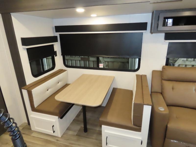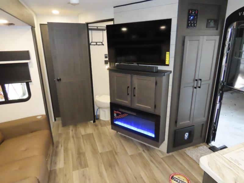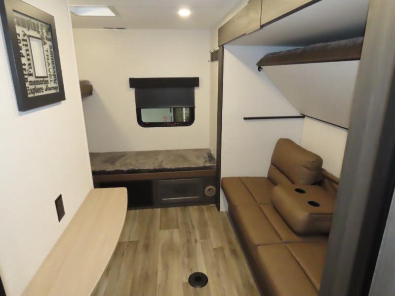 Comfort and convenience is what you will find all throughout this travel trailer! The front kitchen has a large single-bowl under-mount stainless steel sink with lots of countertop space on either side of it, a three burner cooktop, a 10 cu. ft. refrigerator to keep your perishables fresh, a pantry for your snacks, and a kitchen island to make meal prepping even easier. You can enjoy your meals at the table and chairs then relax on either the 64" sofa or theater seating with USB charging ports. You will feel right at home in the rear private bedroom with a 70" x 80" Sleep Tight king bed slide, a dresser with a 30" frameless fireplace, and a wardrobe that is prepped to add an optional washer and dryer, plus you even have an entrance/exit door to the unit with triple pull-out aluminum steps. There is an exterior campfire café with a refrigerator, a sink with countertop space, and a griddle for juicy burgers!