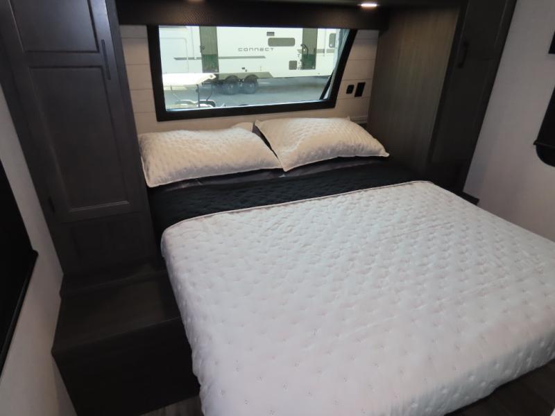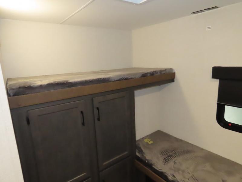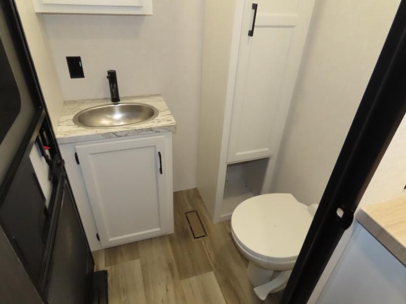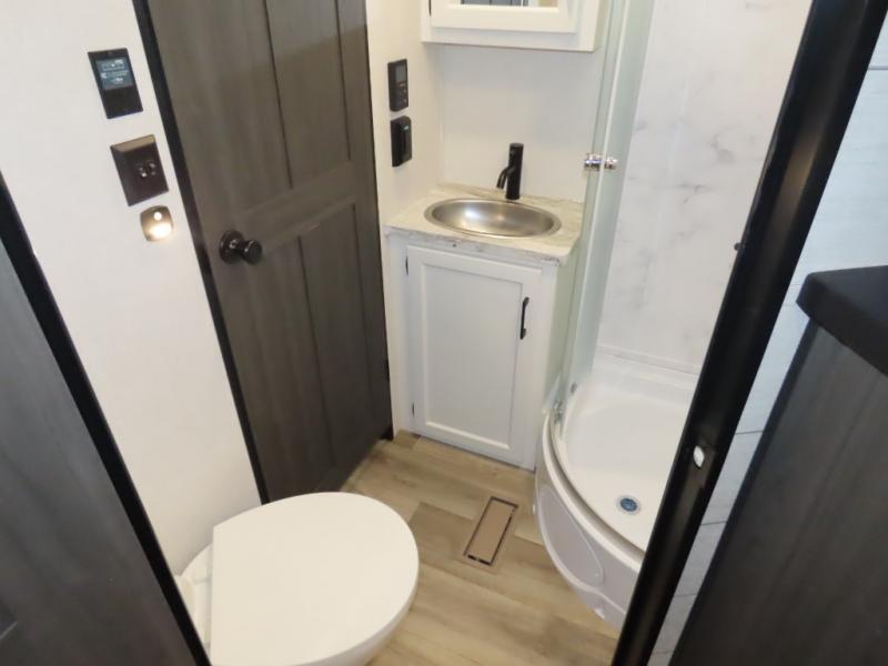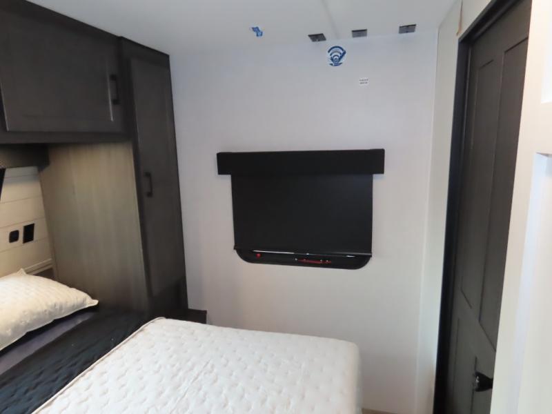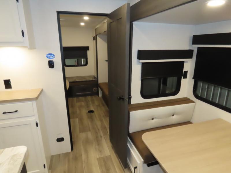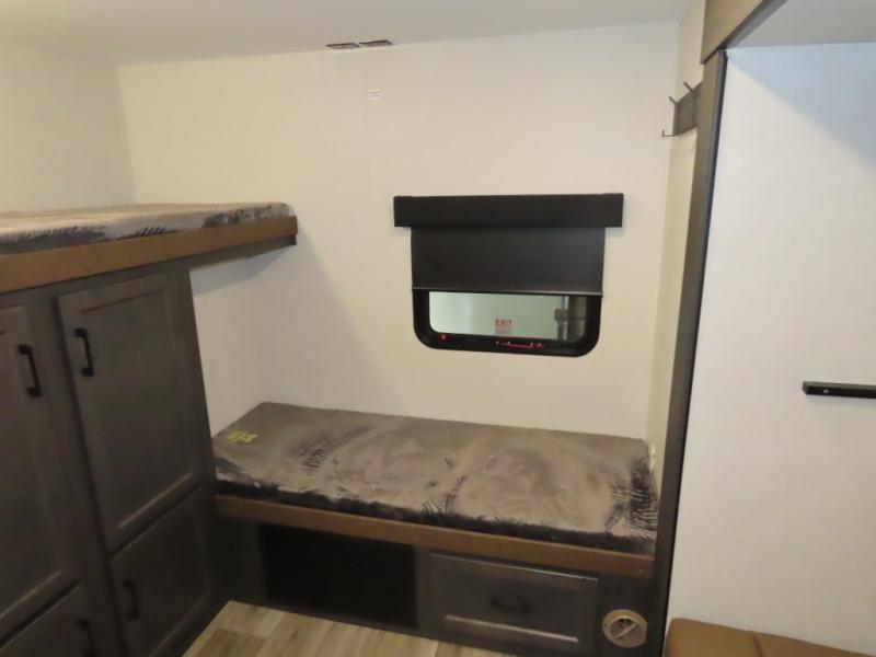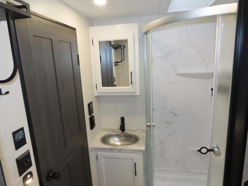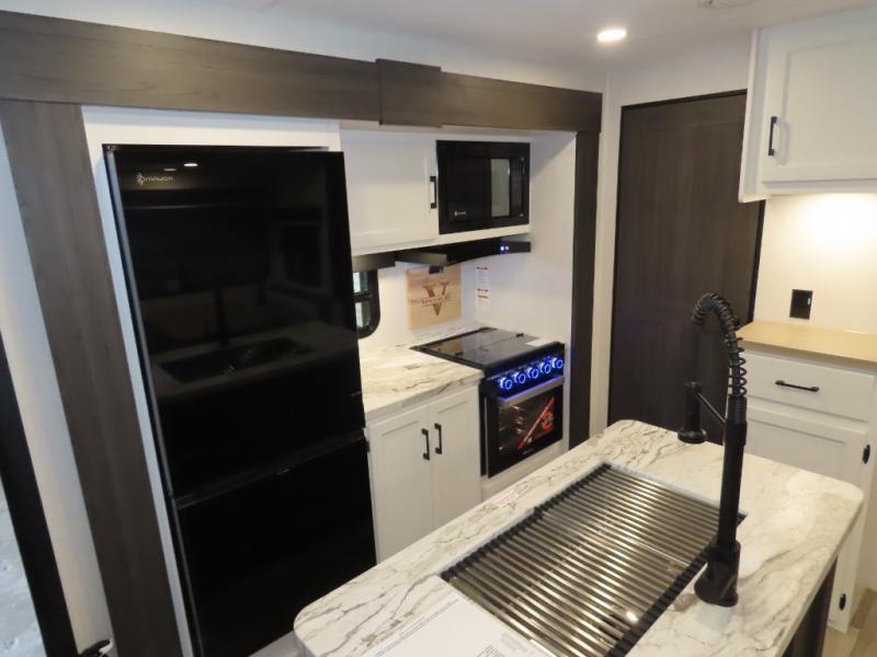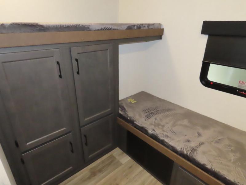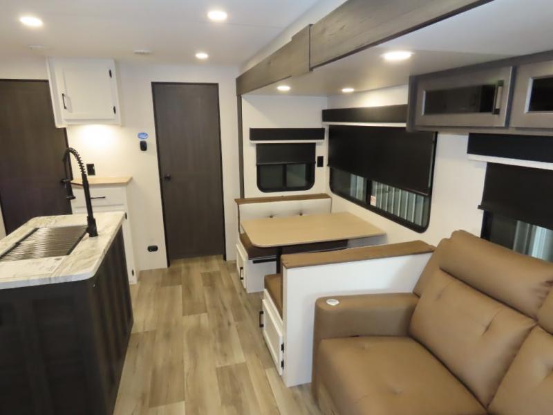 Comfort and convenience is what you will find all throughout this travel trailer! The front kitchen has a large single-bowl under-mount stainless steel sink with lots of countertop space on either side of it, a three burner cooktop, a 10 cu. ft. refrigerator to keep your perishables fresh, a pantry for your snacks, and a kitchen island to make meal prepping even easier. You can enjoy your meals at the table and chairs then relax on either the 64" sofa or theater seating with USB charging ports. You will feel right at home in the rear private bedroom with a 70" x 80" Sleep Tight king bed slide, a dresser with a 30" frameless fireplace, and a wardrobe that is prepped to add an optional washer and dryer, plus you even have an entrance/exit door to the unit with triple pull-out aluminum steps. There is an exterior campfire café with a refrigerator, a sink with countertop space, and a griddle for juicy burgers!