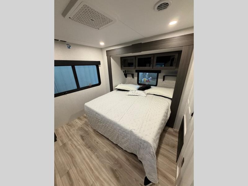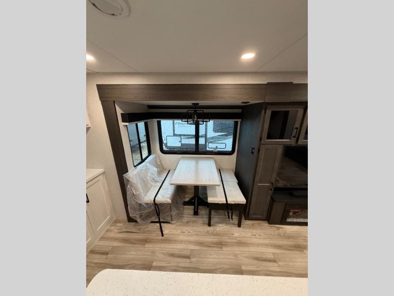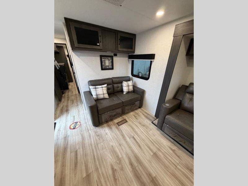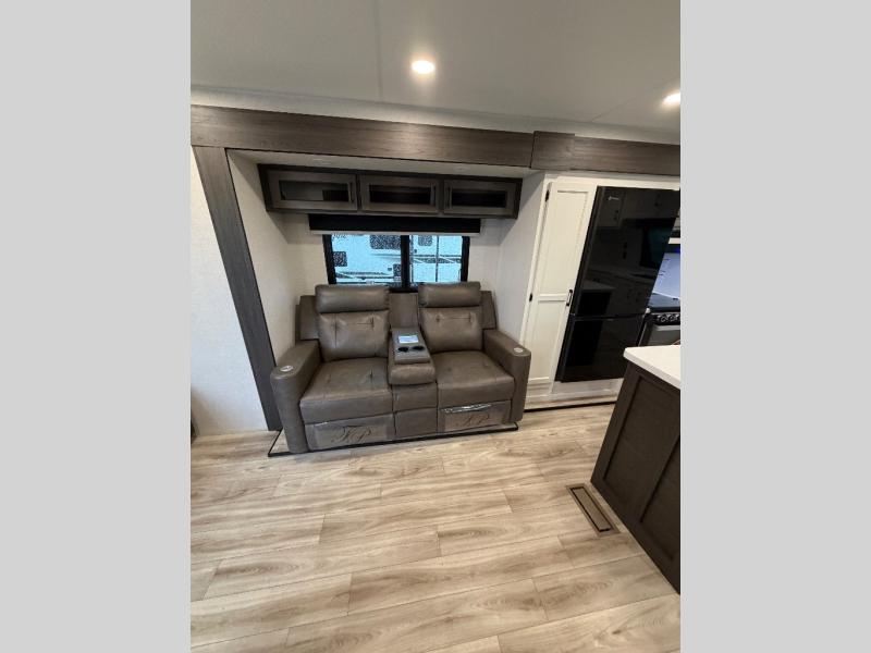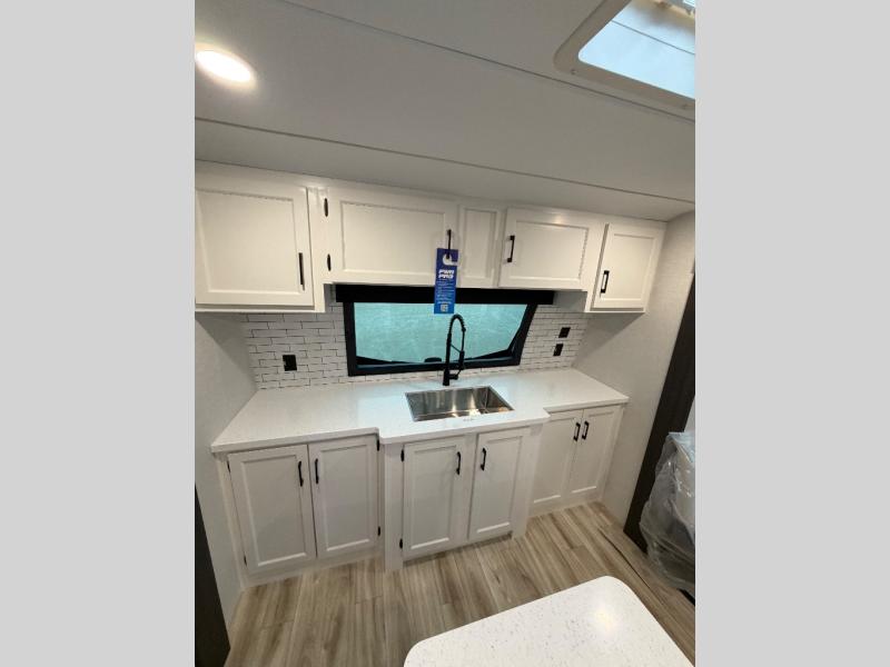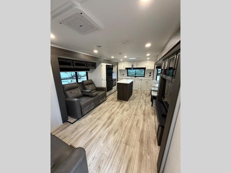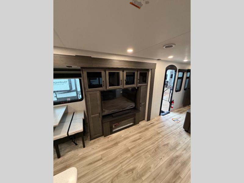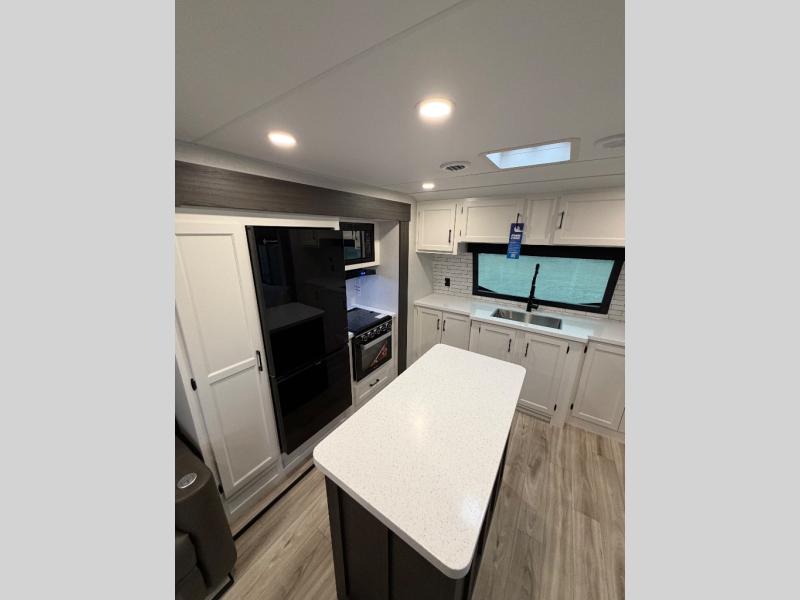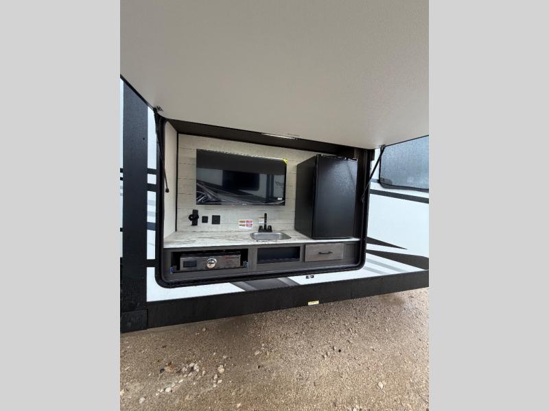 Comfort and convenience is what you will find all throughout this travel trailer! The front kitchen has a large single-bowl under-mount stainless steel sink with lots of countertop space on either side of it, a three burner cooktop, a 10 cu. ft. refrigerator to keep your perishables fresh, a pantry for your snacks, and a kitchen island to make meal prepping even easier. You can enjoy your meals at the table and chairs then relax on either the 64" sofa or theater seating with USB charging ports. You will feel right at home in the rear private bedroom with a 70" x 80" Sleep Tight king bed slide, a dresser with a 30" frameless fireplace, and a wardrobe that is prepped to add an optional washer and dryer, plus you even have an entrance/exit door to the unit with triple pull-out aluminum steps. There is an exterior campfire café with a refrigerator, a sink with countertop space, and a griddle for juicy burgers!