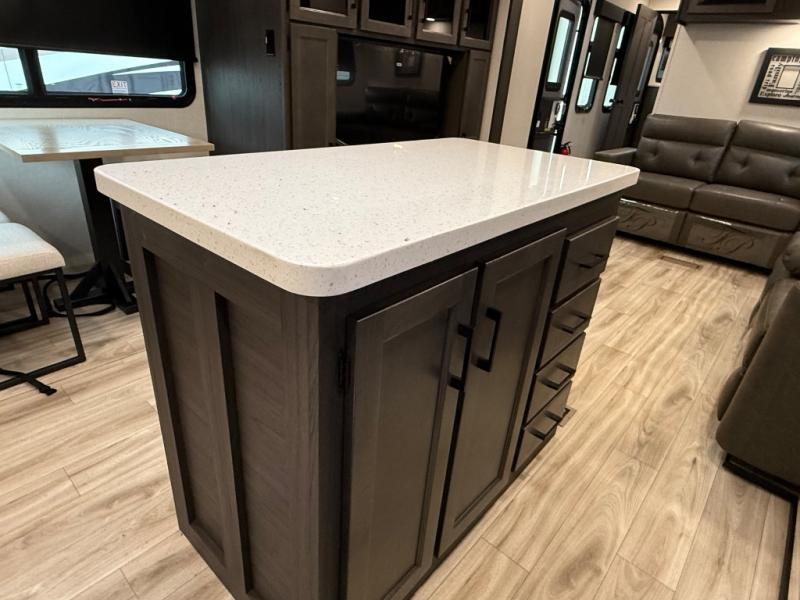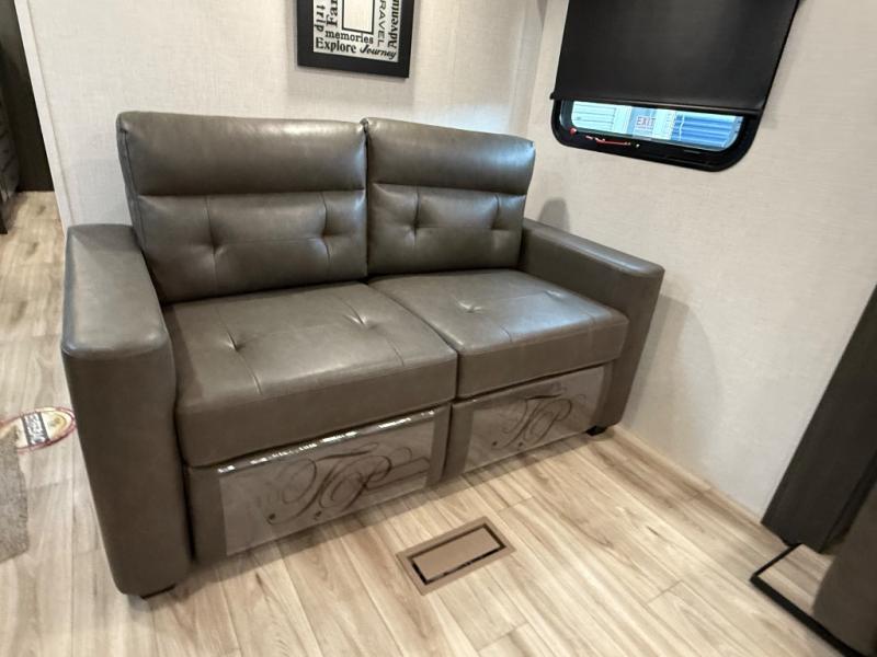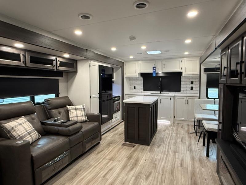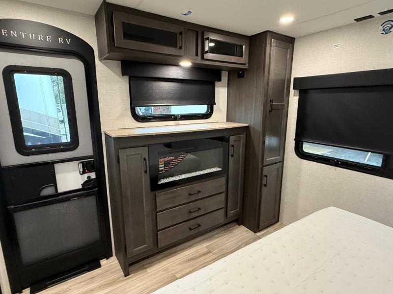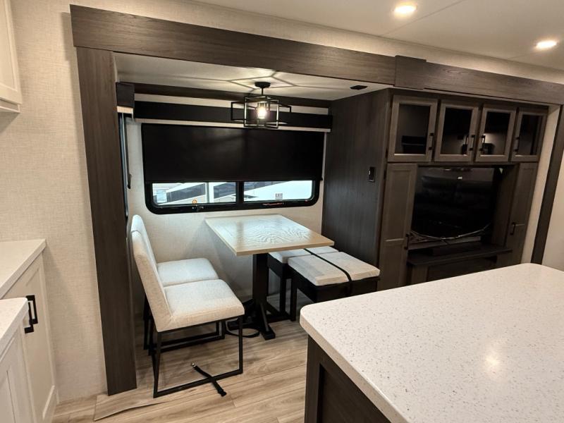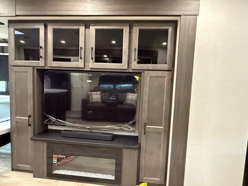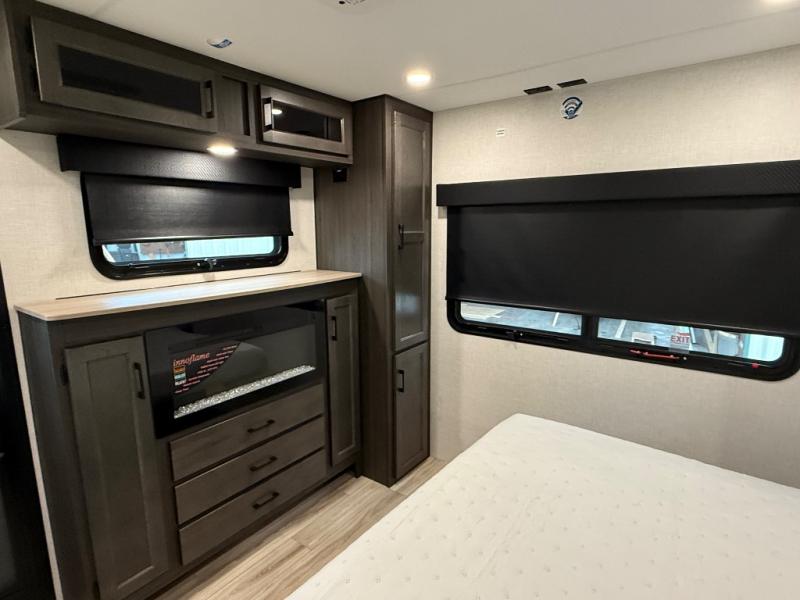 Comfort and convenience is what you will find all throughout this travel trailer! The front kitchen has a large single-bowl under-mount stainless steel sink with lots of countertop space on either side of it, a three burner cooktop, a 10 cu. ft. refrigerator to keep your perishables fresh, a pantry for your snacks, and a kitchen island to make meal prepping even easier. You can enjoy your meals at the table and chairs then relax on either the 64" sofa or theater seating with USB charging ports. You will feel right at home in the rear private bedroom with a 70" x 80" Sleep Tight king bed slide, a dresser with a 30" frameless fireplace, and a wardrobe that is prepped to add an optional washer and dryer, plus you even have an entrance/exit door to the unit with triple pull-out aluminum steps. There is an exterior campfire café with a refrigerator, a sink with countertop space, and a griddle for juicy burgers!
