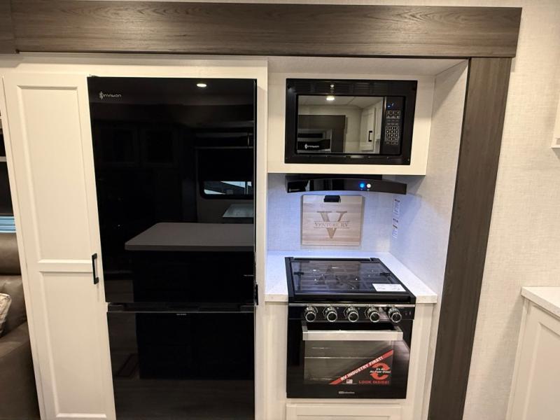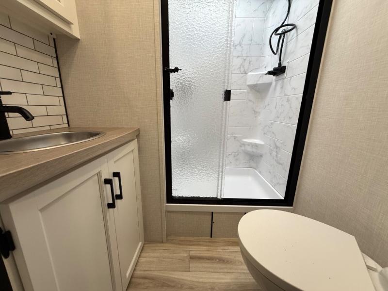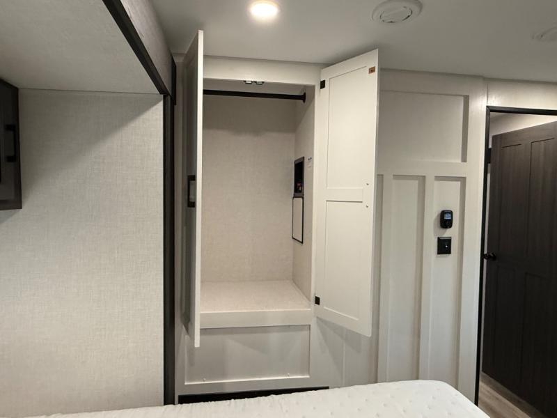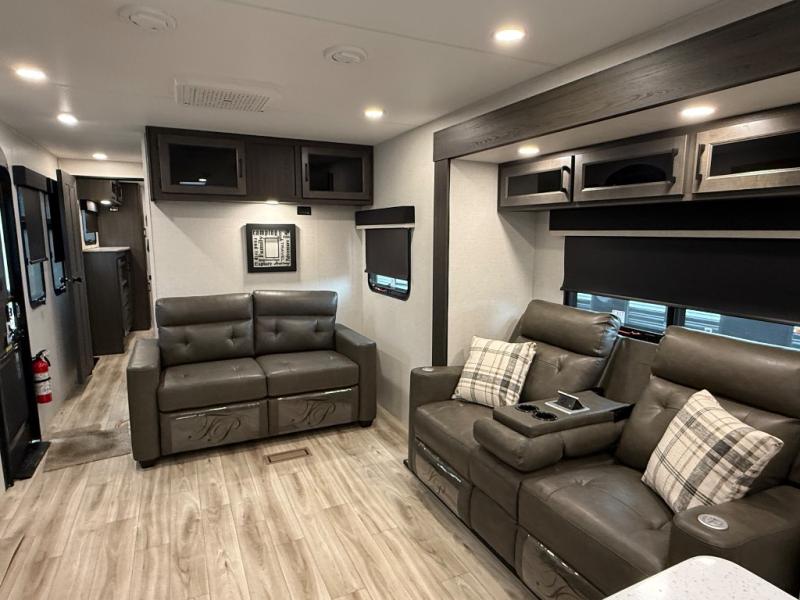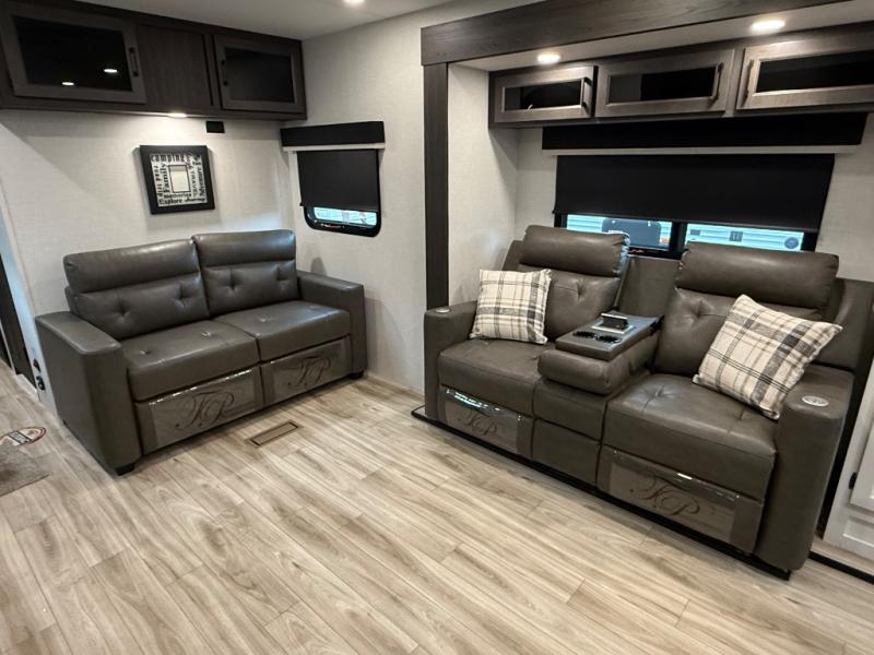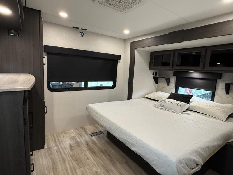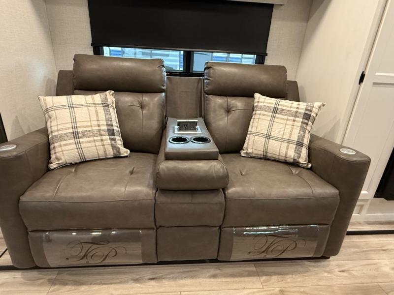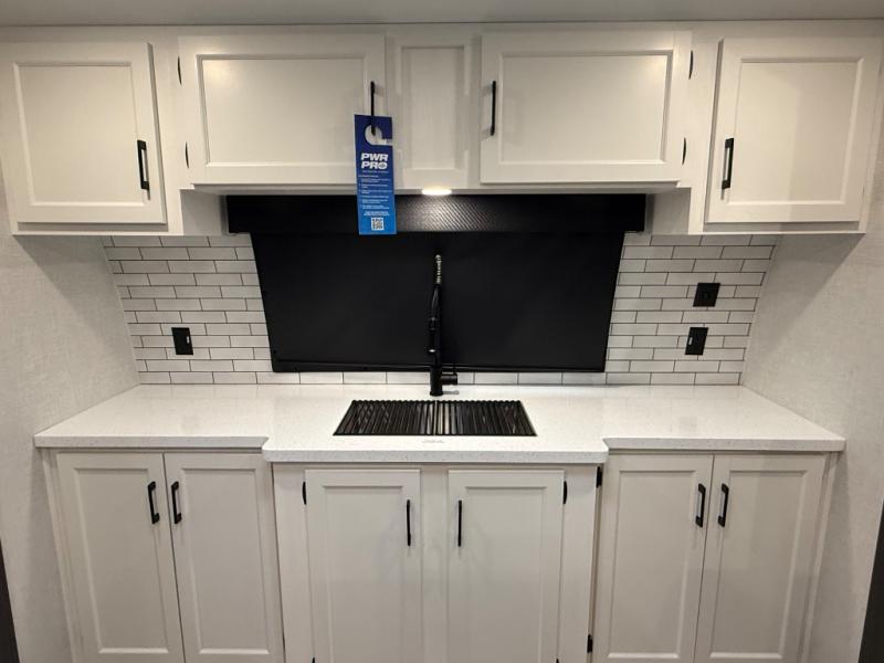 Comfort and convenience is what you will find all throughout this travel trailer! The front kitchen has a large single-bowl under-mount stainless steel sink with lots of countertop space on either side of it, a three burner cooktop, a 10 cu. ft. refrigerator to keep your perishables fresh, a pantry for your snacks, and a kitchen island to make meal prepping even easier. You can enjoy your meals at the table and chairs then relax on either the 64" sofa or theater seating with USB charging ports. You will feel right at home in the rear private bedroom with a 70" x 80" Sleep Tight king bed slide, a dresser with a 30" frameless fireplace, and a wardrobe that is prepped to add an optional washer and dryer, plus you even have an entrance/exit door to the unit with triple pull-out aluminum steps. There is an exterior campfire café with a refrigerator, a sink with countertop space, and a griddle for juicy burgers!