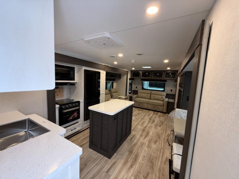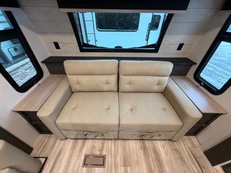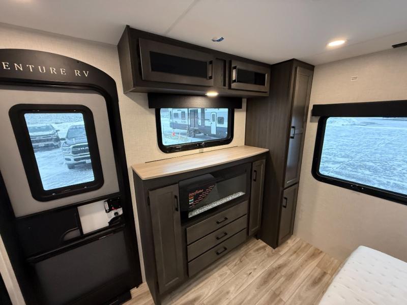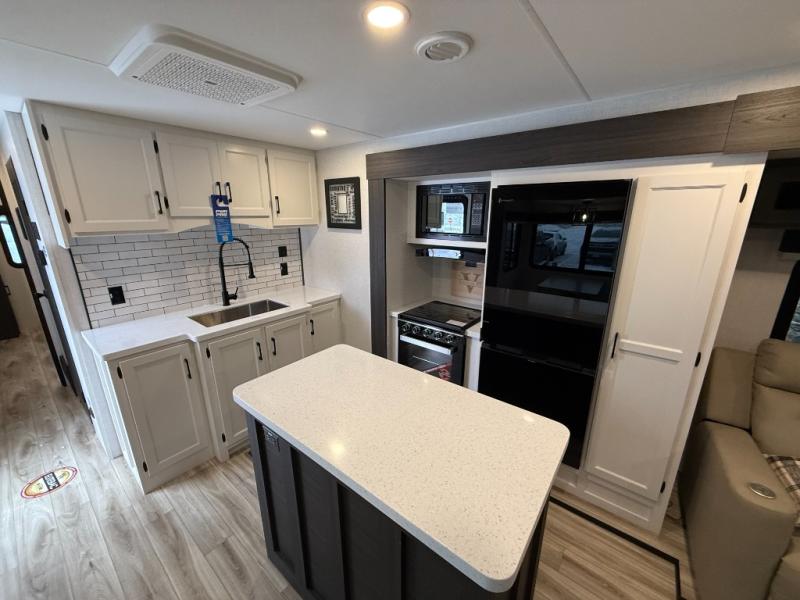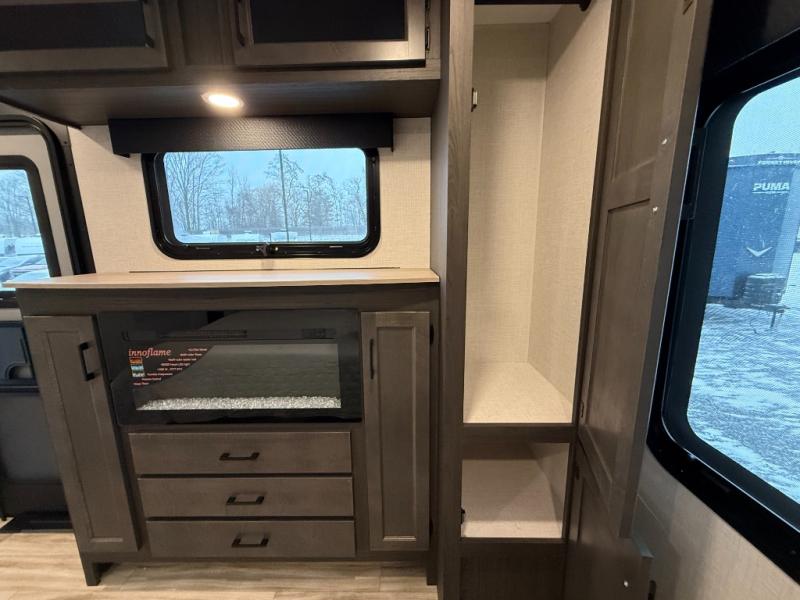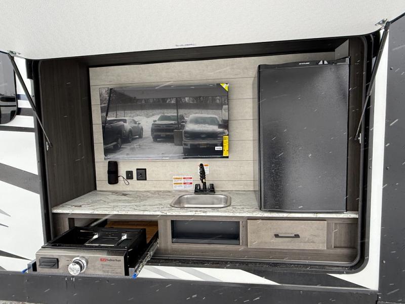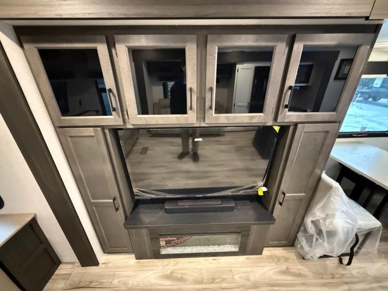 Come see all that this travel trailer has to offer! Relax in true comfort in the front living area with a 70" tri-fold sofa with end tables on either side or in the theater seating across from the entertainment center with a TV and 30" frameless fireplace. The kitchen island will make your meal prepping easier and you can enjoy them at the table and chairs then play a card game or two. You could even cook your meals at the exterior campfire café with a refrigerator, a sink with countertop space, and a griddle. The full bathroom has a 30" x 36" shower for you to freshen up in each morning. Enjoy a good night's rest each night on the 70" x 80" sleep tight king bed slide across from a dresser with a 30" frameless fireplace in the rear private bedroom, plus there is a wardrobe with washer and dryer prep and one of the dual entry doors with triple pull-out aluminum steps!