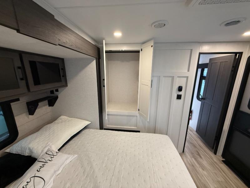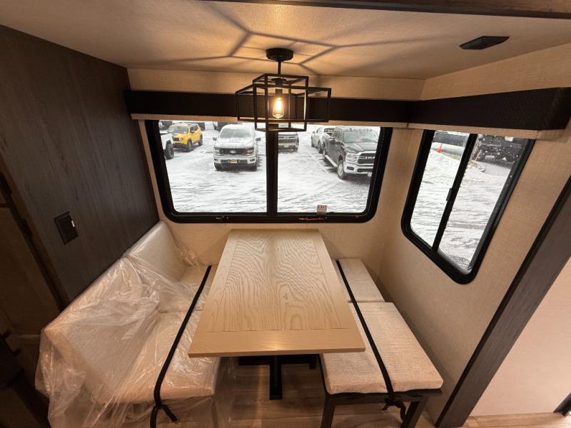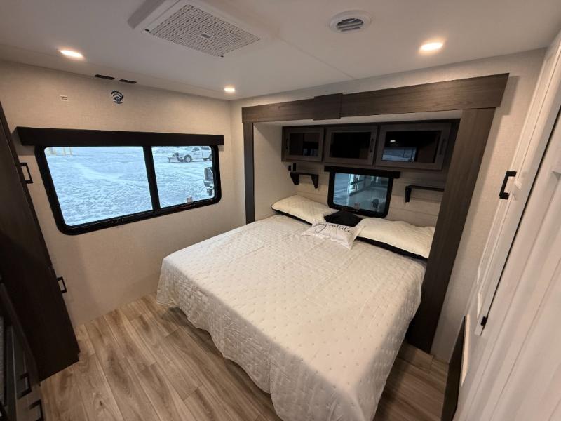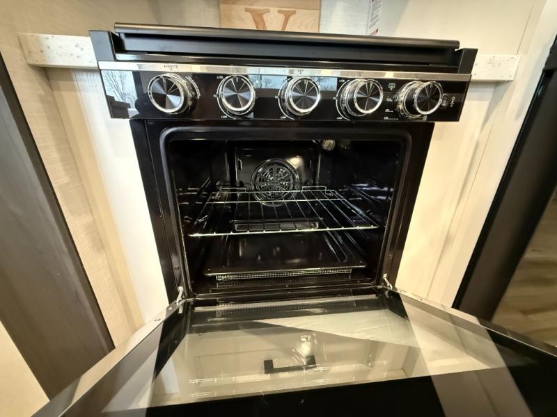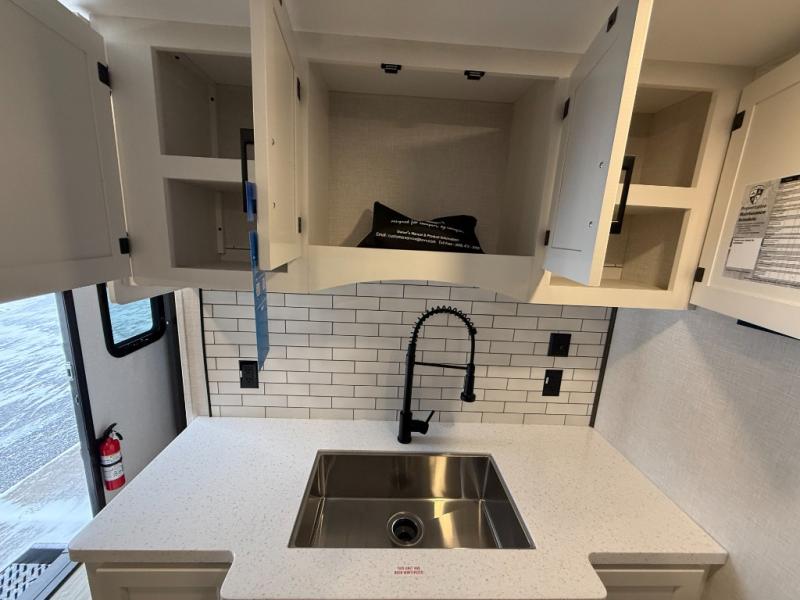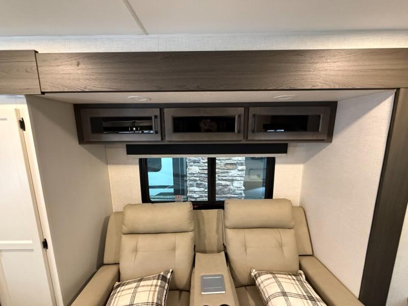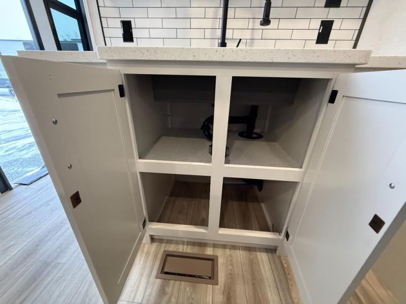Come see all that this travel trailer has to offer! Relax in true comfort in the front living area with a 70" tri-fold sofa with end tables on either side or in the theater seating across from the entertainment center with a TV and 30" frameless fireplace. The kitchen island will make your meal prepping easier and you can enjoy them at the table and chairs then play a card game or two. You could even cook your meals at the exterior campfire café with a refrigerator, a sink with countertop space, and a griddle. The full bathroom has a 30" x 36" shower for you to freshen up in each morning. Enjoy a good night's rest each night on the 70" x 80" sleep tight king bed slide across from a dresser with a 30" frameless fireplace in the rear private bedroom, plus there is a wardrobe with washer and dryer prep and one of the dual entry doors with triple pull-out aluminum steps!