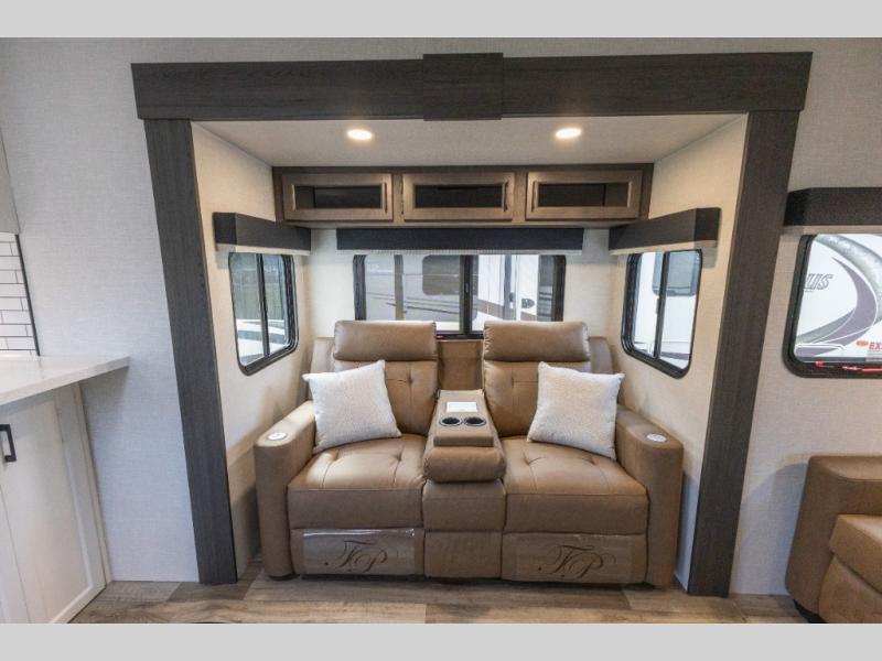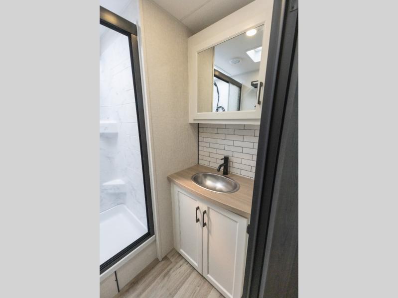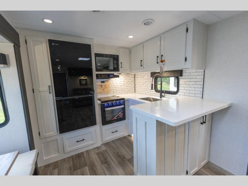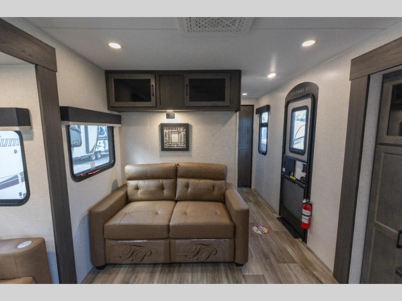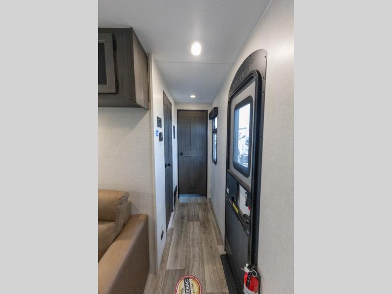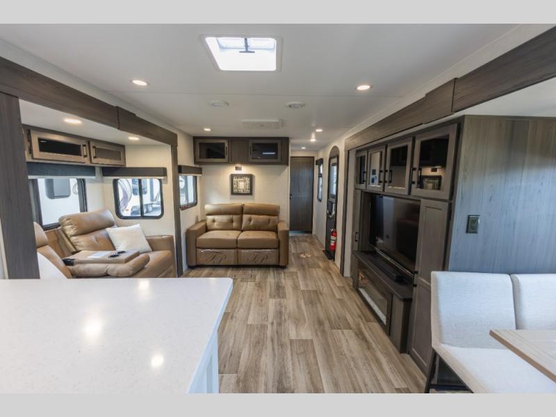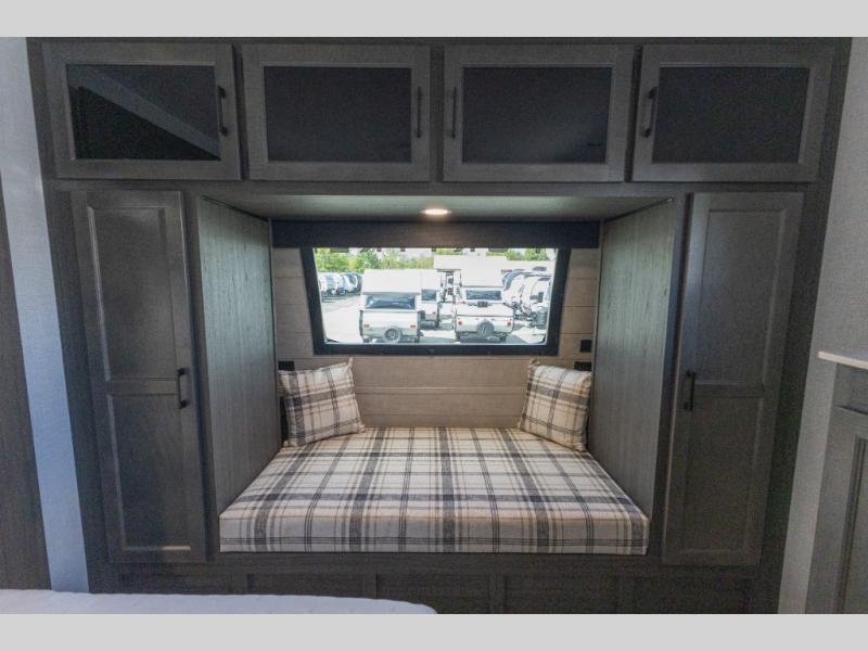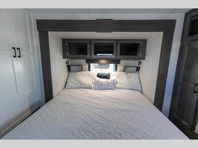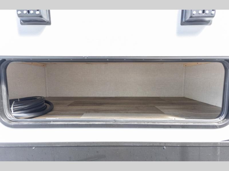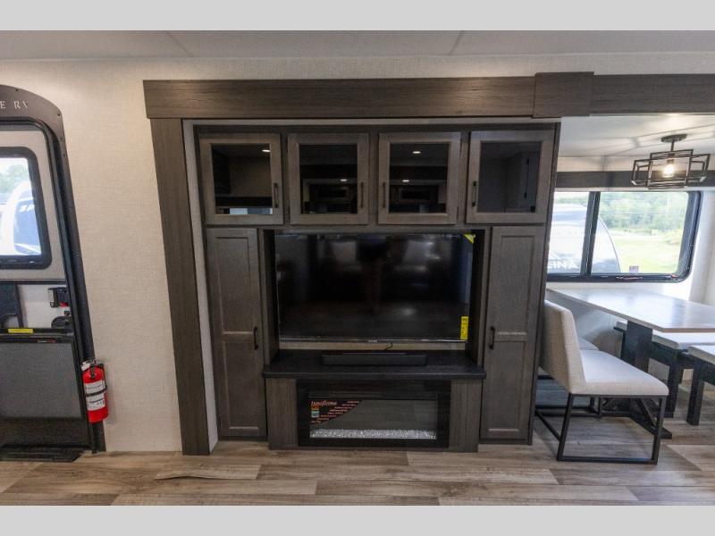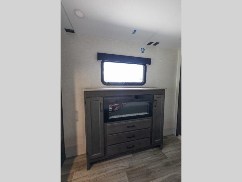 The chef will feel right at home cooking in the rear kitchen with all of the countertop space in this travel trailer! They can even head outside to breathe in some fresh air while cooking at the exterior campfire café with a refrigerator, a sink with countertop space, and a griddle. Relax each night in the middle living area with the 64" sofa and the slide that has theater seating with USB charging across from the entertainment center with a TV and 30" frameless fireplace. When you're ready to wind down your nights, take a hot shower in the full bathroom with the 30" x 36" shower then head to the front private bedroom and either read a book at the window seat or lay in the 70" x 80" sleep tight king bed slide while watching a movie with the TV or watch the 30" frameless fireplace!