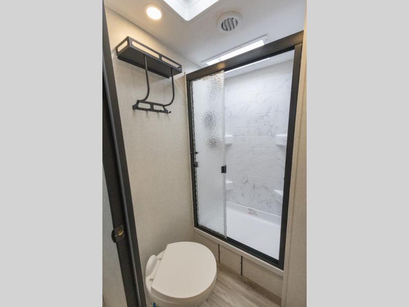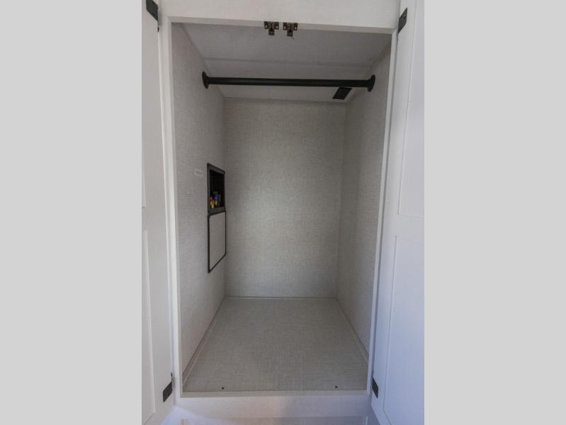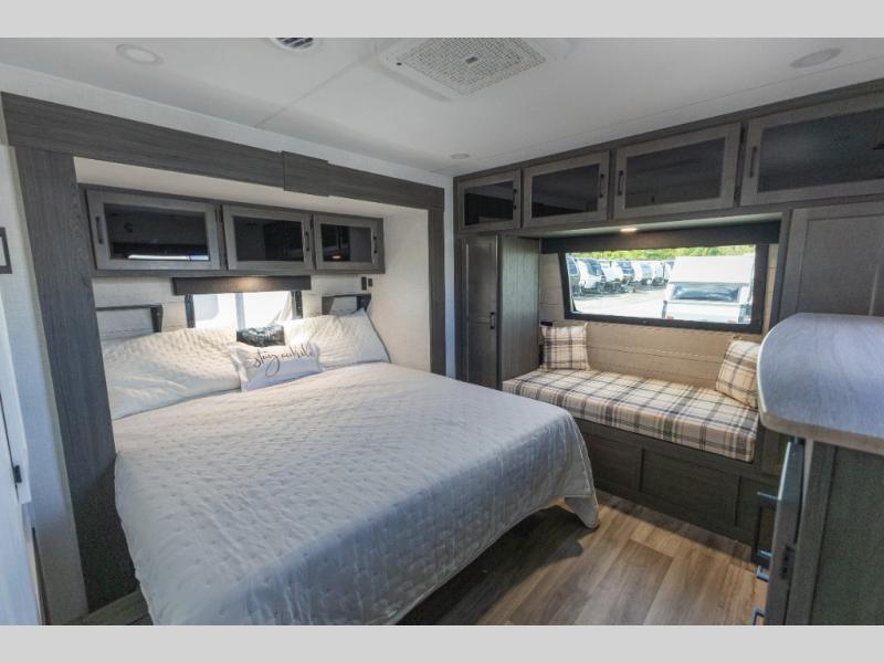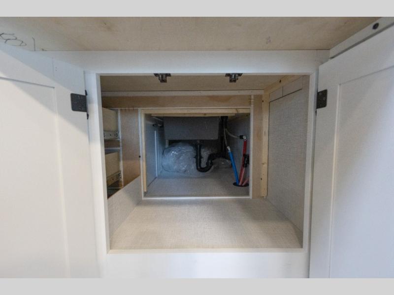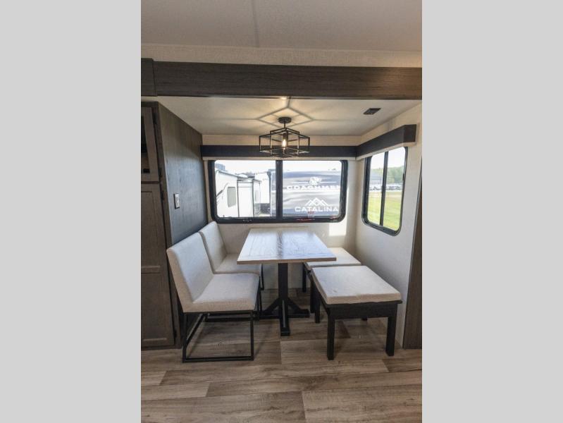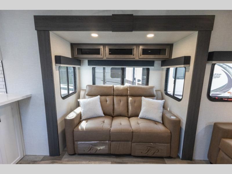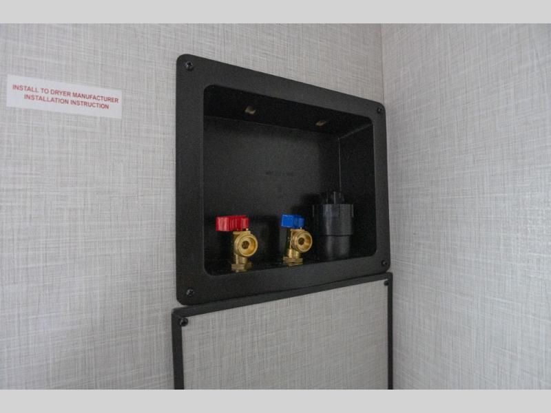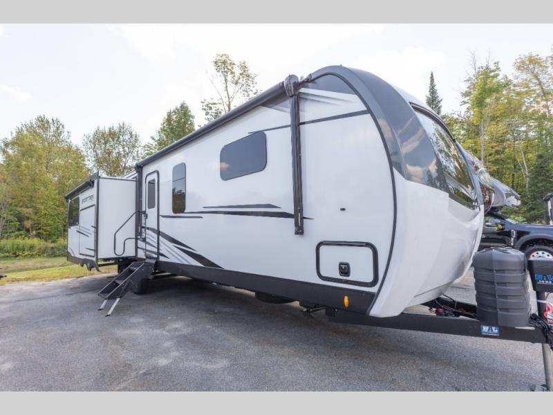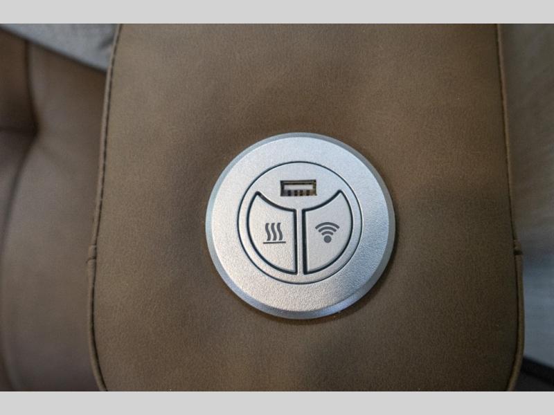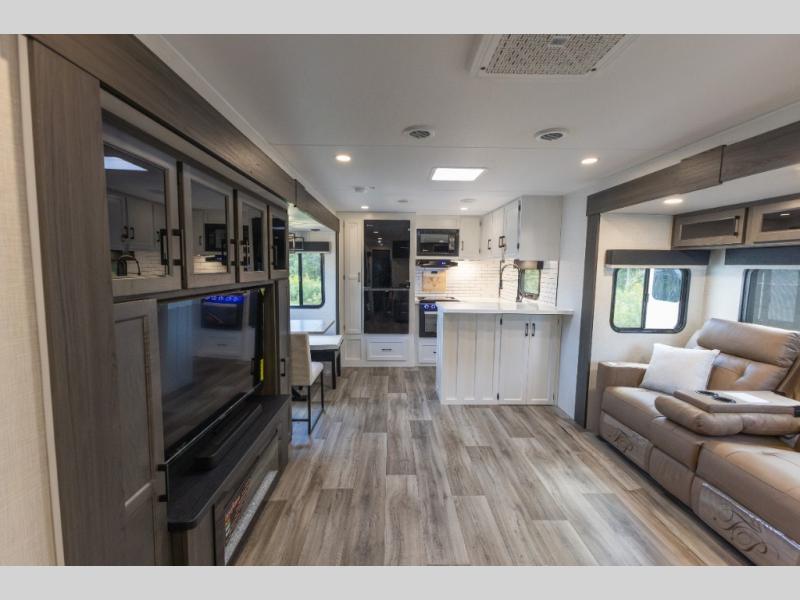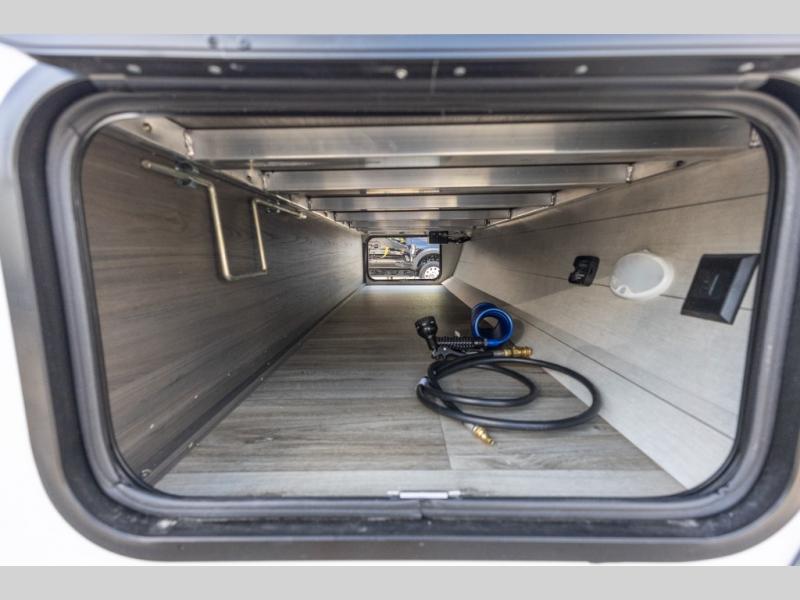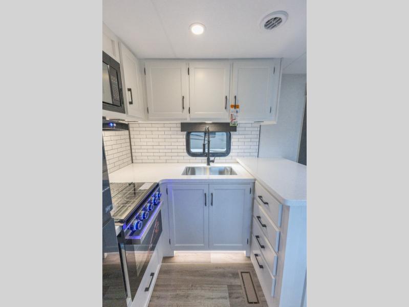 The chef will feel right at home cooking in the rear kitchen with all of the countertop space in this travel trailer! They can even head outside to breathe in some fresh air while cooking at the exterior campfire café with a refrigerator, a sink with countertop space, and a griddle. Relax each night in the middle living area with the 64" sofa and the slide that has theater seating with USB charging across from the entertainment center with a TV and 30" frameless fireplace. When you're ready to wind down your nights, take a hot shower in the full bathroom with the 30" x 36" shower then head to the front private bedroom and either read a book at the window seat or lay in the 70" x 80" sleep tight king bed slide while watching a movie with the TV or watch the 30" frameless fireplace!
