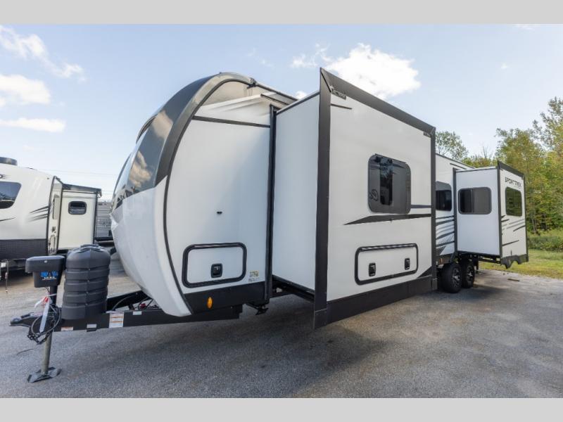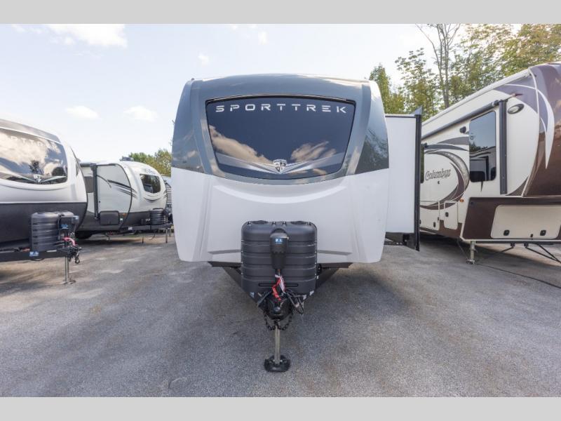 An elegant design and new features come with every one of these Venture RV SportTrek Touring Edition travel trailers! The NXG Huck bolt frame holds these units together and a walkable roof covers them. Heads will turn down the highway and at the campsite with an upgraded graphics package and a painted fiberglass front cap with integrated LED light. The exterior pass-through storage area has slam latch baggage doors with magnetic catches so you don't have to worry about them closing on you and a motion activated light to see your items clearly even at night. Luxury abounds throughout these units, especially with the mandatory Interior Luxury package which comes with solid surface kitchen countertops, designer valances with fabric nightshades, two 30" frameless fireplaces, and Beauflor wood plank flooring that is easy to clean. Come find your favorite model today!