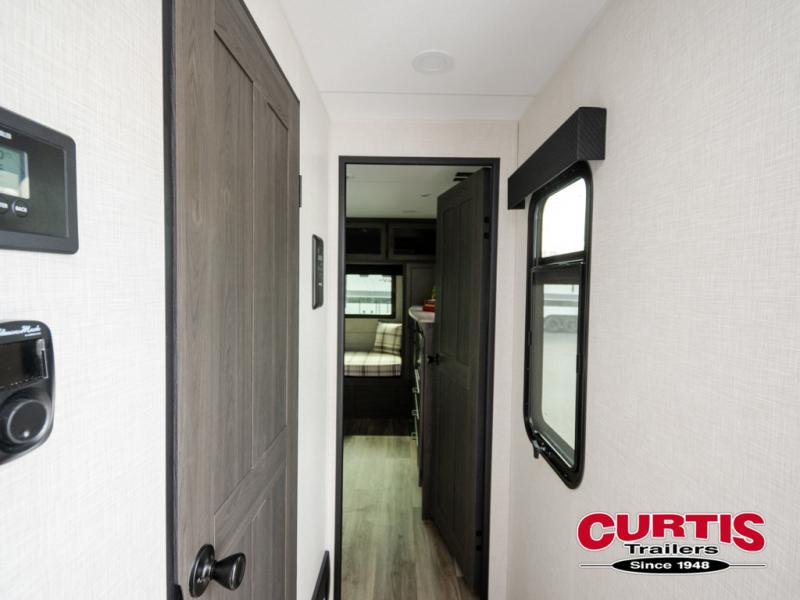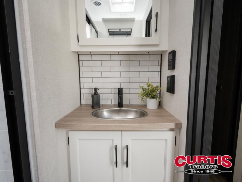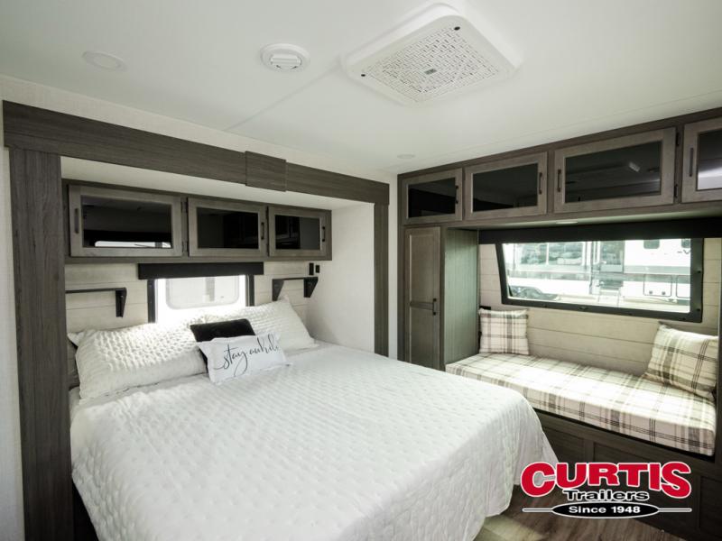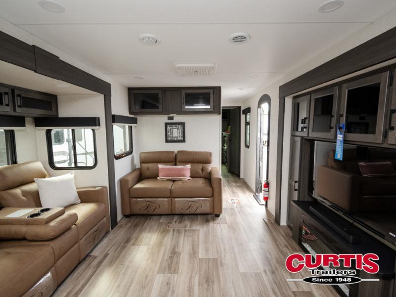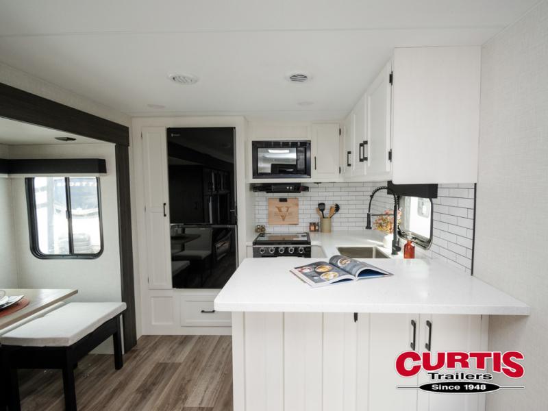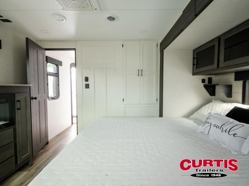 The chef will feel right at home cooking in the rear kitchen with all of the countertop space in this travel trailer! They can even head outside to breathe in some fresh air while cooking at the exterior campfire café with a refrigerator, a sink with countertop space, and a griddle. Relax each night in the middle living area with the 64" sofa and the slide that has theater seating with USB charging across from the entertainment center with a TV and 30" frameless fireplace. When you're ready to wind down your nights, take a hot shower in the full bathroom with the 30" x 36" shower then head to the front private bedroom and either read a book at the window seat or lay in the 70" x 80" sleep tight king bed slide while watching a movie with the TV or watch the 30" frameless fireplace!