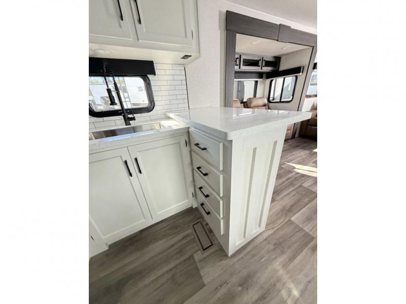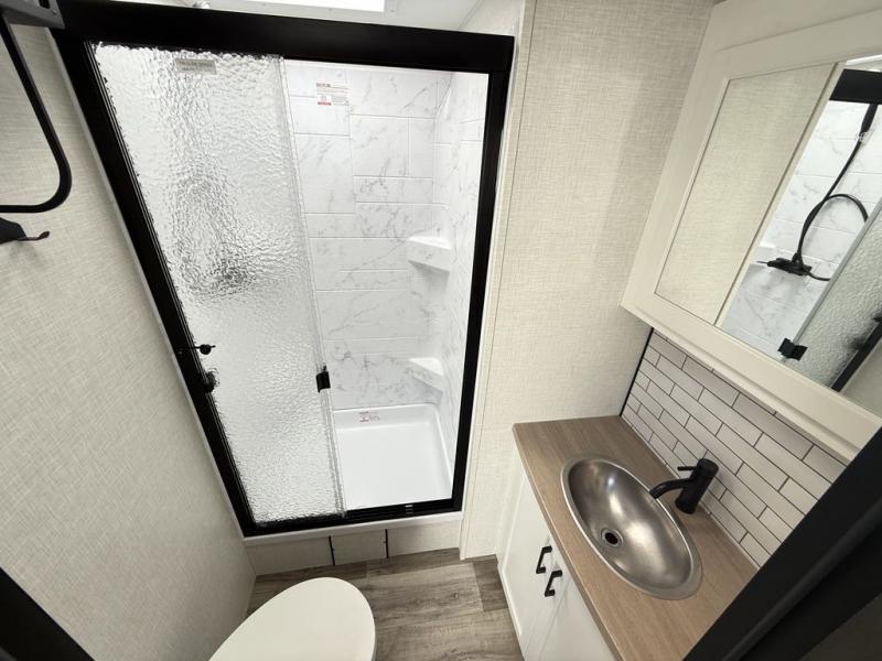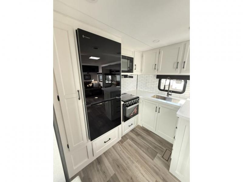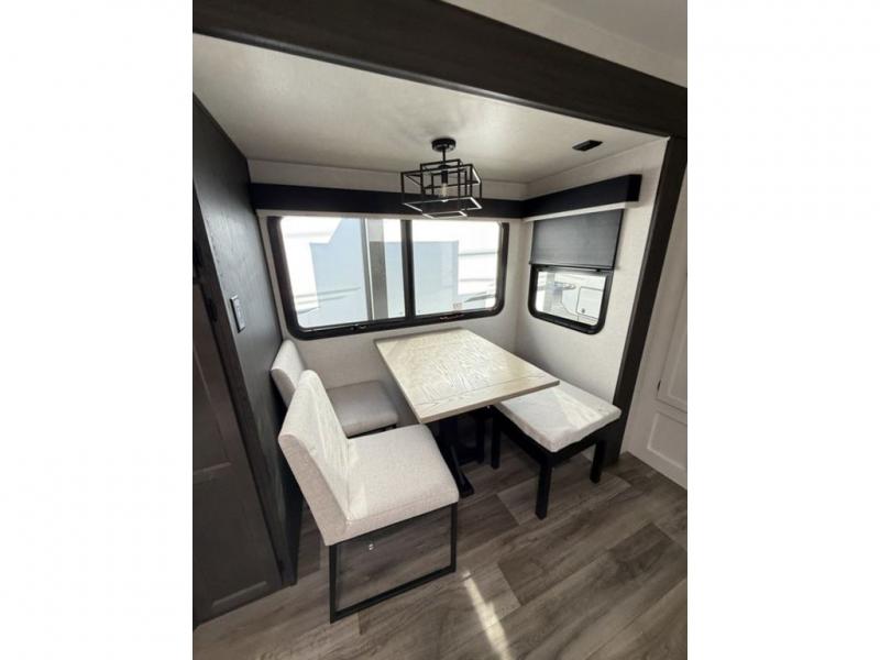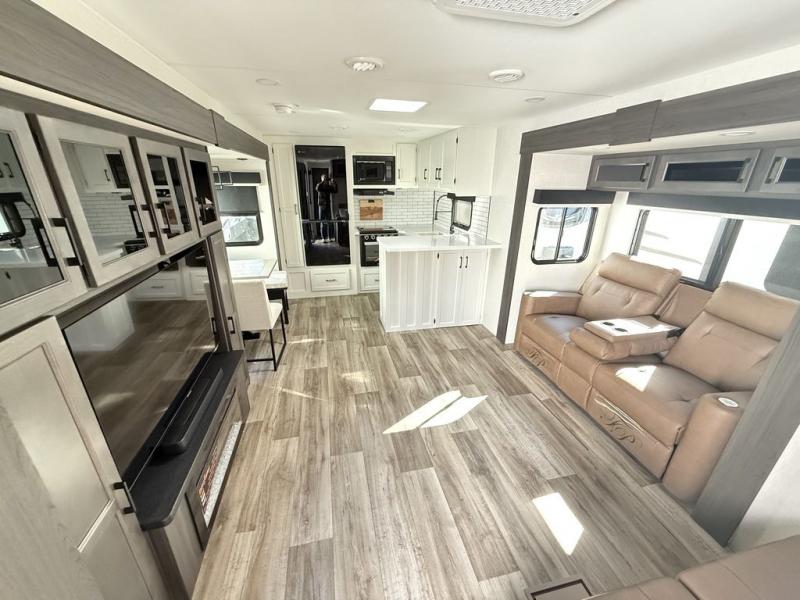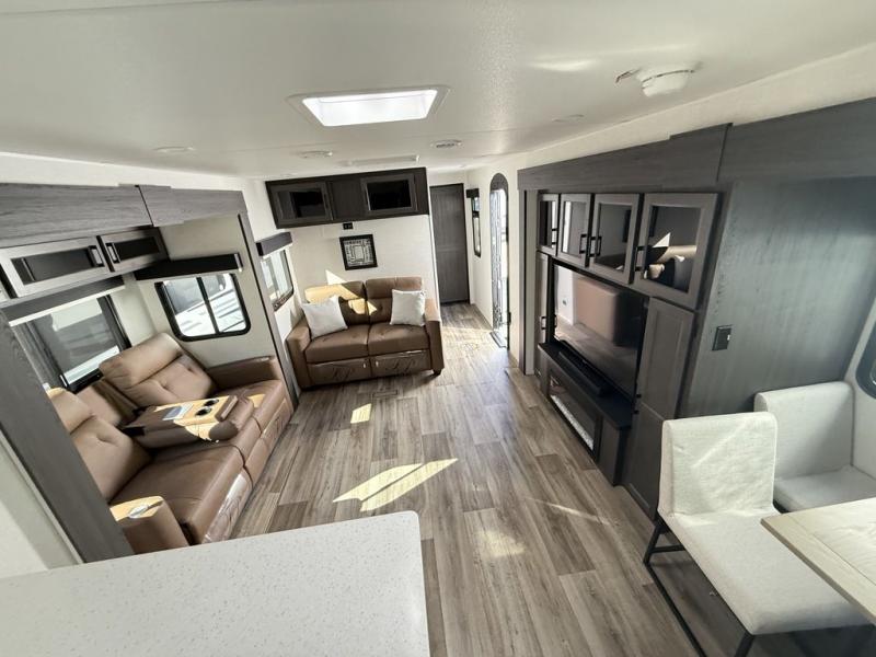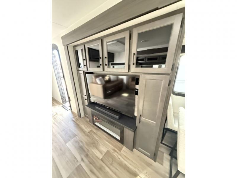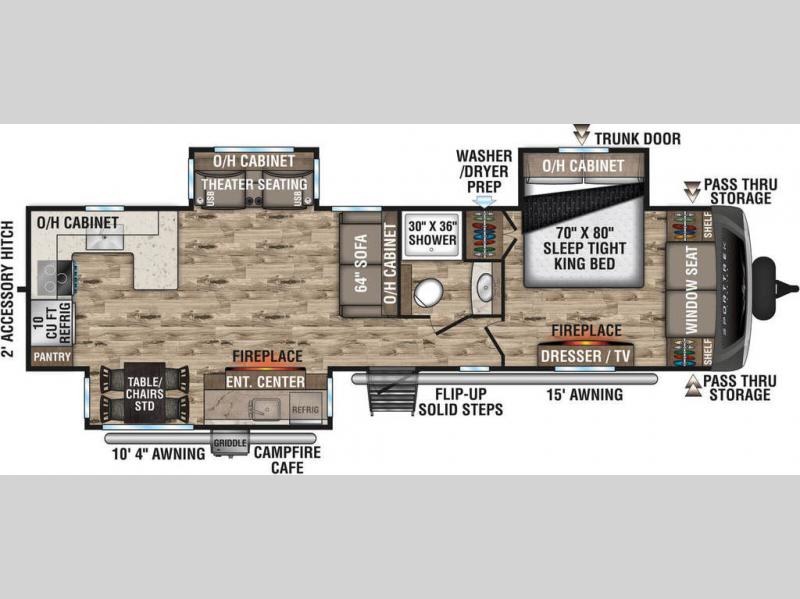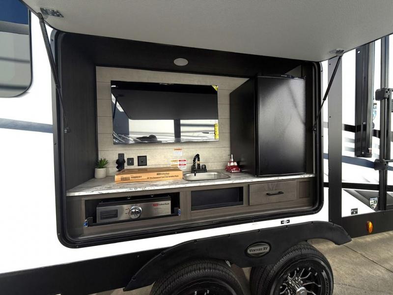 The chef will feel right at home cooking in the rear kitchen with all of the countertop space in this travel trailer! They can even head outside to breathe in some fresh air while cooking at the exterior campfire café with a refrigerator, a sink with countertop space, and a griddle. Relax each night in the middle living area with the 64" sofa and the slide that has theater seating with USB charging across from the entertainment center with a TV and 30" frameless fireplace. When you're ready to wind down your nights, take a hot shower in the full bathroom with the 30" x 36" shower then head to the front private bedroom and either read a book at the window seat or lay in the 70" x 80" sleep tight king bed slide while watching a movie with the TV or watch the 30" frameless fireplace!