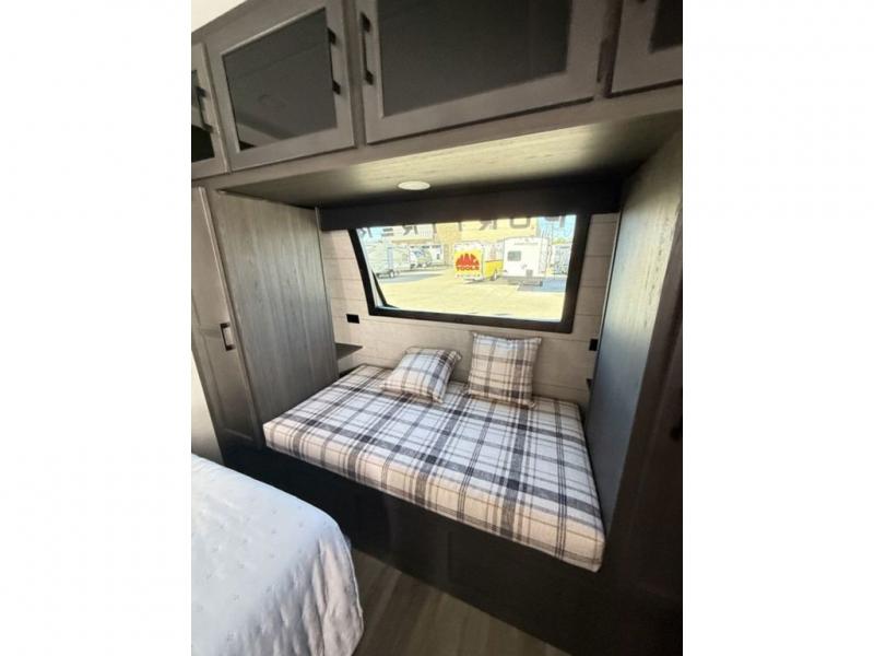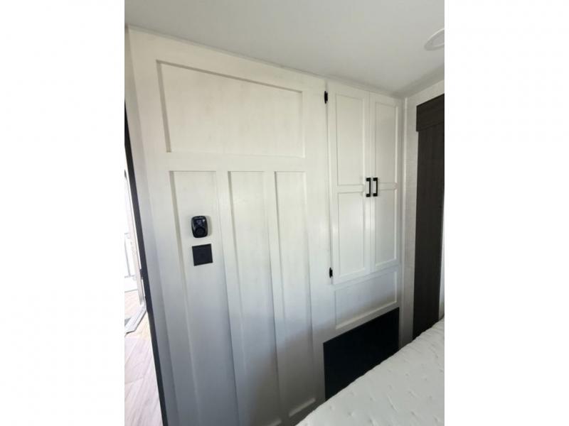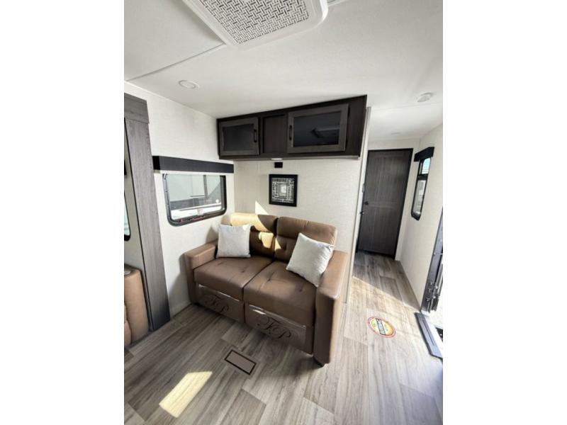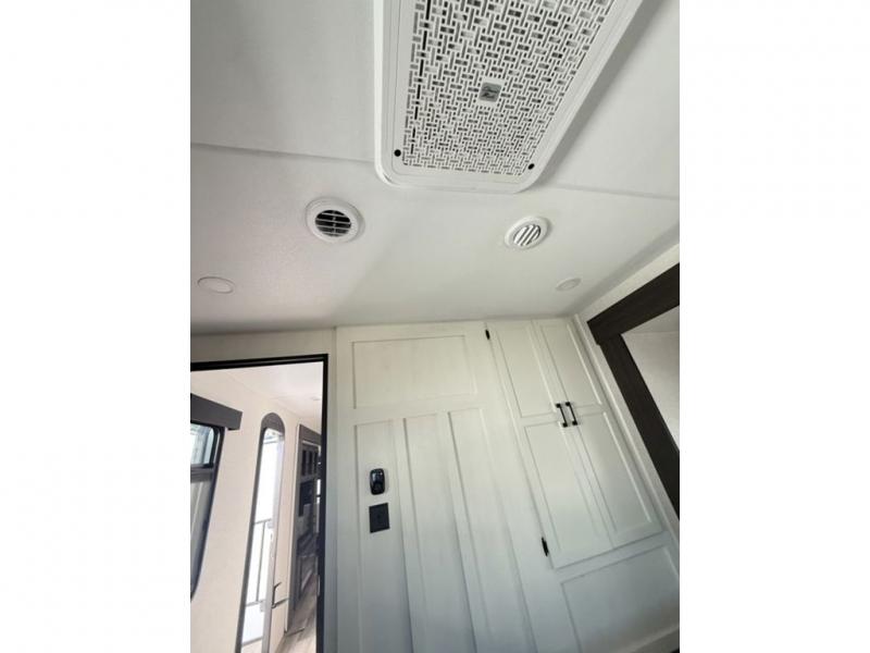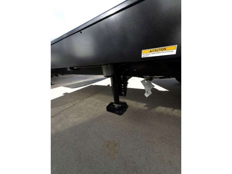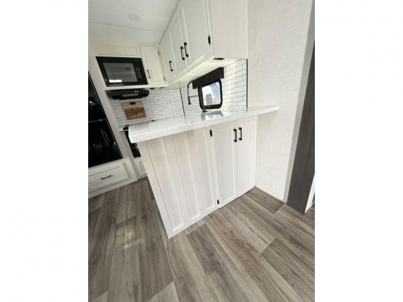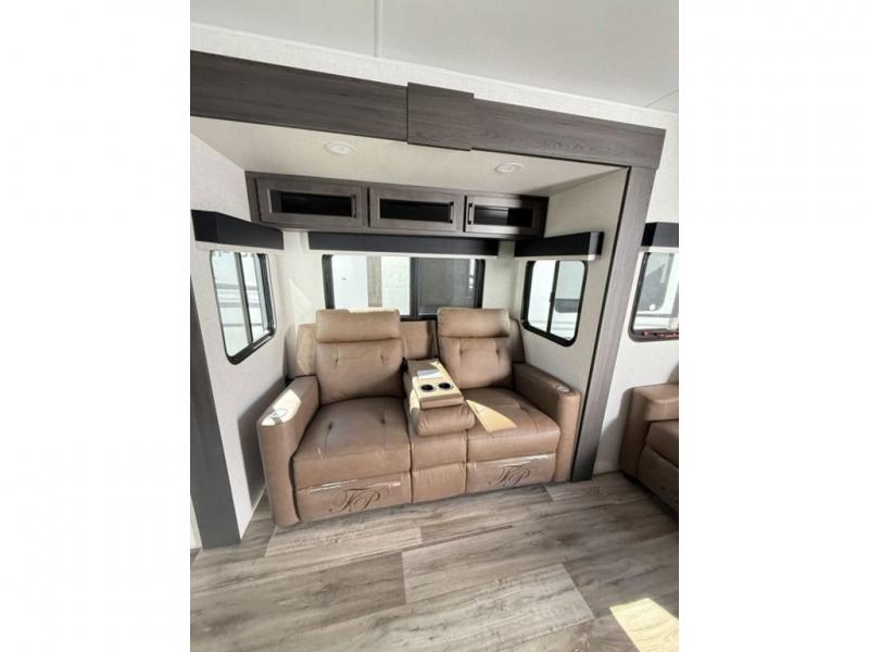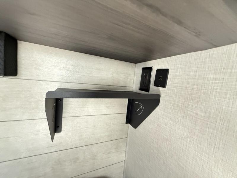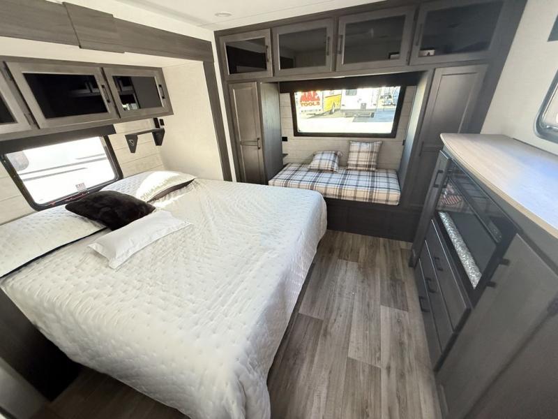 The chef will feel right at home cooking in the rear kitchen with all of the countertop space in this travel trailer! They can even head outside to breathe in some fresh air while cooking at the exterior campfire café with a refrigerator, a sink with countertop space, and a griddle. Relax each night in the middle living area with the 64" sofa and the slide that has theater seating with USB charging across from the entertainment center with a TV and 30" frameless fireplace. When you're ready to wind down your nights, take a hot shower in the full bathroom with the 30" x 36" shower then head to the front private bedroom and either read a book at the window seat or lay in the 70" x 80" sleep tight king bed slide while watching a movie with the TV or watch the 30" frameless fireplace!